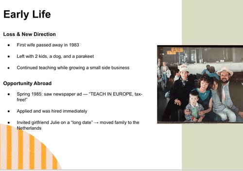In 1983 my first wife passed away and I was left with two kids, a dog, a parakeet and not much of a plan for the future. I was still teaching and the small business that I had on the side continued to grow. I bought a house that would accommodate both my business and my family and life seemed to calm down for me. But, in the spring of 1985, for no reason at all, I happened to open the "help wanted" section of the newspaper. An advertisement popped out which read: "TEACH IN EUROPE tax-free! Apply today!" So I applied for the job and was hired on the spot. I called my girlfriend, Julie and asked her if she would like go on a long "date" with me. We moved our collective family to the Netherlands. When I arrived, I had an intake interview with the superintendent. He asked me how things were and if the kids were settling in well. I told him everything was great. In fact, I brought my girlfriend and her three year-old son. He looked at me incredulously and said you can’t do that. This is Europe! There are rules! You have to have a visa to stay here. You have to have insurance. It’s absolutely against the rule. She’s going to have to go back. I told him that Julie’s uncle was George Hoffmeier who worked with him for 20 years and is the superintendent in the American School in Germany. He looked at me and said, oh shit, I have to get her a job blowing a whistle on the playground.