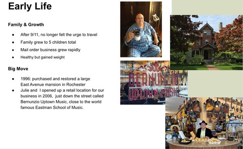 After September 11th, I didn’t seem to want to travel anymore. We now had two more children (making a total of five). The mail order business that I started grew exponentially. In 1996 we moved into and undertook the restoration of a very big mansion on East Avenue in Rochester. It was an incredible house of almost 7000 ft.² ….but it had been turned into five apartments and we converted back to a single-family home. We stripped woodwork, we sanded floors, we took down ugly old wallpaper, we remodeled the kitchen and we made it an incredible home for our family and our business thrived in the basement. Unfortunately, I kind of grew into it. I blew up to a hefty 300 pounds although I was healthy as a horse, I was beginning to look like a Clydesdale. Julie and I opened up a retail location for our business in 2006. It was located just down j the street from our house, close to the world famous Eastman School of Music. We called it Bernunzio Uptown Music.