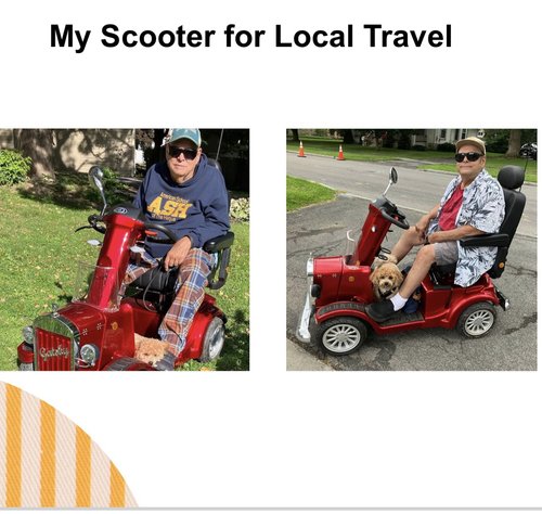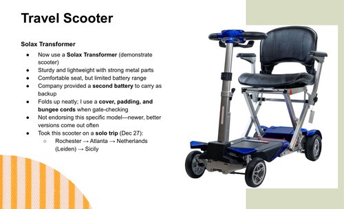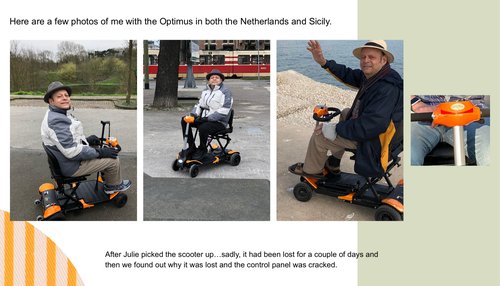 Immediately upon returning to the United States, I started investigating all the different types of mobility devices that were available. I settled upon a bright orange Optimus, which had a range of about 14 miles on a charge. At 55 pounds, it was light enough to be able to lift and put in the back of a car after it folded up with the press of a button. The Optimus was my newfound ticket to travel. Most importantly, Julie covered all the bases for the airlines to be alerted that I was going to have such a device and needed additional help. Truthfully, going through the airport is so much easier with the mobility device because you always get "scooted" to the front of the line and you can ride the scooter all the way up onto the airplane jet bridge and then take the battery out, fold it up, and hopefully get it back when you land. One bit of caution, do not use a mobility scooter on the automatic walking devices found in the airport. I made that mistake and ended up doing a wheelie and almost lost everything. Stay off of them!