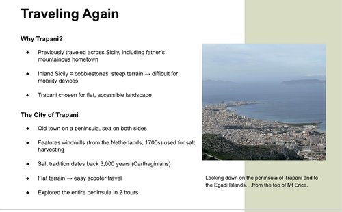 Now I had traveled to Sicily many times and had covered most of the island, including the area where my father was from, which was the center of the most part of the island. There it is very mountainous, and the buildings and roads are made of cobblestone. That makes for an extremely uncomfortable and a difficult ride using a mobility device . So I picked a destination that suited me. Trapani is an old town and is a peninsula, so it has the sea on both sides and has something that is very similar to the Netherlands….it is completely FLAT! In fact, they have windmills that were imported from the Netherlands in the 1700s. They are used to evaporate the water for harvesting salt from the sea. They’ve done it for 3000 years since the time of the Carthaginians. So it is an absolutely flat terrain, no hills, few bumps, but basically easy to get around on a scooter. In fact, I was able to go around the entire peninsula in a matter of two hours.