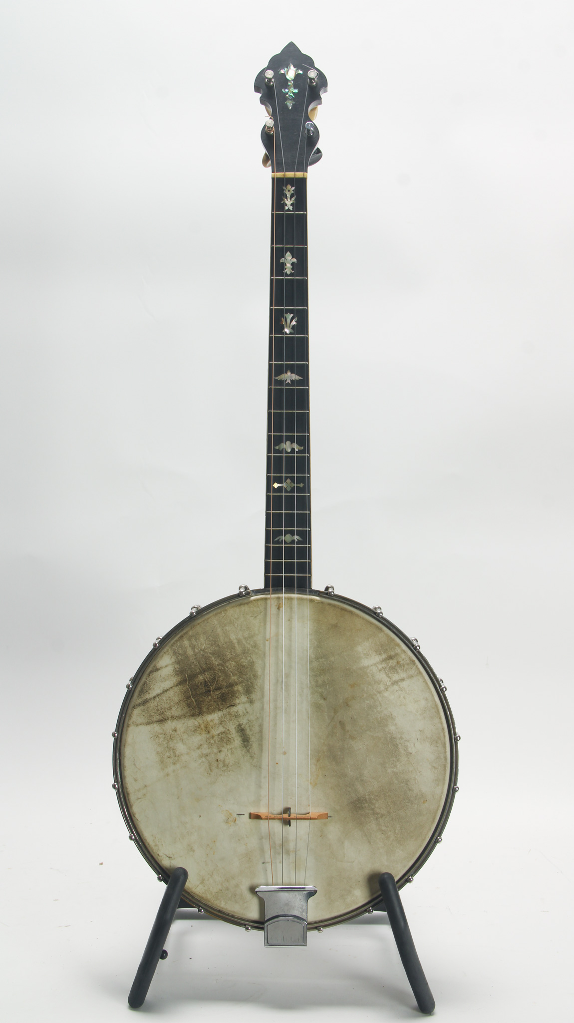 From the early 20th century, a nice playing Washburn Style 445 (as stamped on the heel cap), featuring its original hard shell case. The 10-3/4 diameter mahogany rim assembly is 5/8" thick, is...