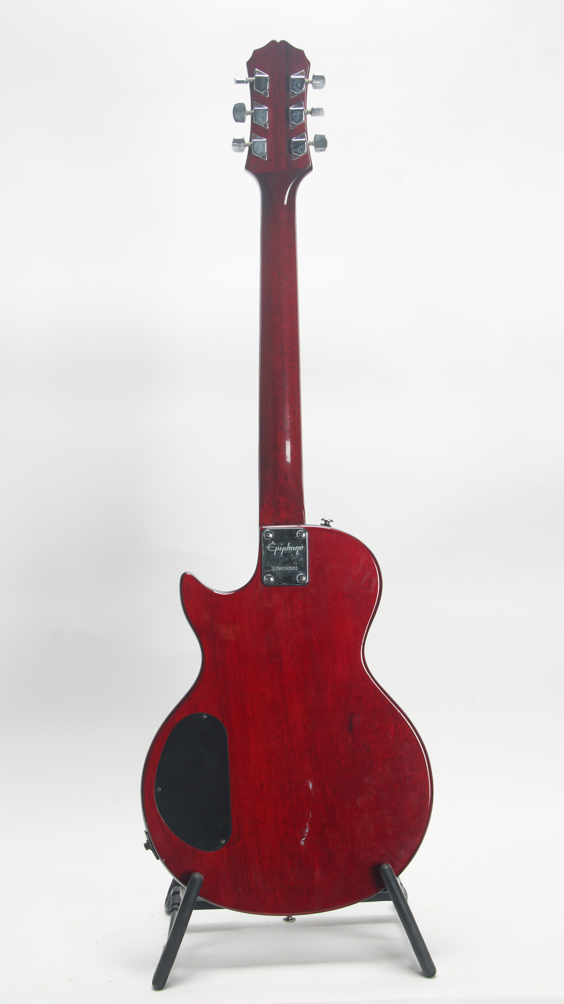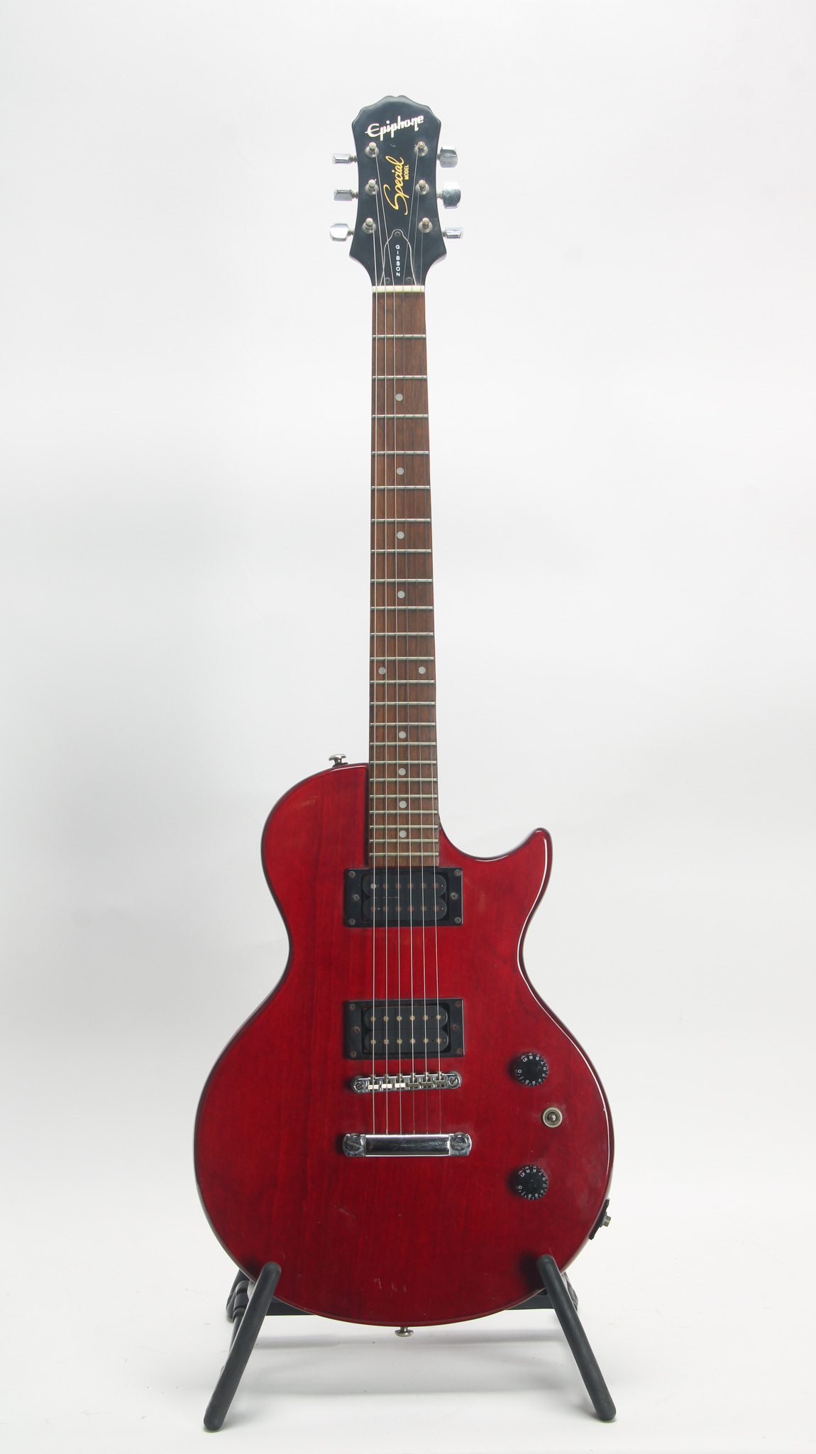 Epiphone Les Paul Special in cherry finish. Features a bolt on maple neck with rosewood fingerboard, two humbuckers adn three way switch. One master volume and tone knob. Toggle button is missing...