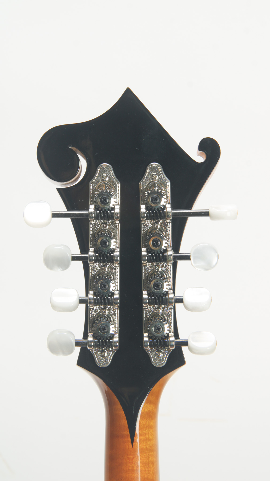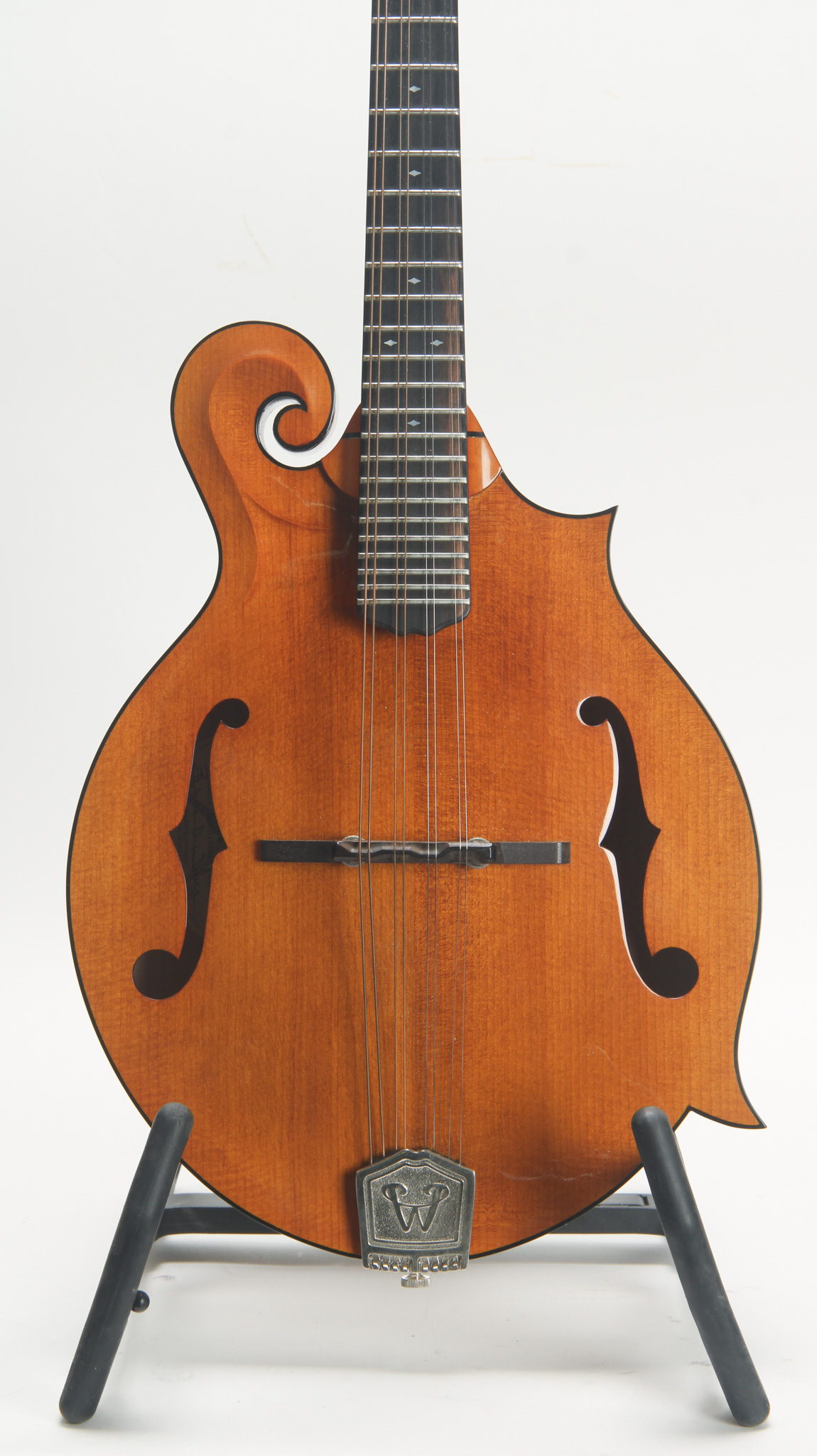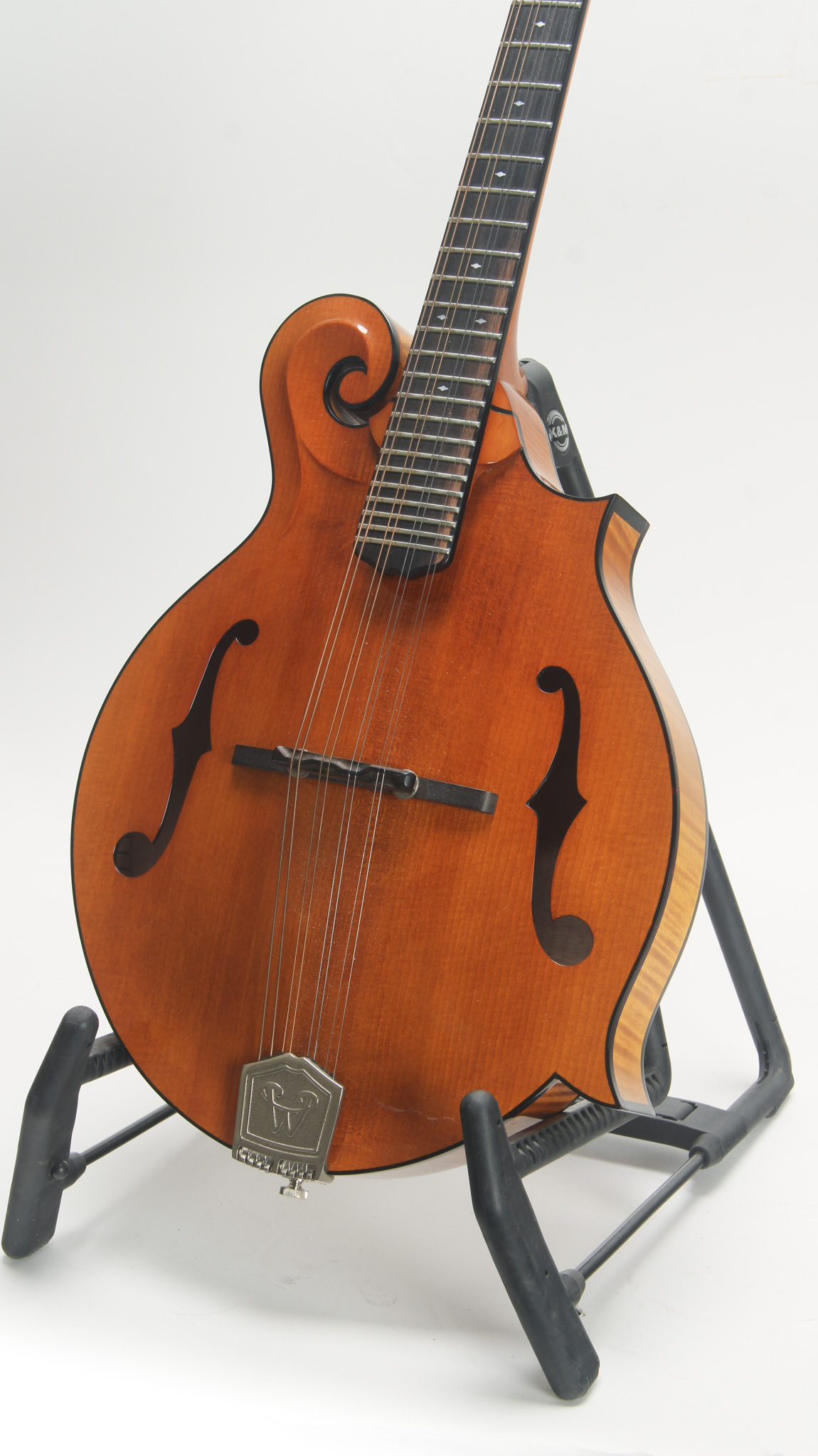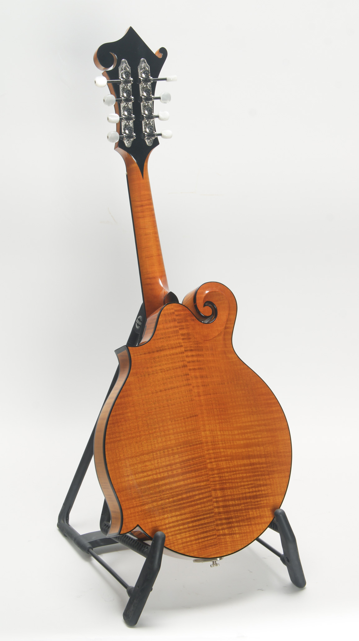 Blonde and gold! Hard to look away from this classy intermediate F style mandolin, featuring blonde finish, attractive inlay, solid construction, with woody tone. The f style body is fully bound with...
