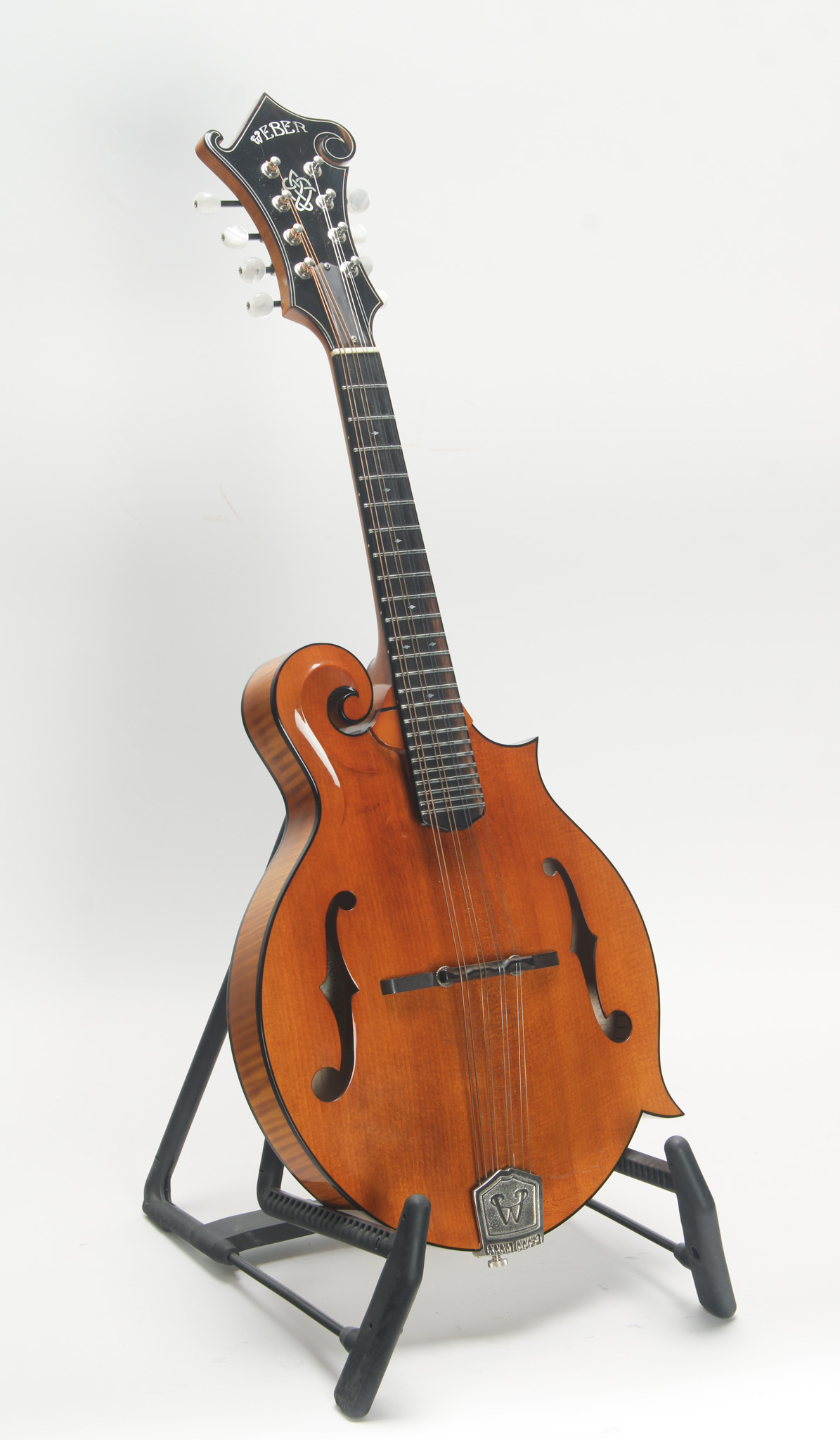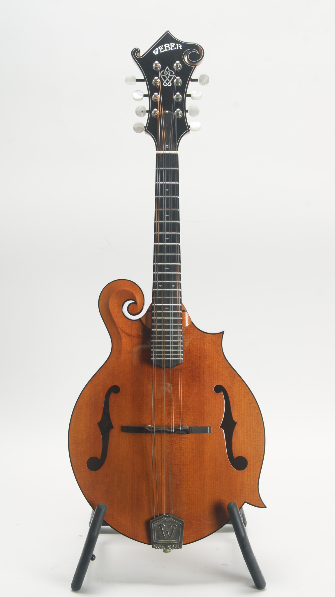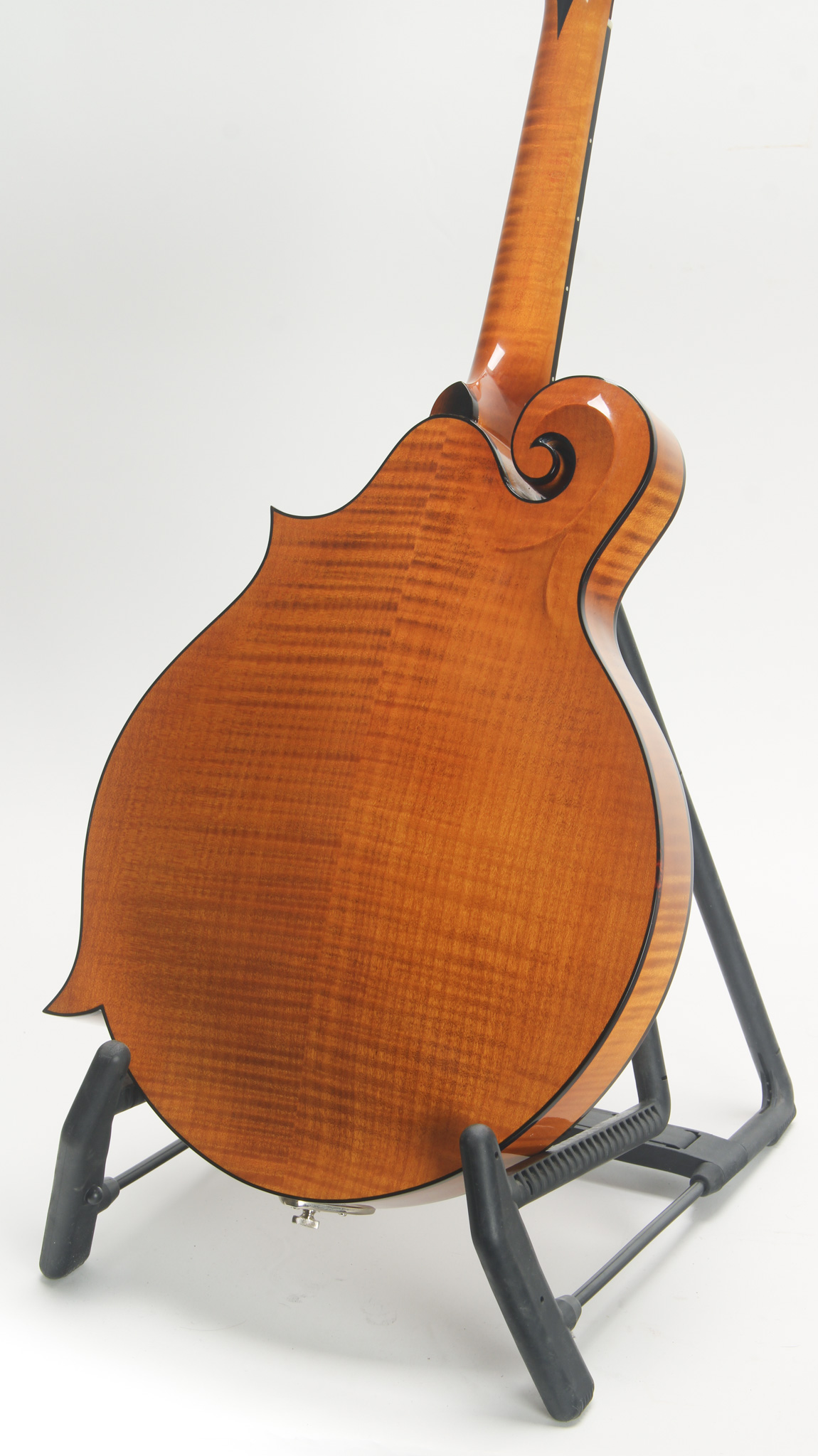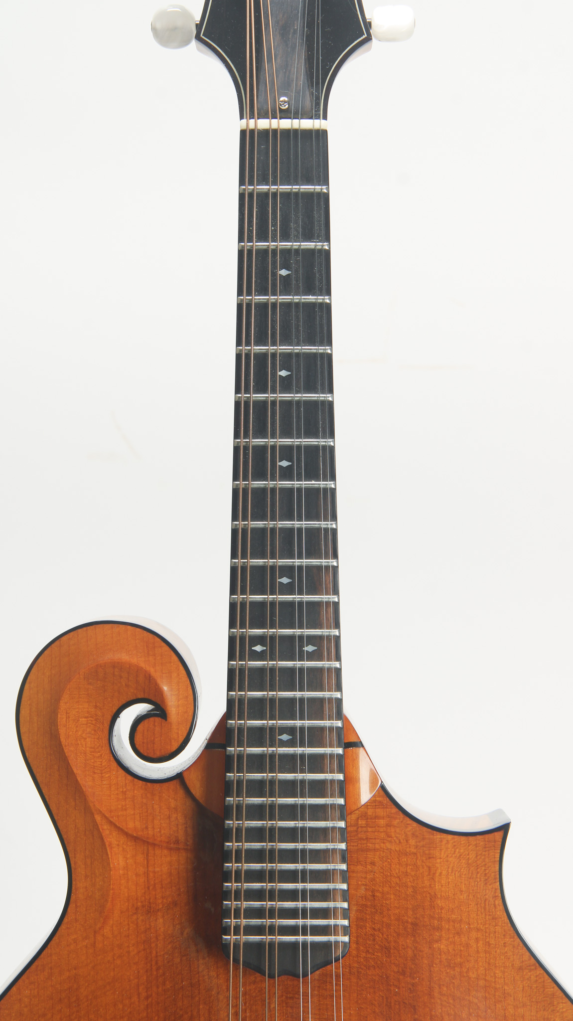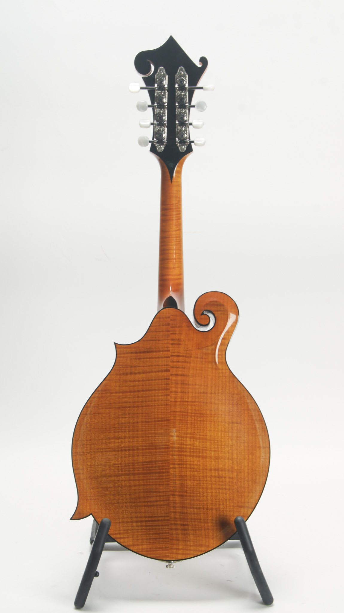 Blonde and gold! Hard to look away from this classy intermediate F style mandolin, featuring blonde finish, attractive inlay, solid construction, with woody tone. The f style body is fully bound with...