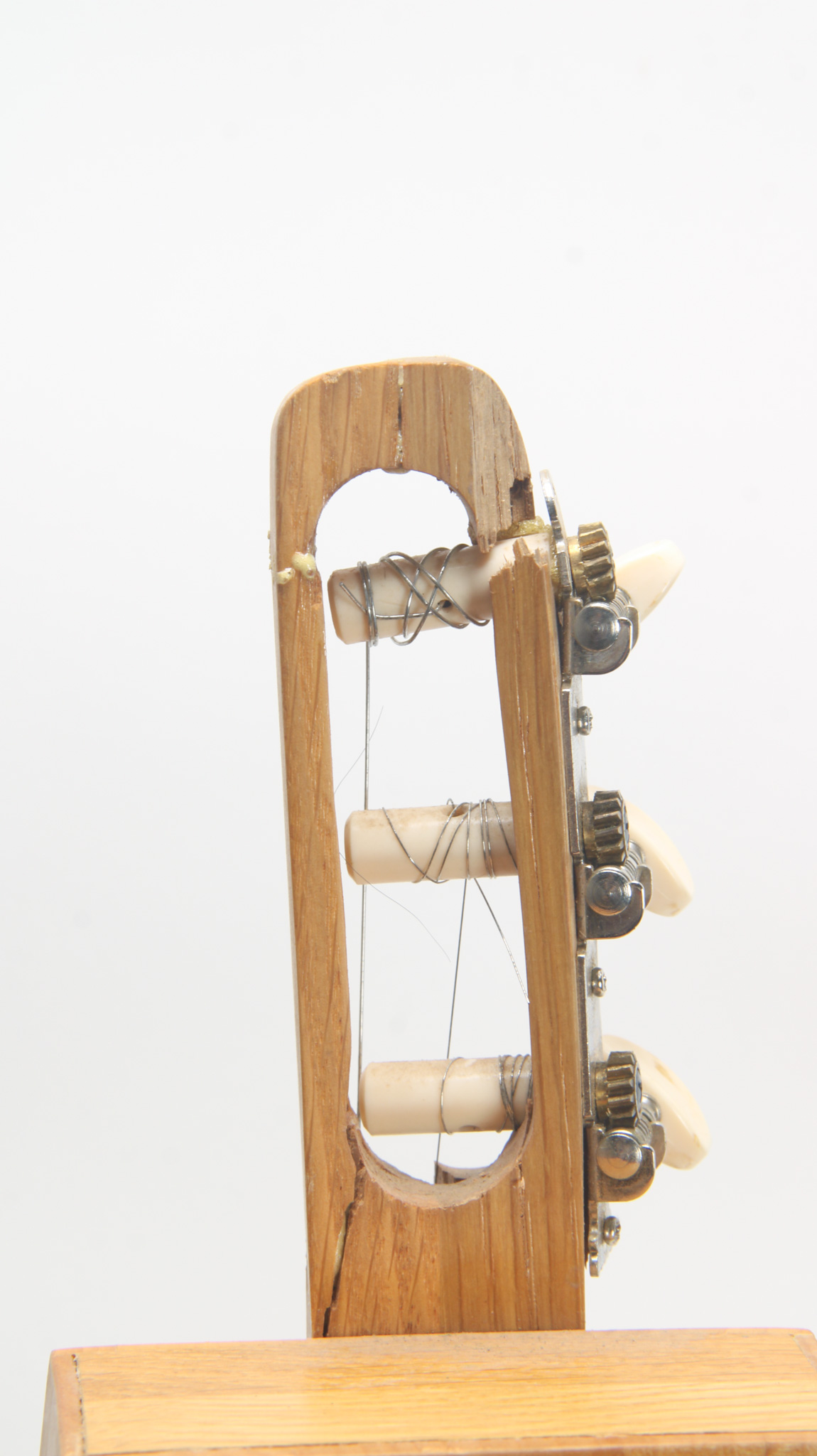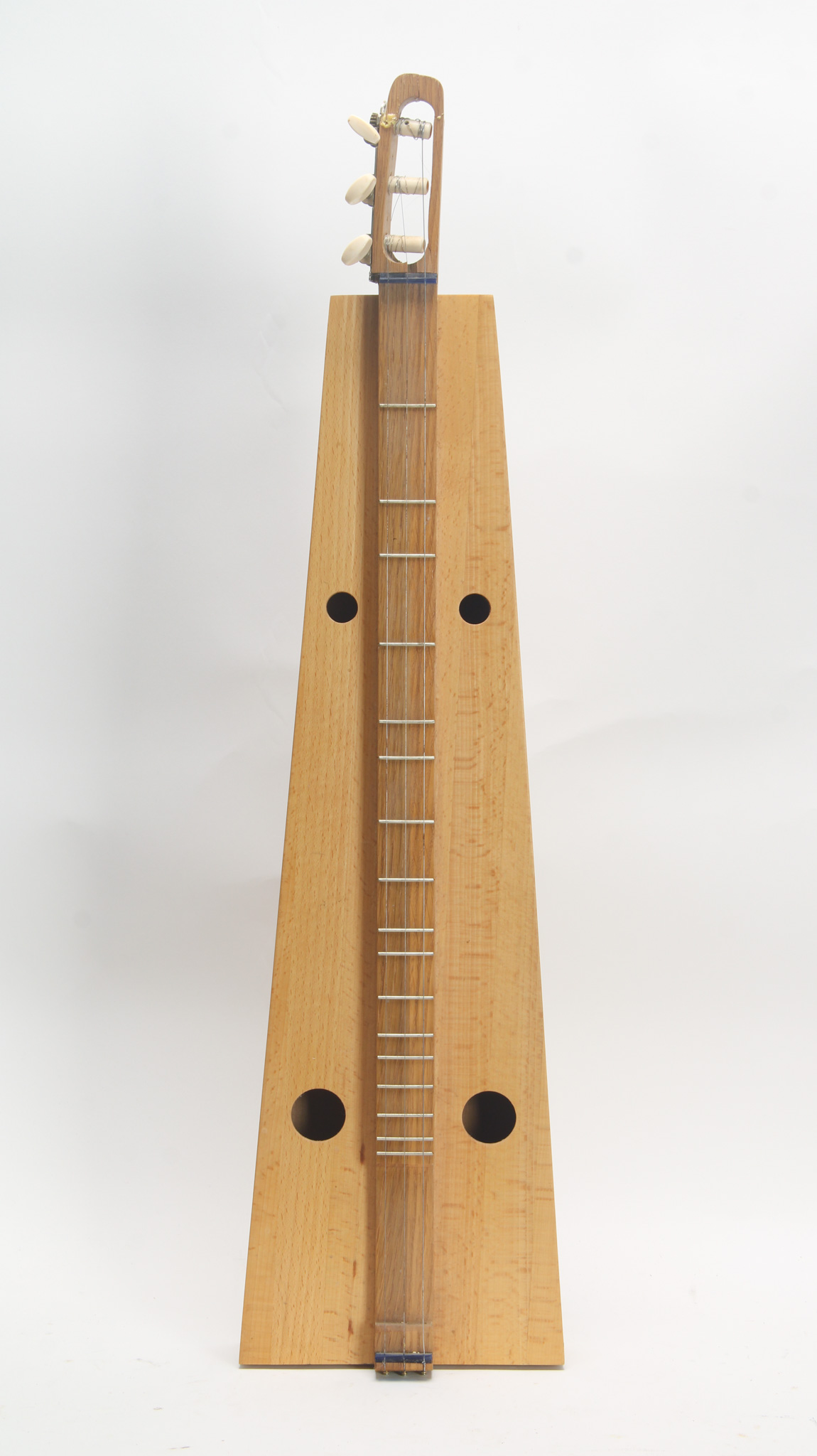 Unmarked and AS/IS mountain dulcimer built using multiple pieces of lightly stained hardwood, with a solid walnut neck; small three string slotted peghead has split and would need to be repaired. 4x...