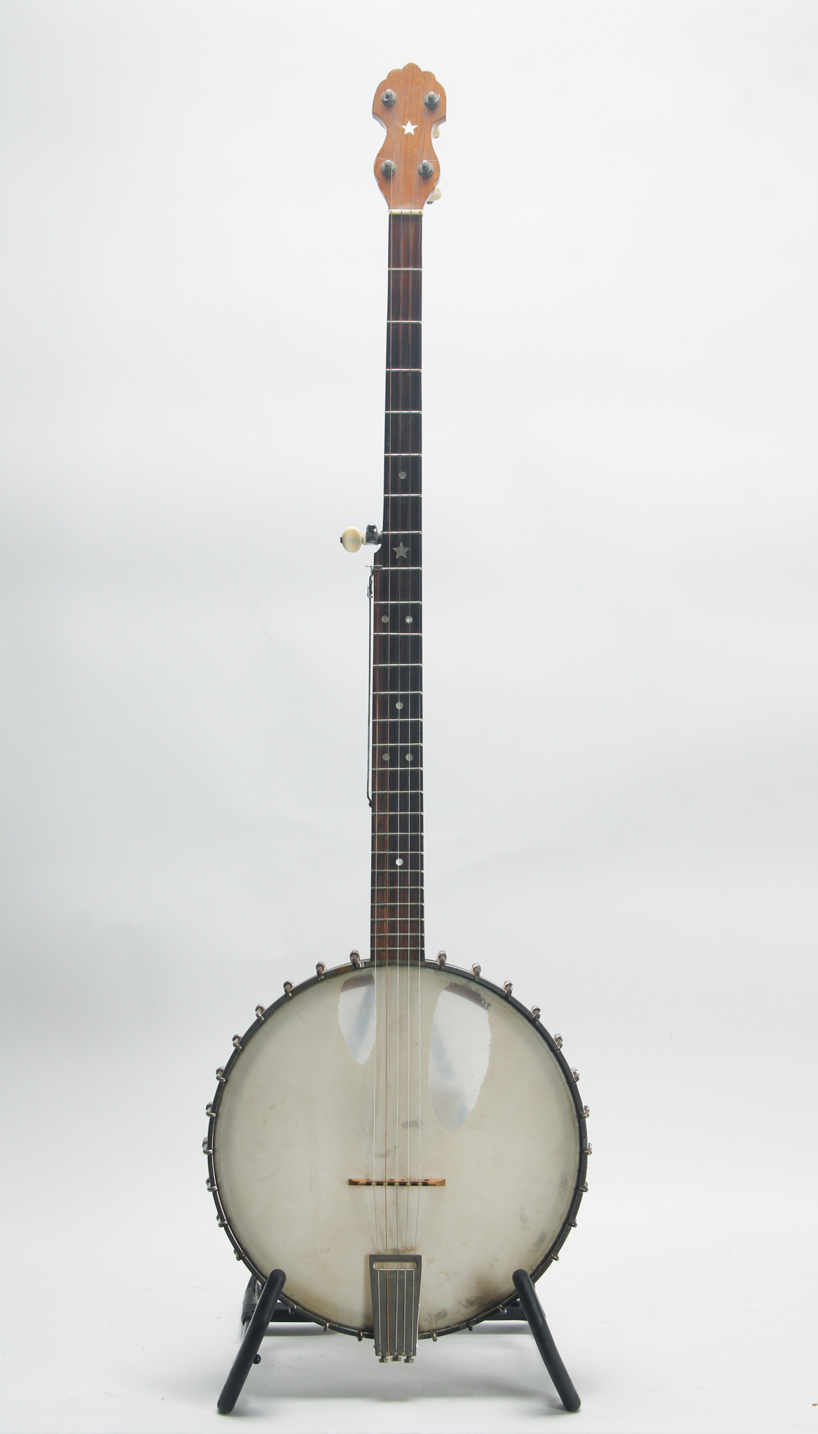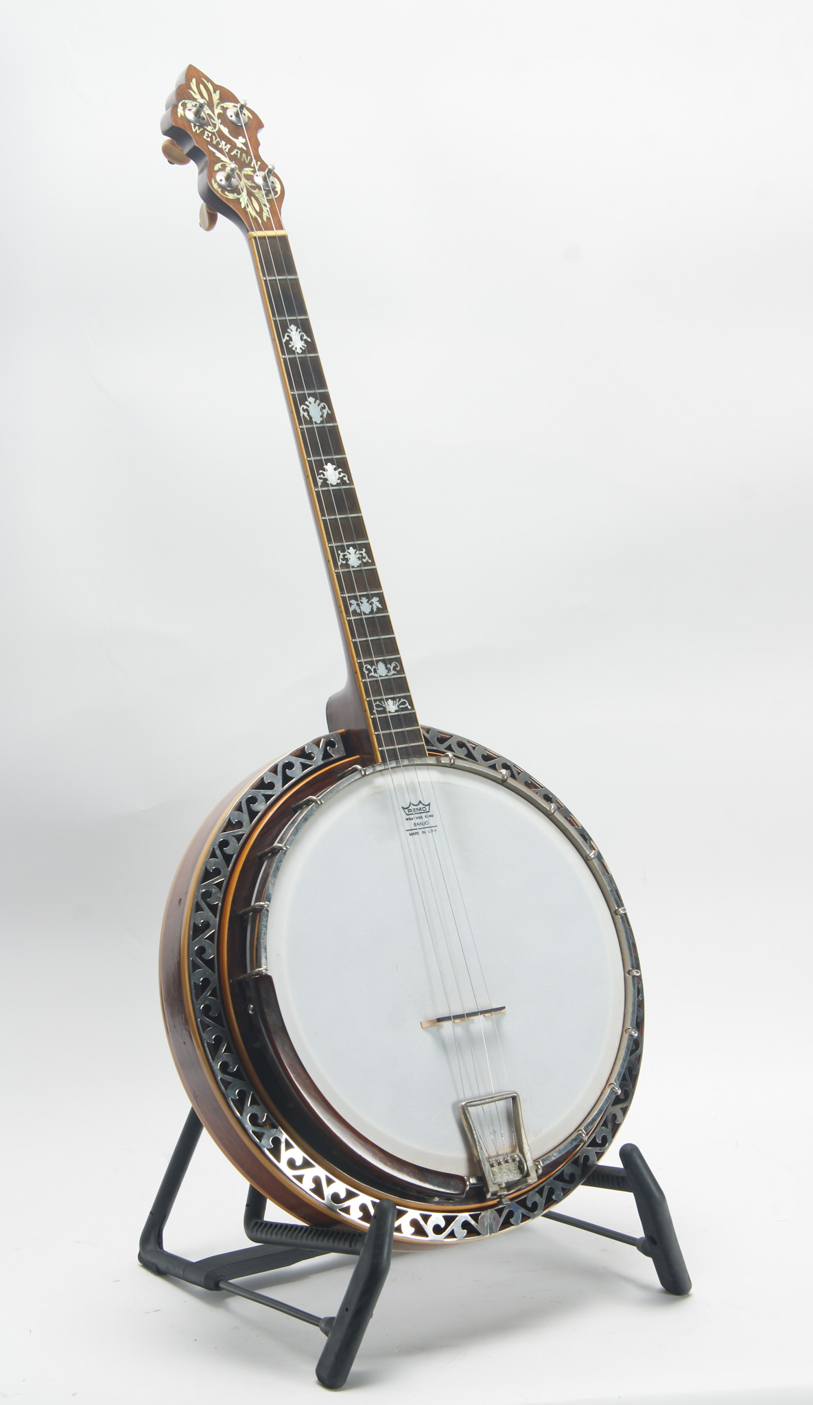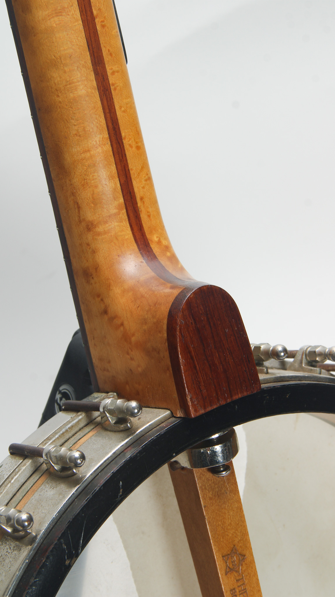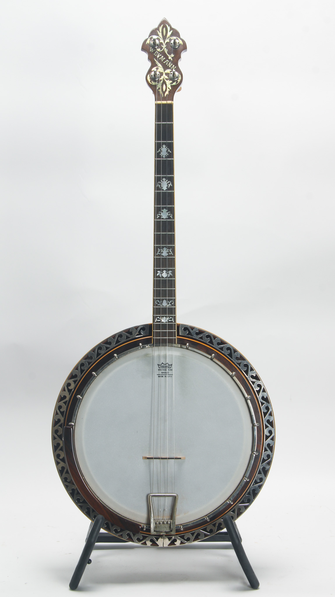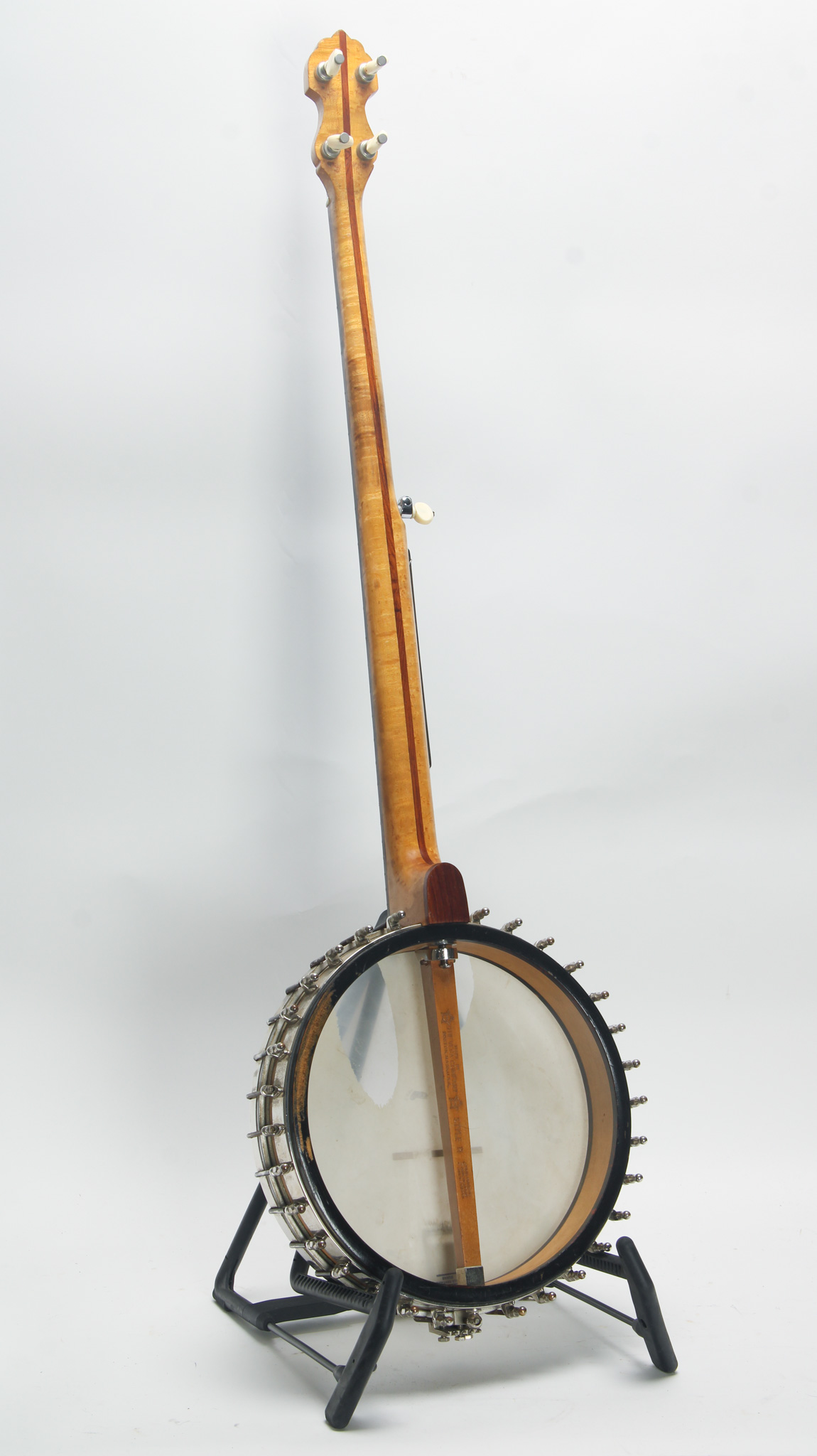 Rarely executed longneck/five string conversion utilizing an original 11-13/16" diameter Vega Style R Whyte Laydie rim assembly and three piece longneck, probably made in the middle part of the 20th...