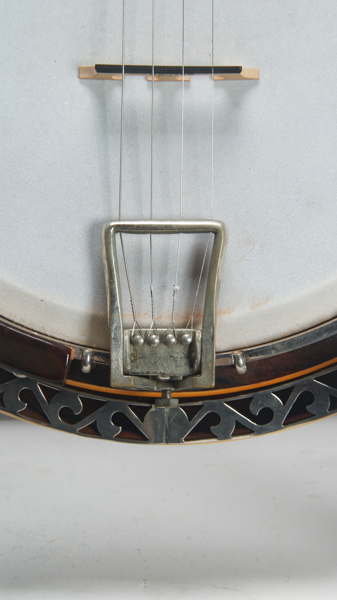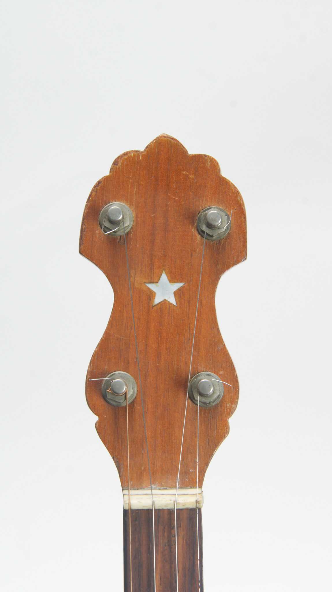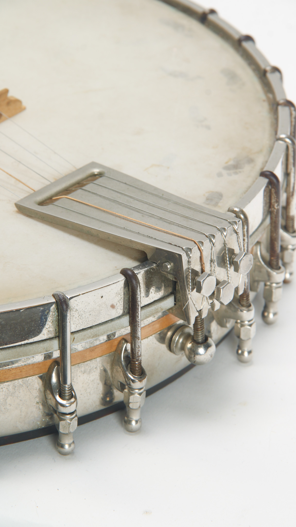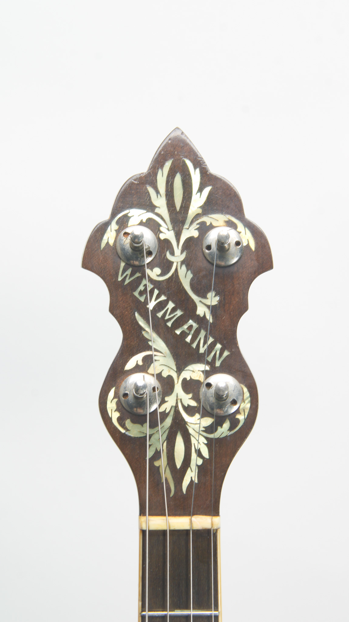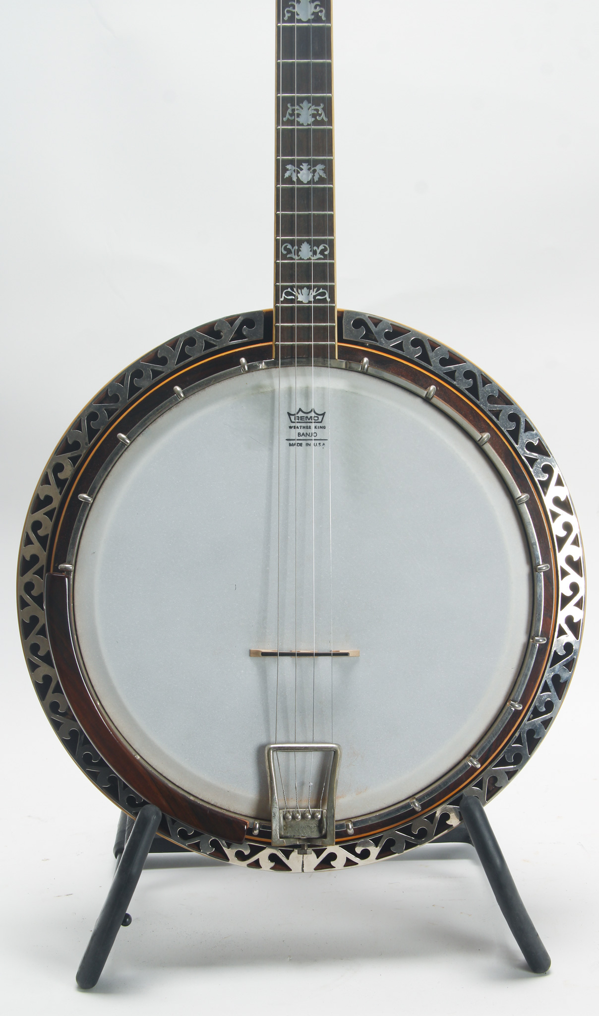 Rarely executed longneck/five string conversion utilizing an original 11-13/16" diameter Vega Style R Whyte Laydie rim assembly and three piece longneck, probably made in the middle part of the 20th...