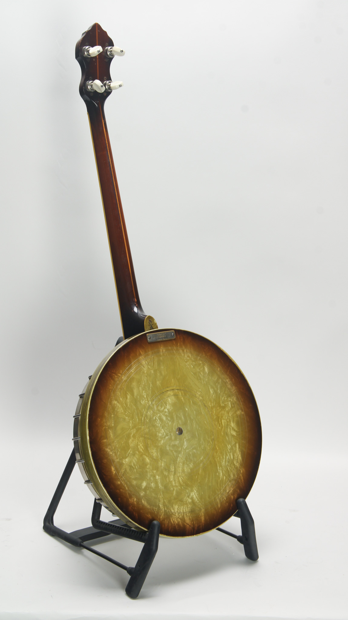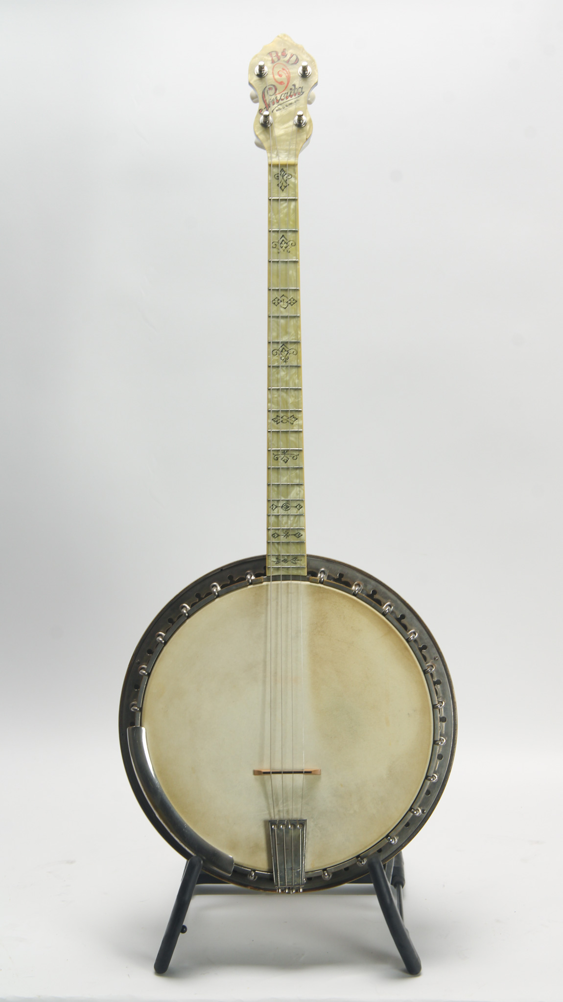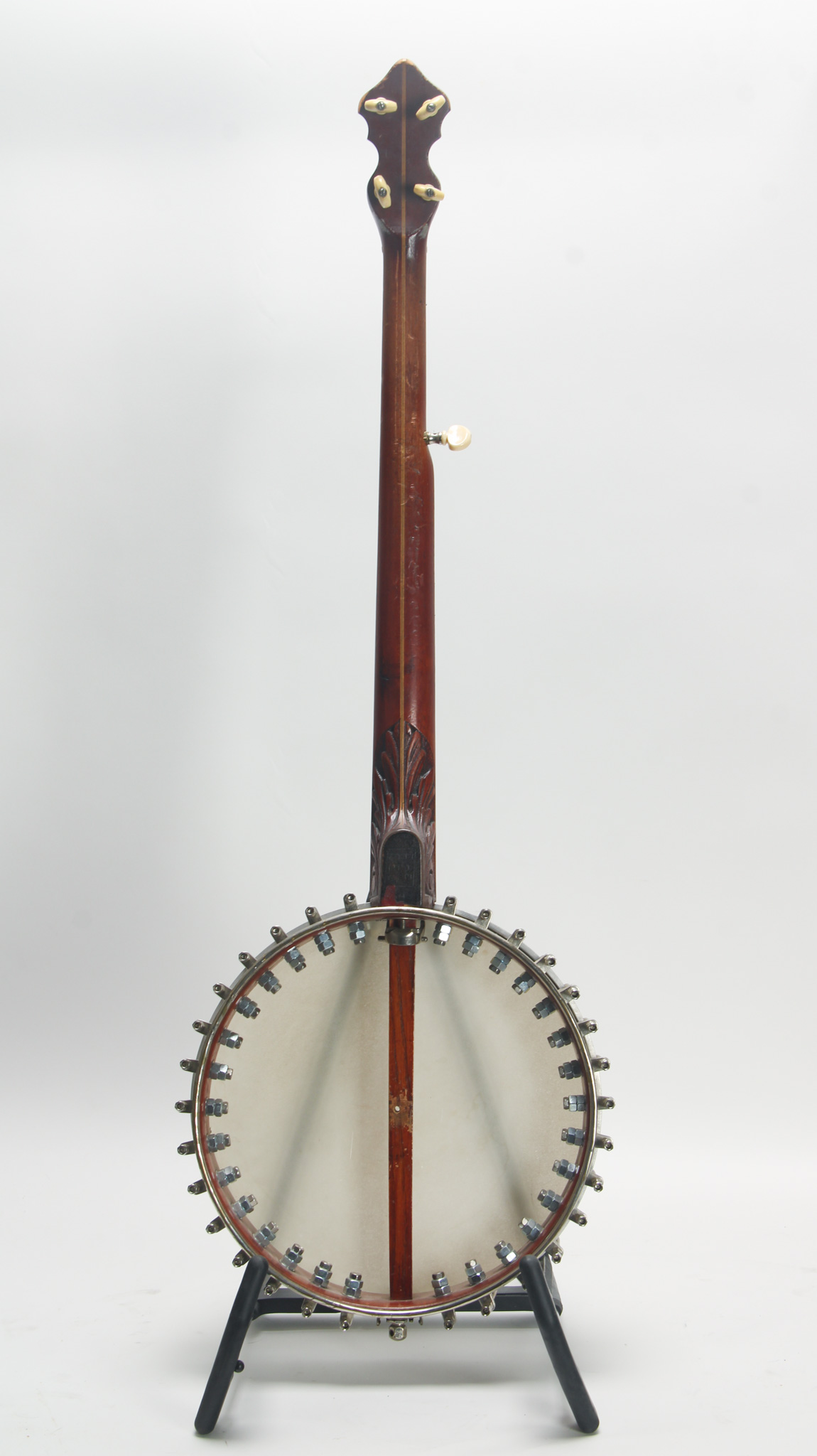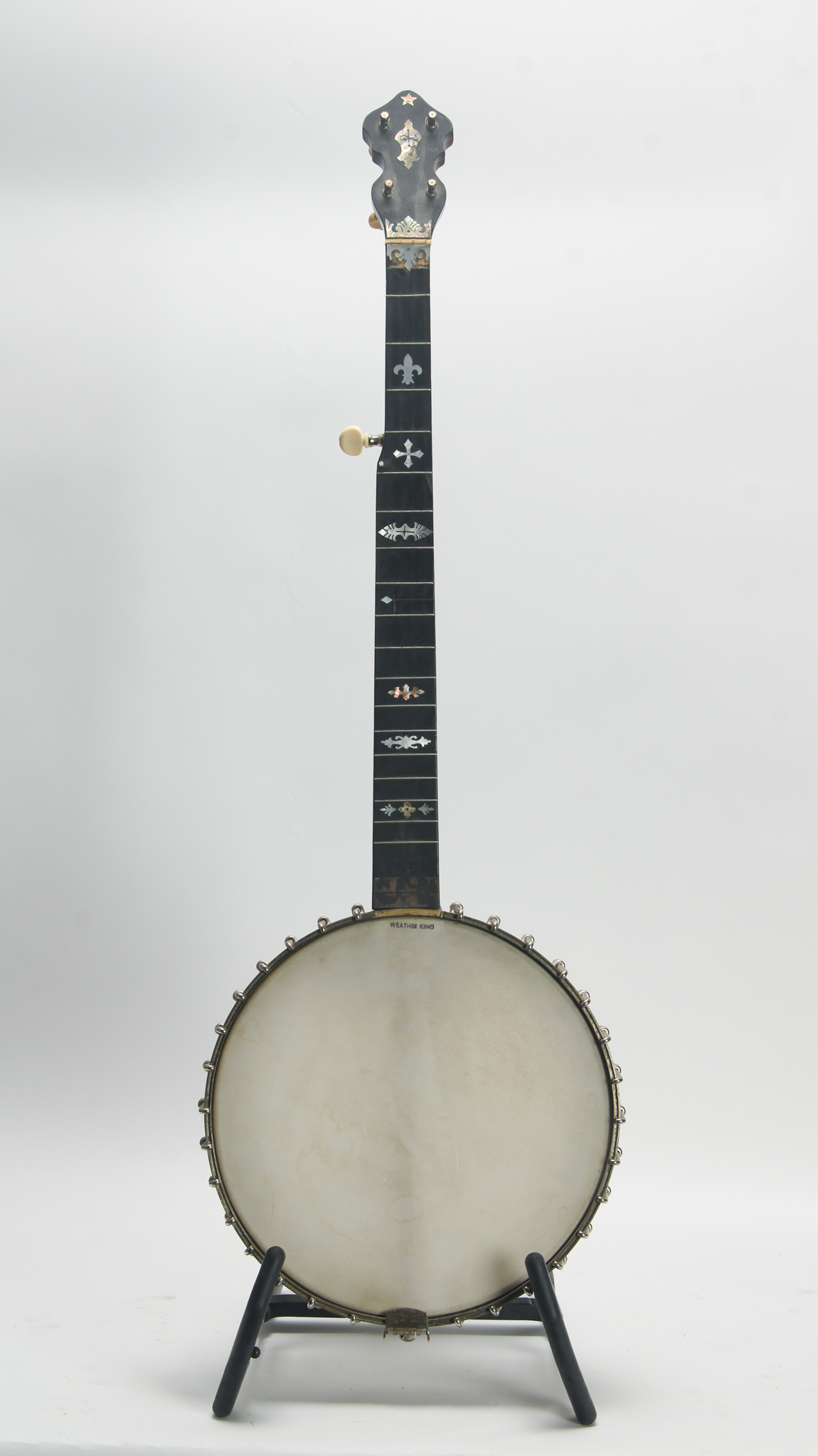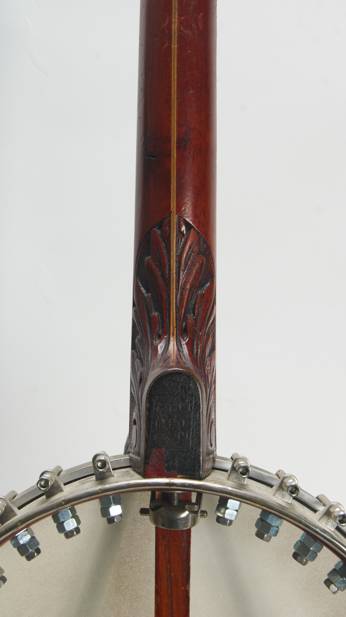 Unmarked but rather ornate five string from the early 20th century, bearing enough Washburn traits to get us thinkin. The spun over 11" diameter rim assembly has a rolled tonering, red stained maple...