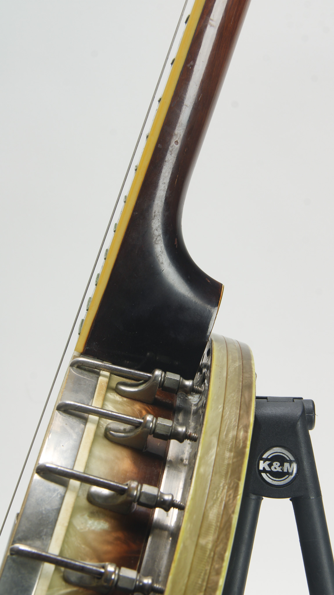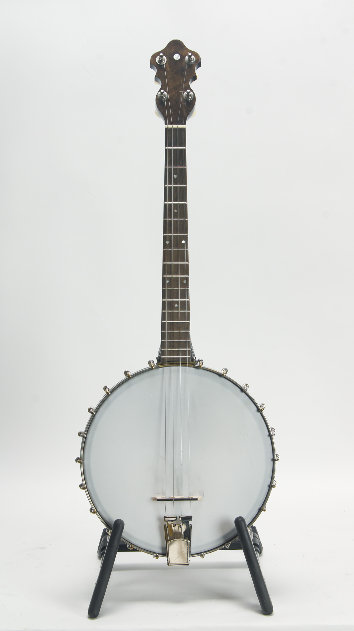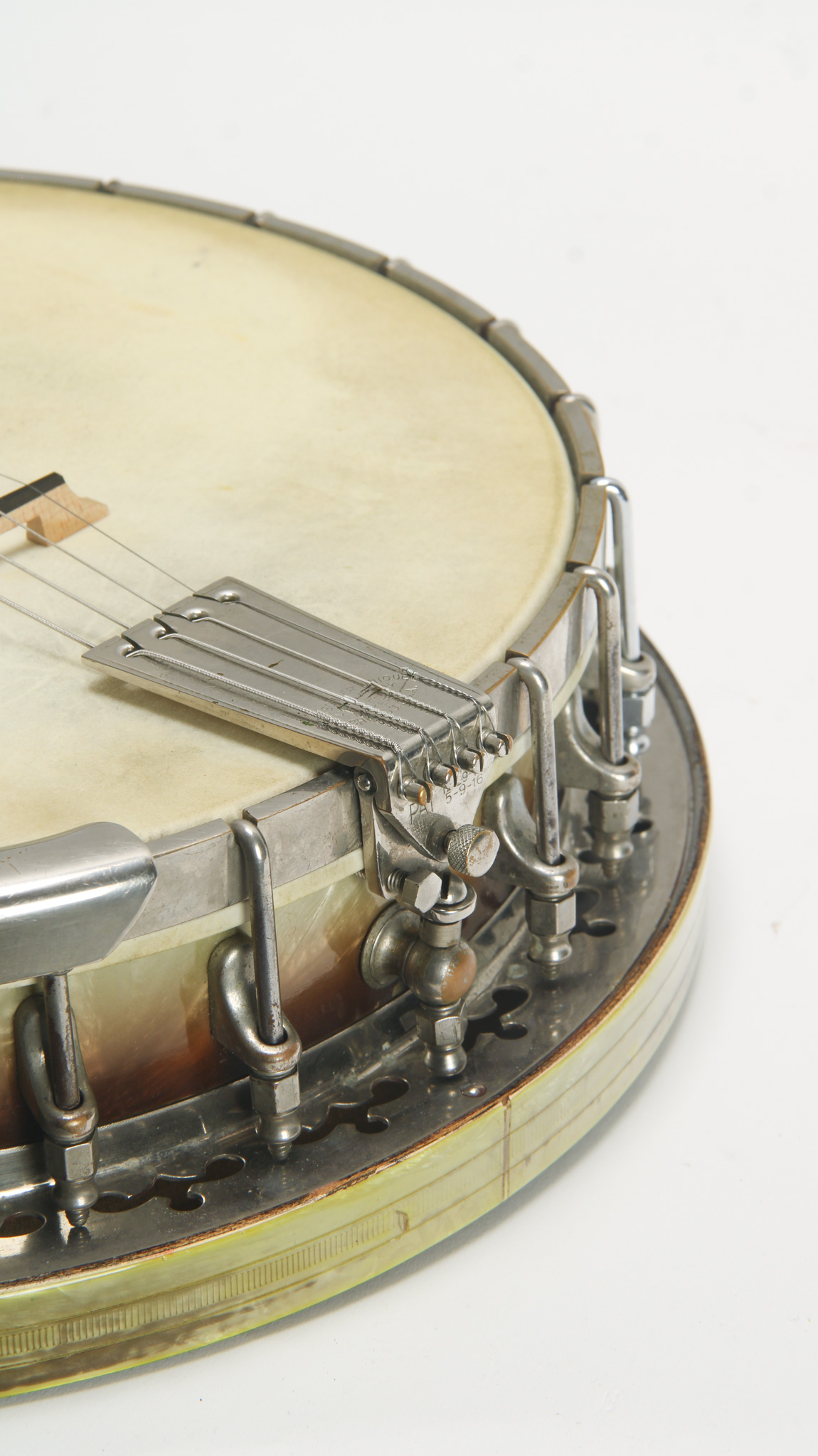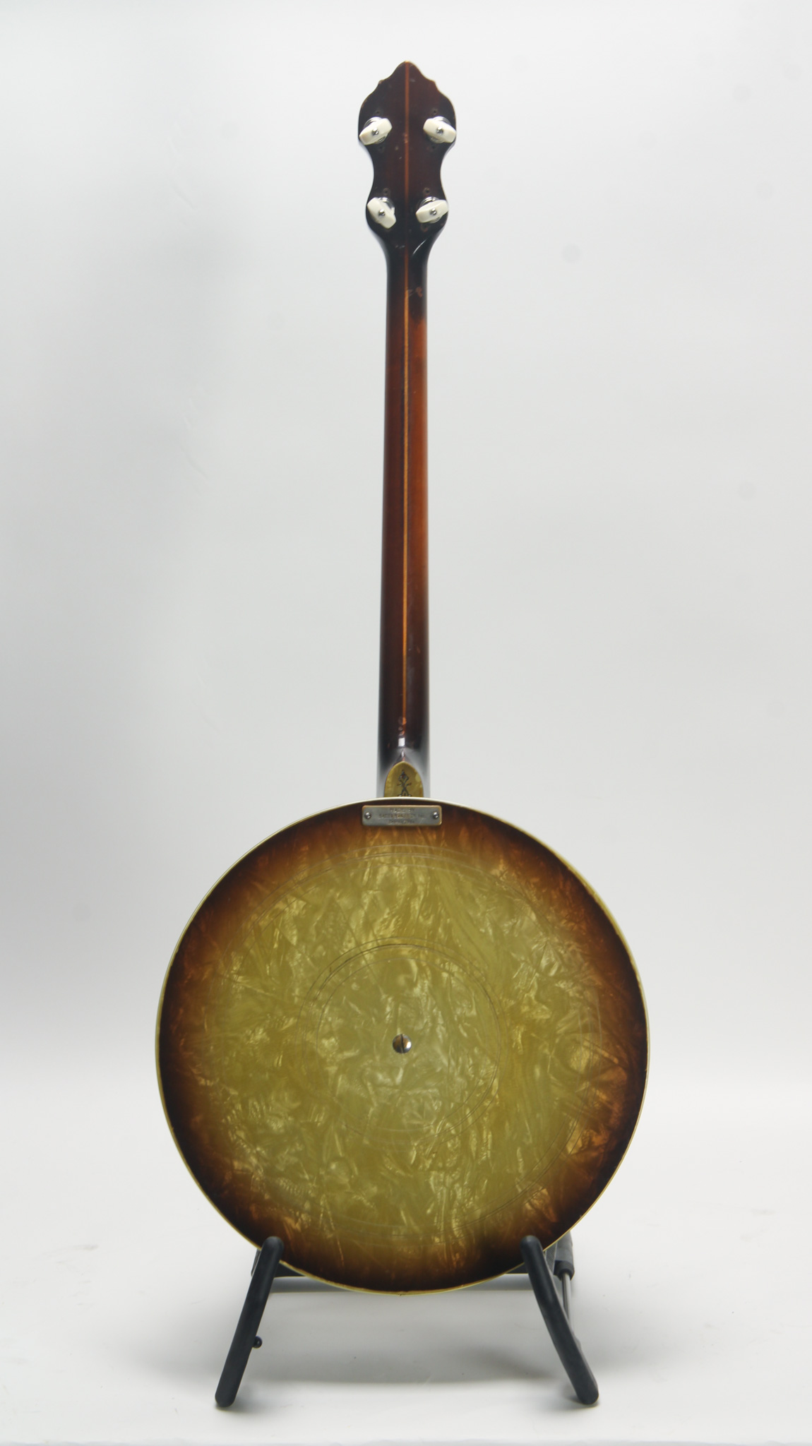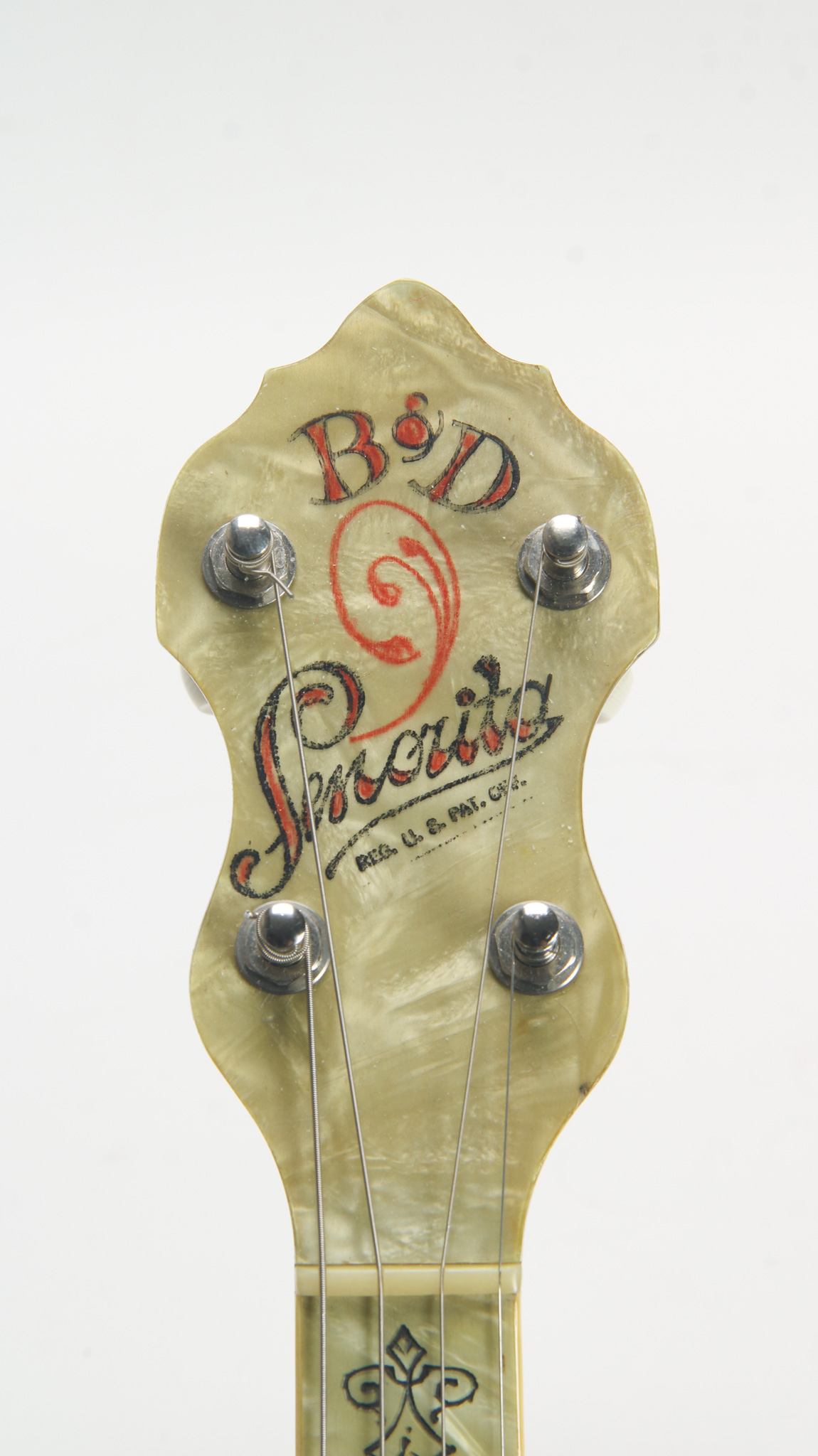 Unmarked but rather ornate five string from the early 20th century, bearing enough Washburn traits to get us thinkin. The spun over 11" diameter rim assembly has a rolled tonering, red stained maple...