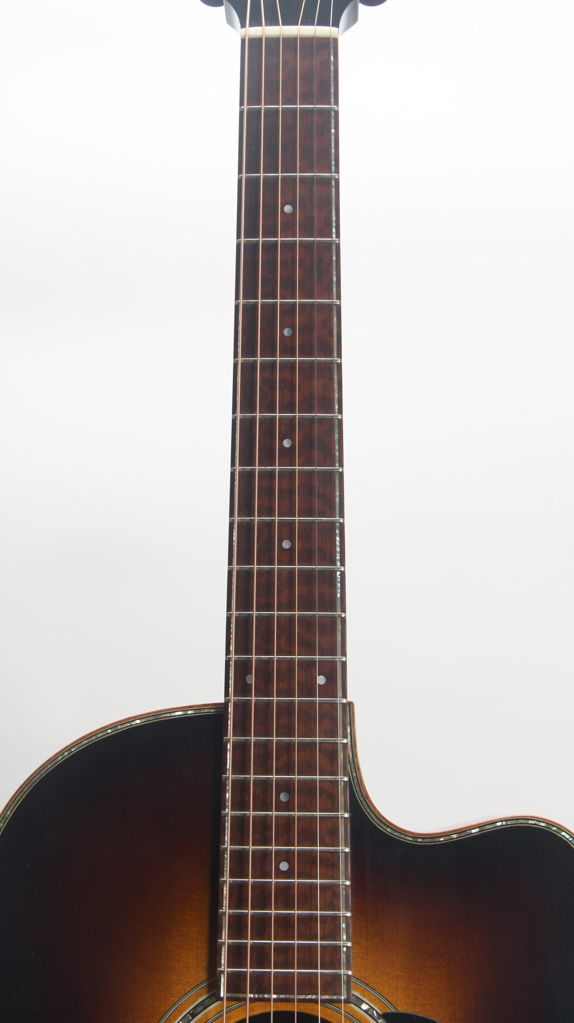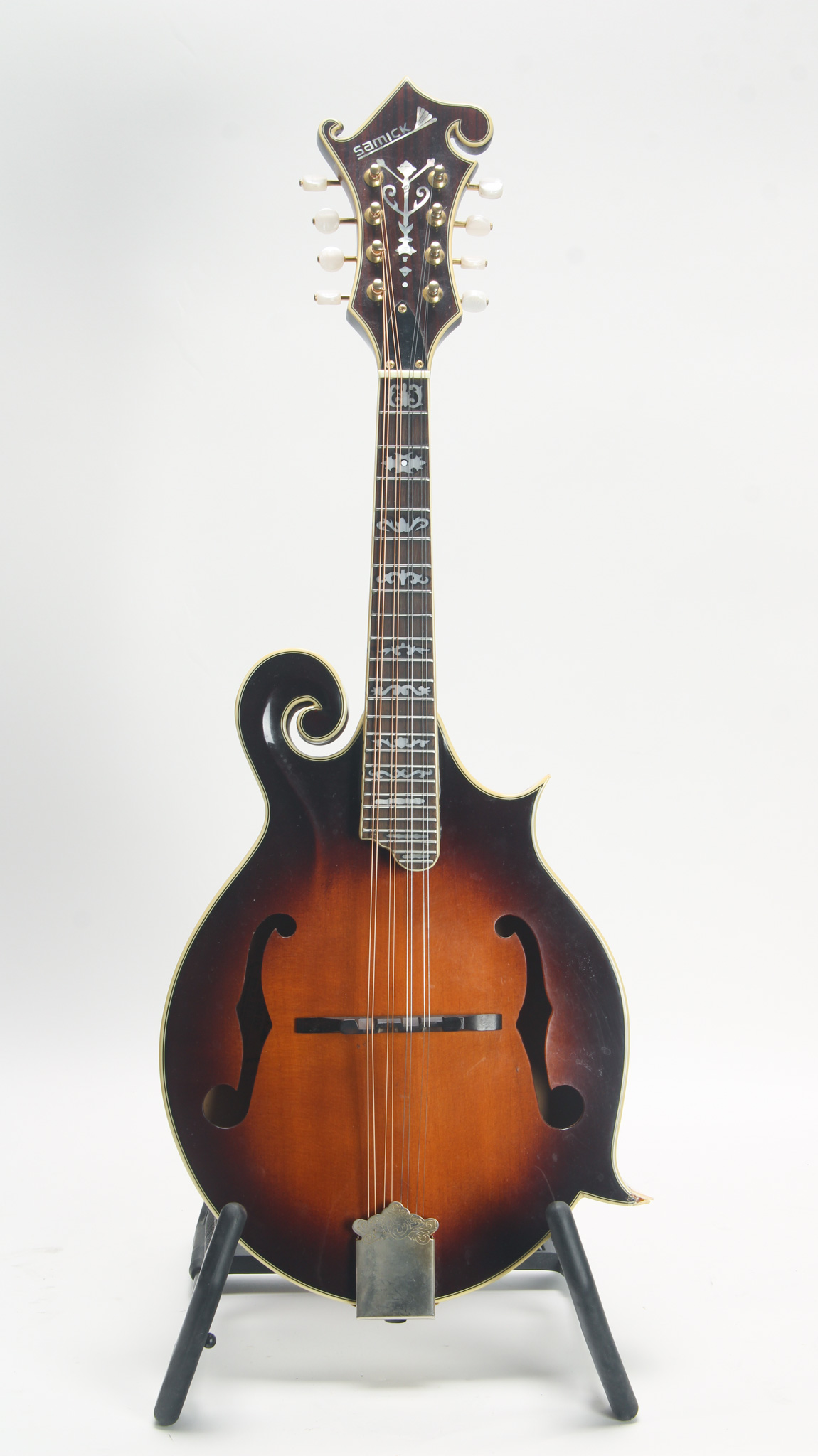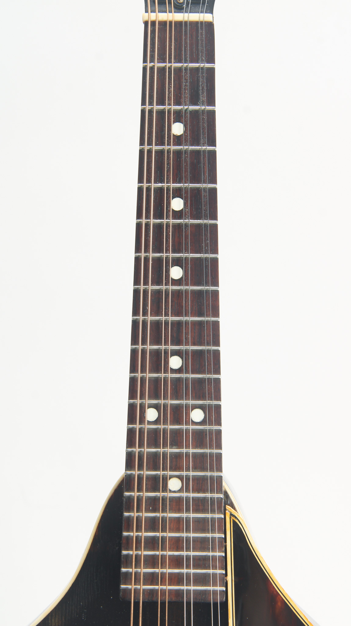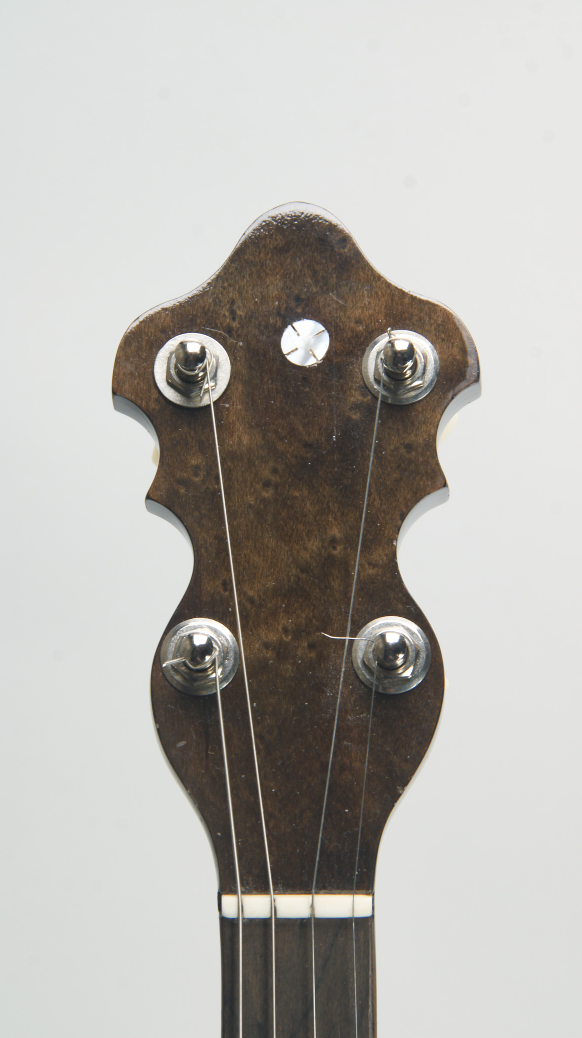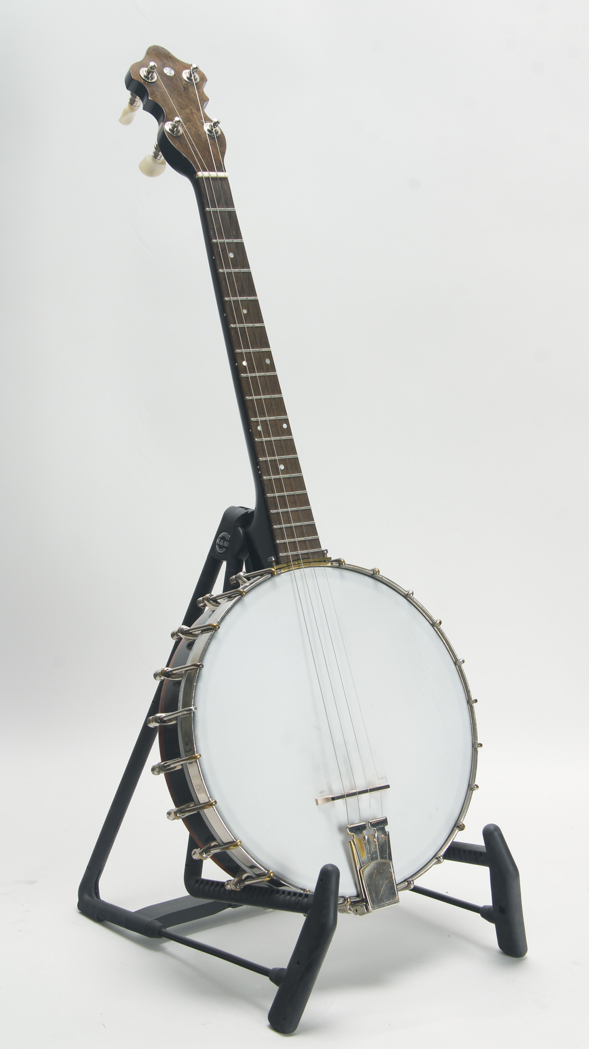 Unmarked but rather ornate five string from the early 20th century, bearing enough Washburn traits to get us thinkin. The spun over 11" diameter rim assembly has a rolled tonering, red stained maple...