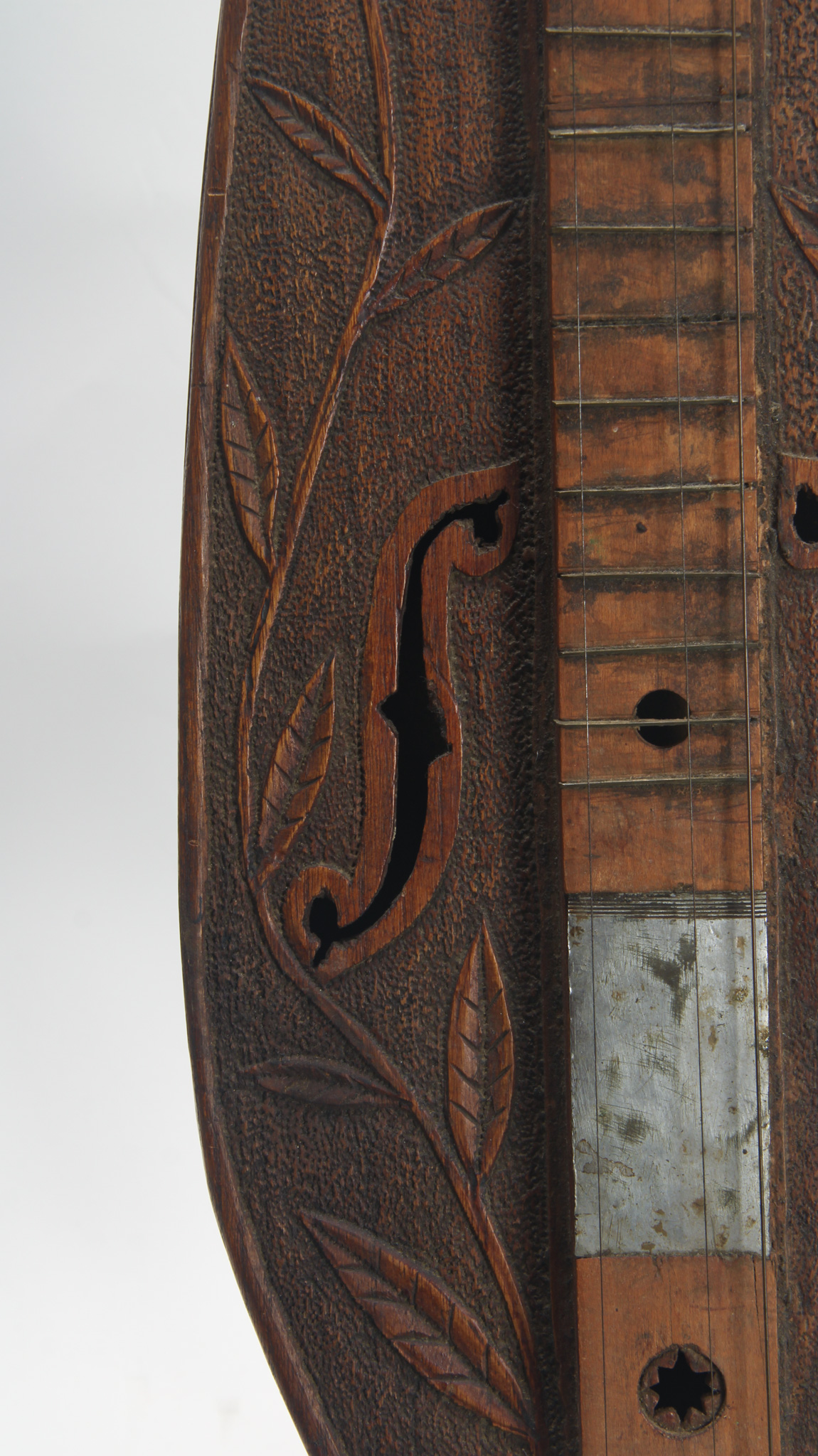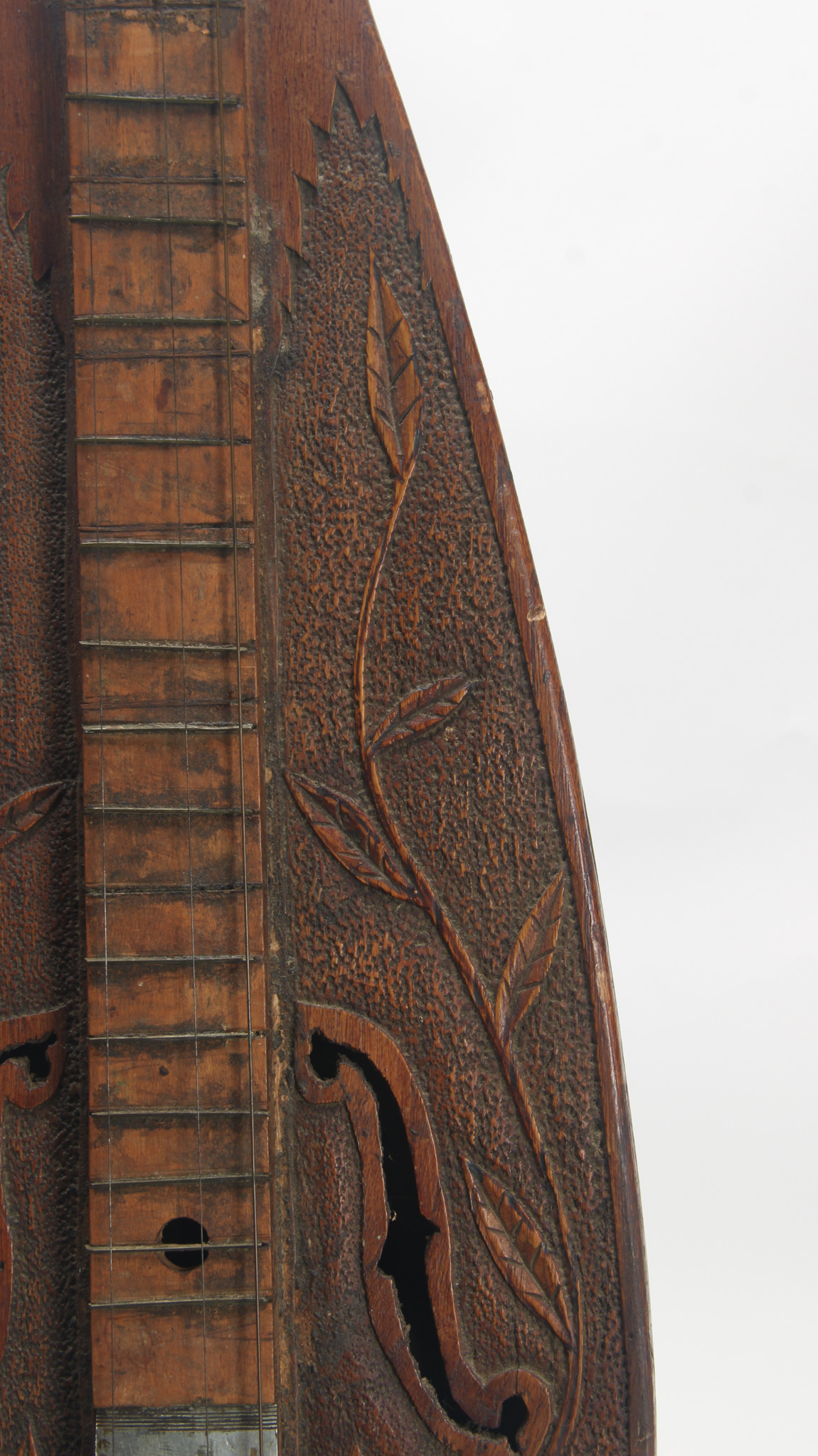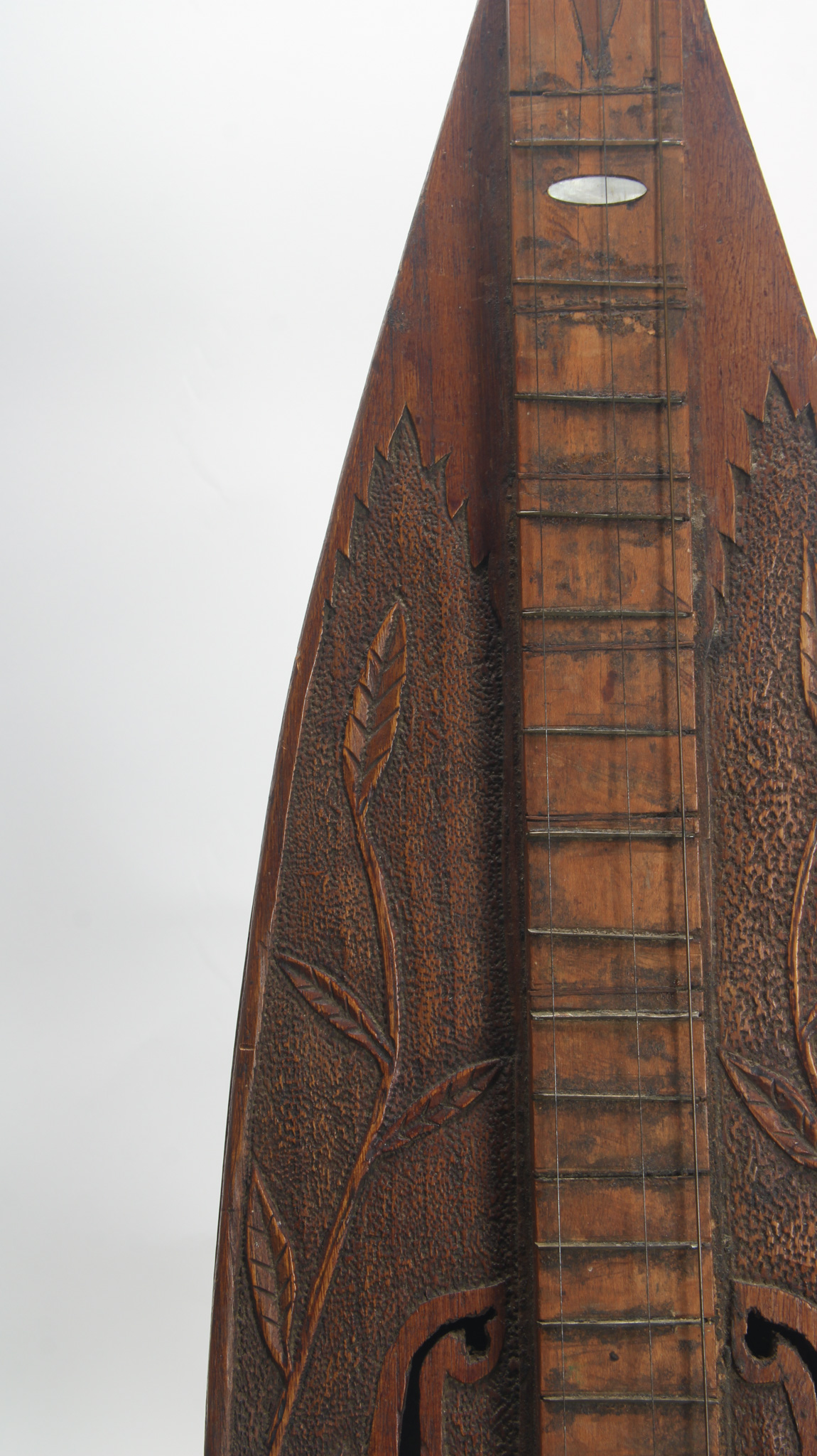 Extremely interesting teardrop shaped 19th century dulcimer, true American folk art, with tons of floral relief carving on the top, with a hollow neck, 2x f holes, large carved violin shaped scroll...