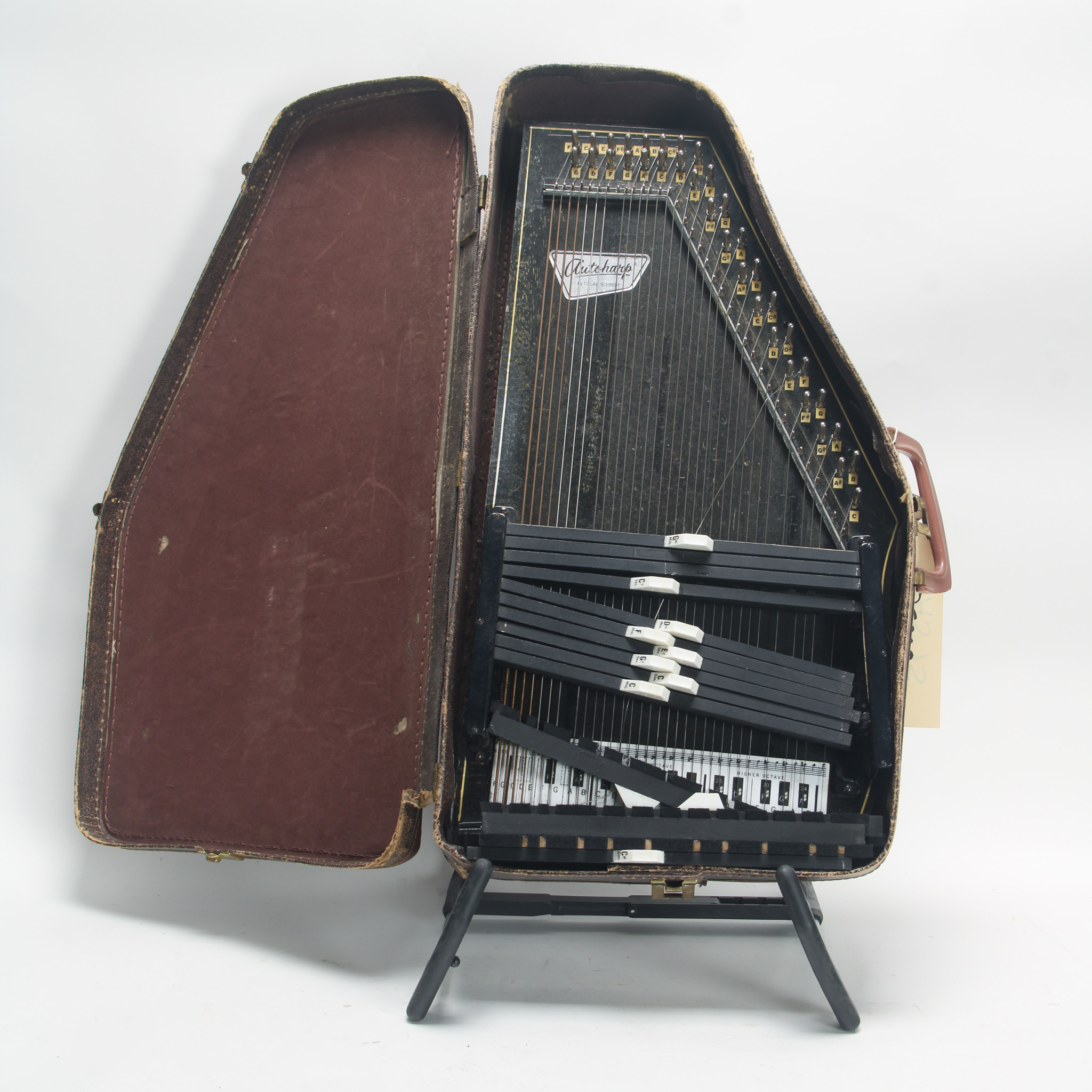 A 15 chord autoharp from Oscar Schmidt. Cosmetically in fairly good shape, but in need of TLC. Chord bars need reassembly, but pads look very healthy, and likely this sat for a long time without...