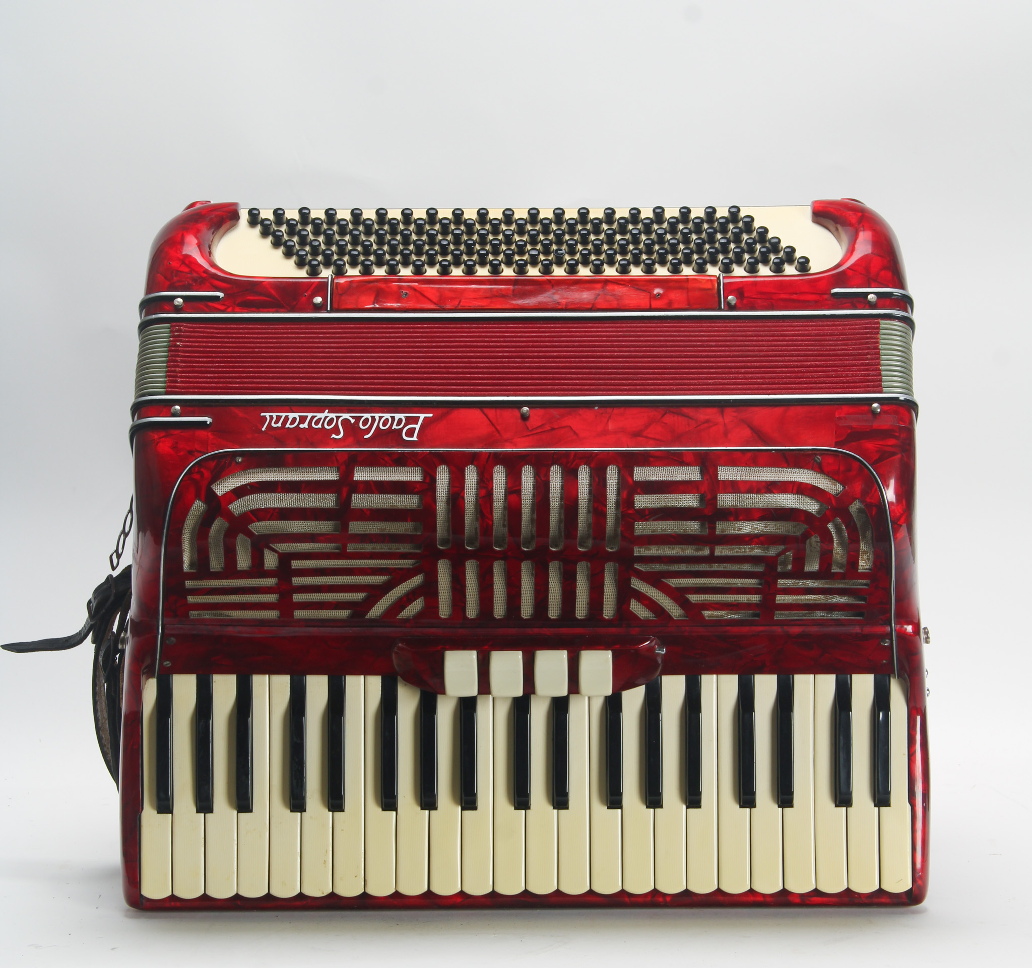 This Paolo Soprani accordion is in decent playable condition. Made in Italy. This model has 41 keys and 120 bass button and 4 voicing buttons. Fairly well in tune. Bellows locks are broken but can be...