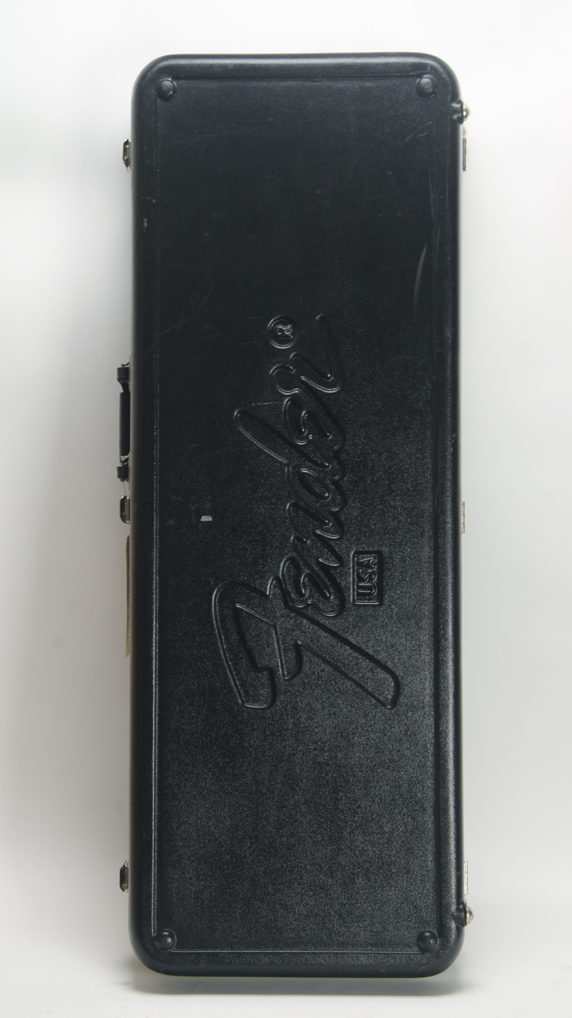 Appropriate for a 1990's era Fender Stratocaster. Molded plastic Fender USA hardshell rectangular case. This case will fit a standard size Fender Strat. Black plastic exterior with black faux fur...
