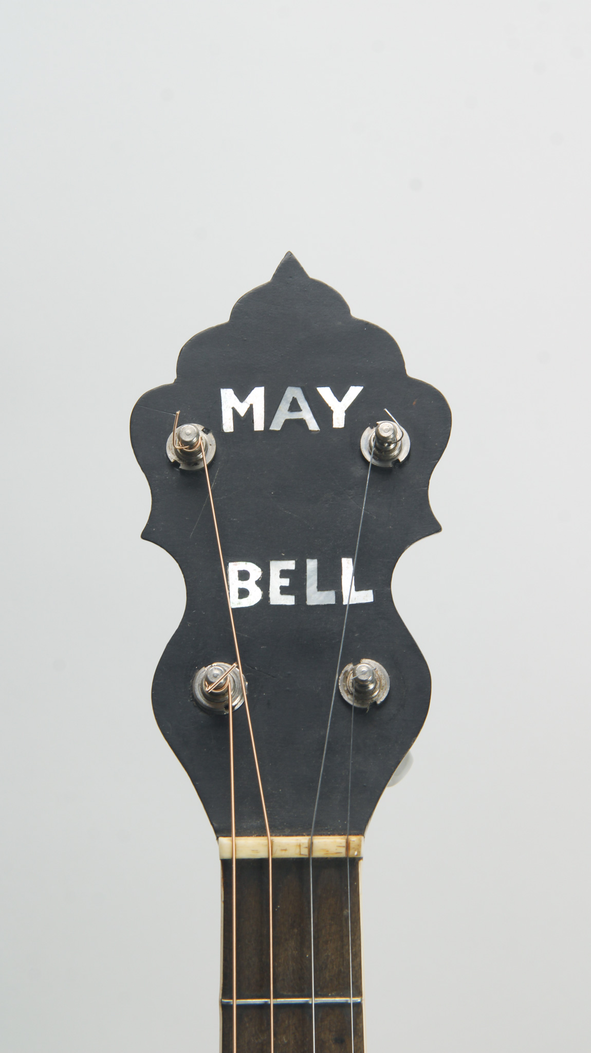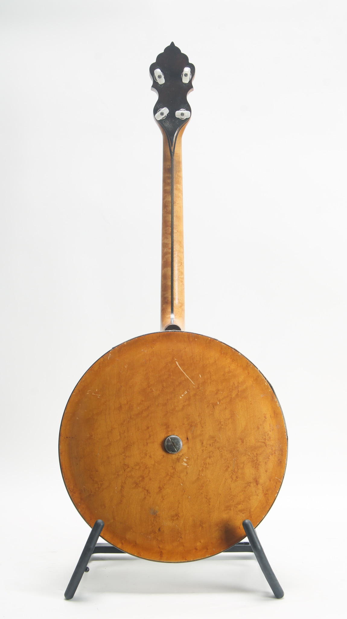 An interesting Slingerland made Maybell, 17 fret tenor; the rim assembly measures 11", is of birdseye and flamed maple, and features a reverse doughnut style tonering, not dissimilar to a Washburn...