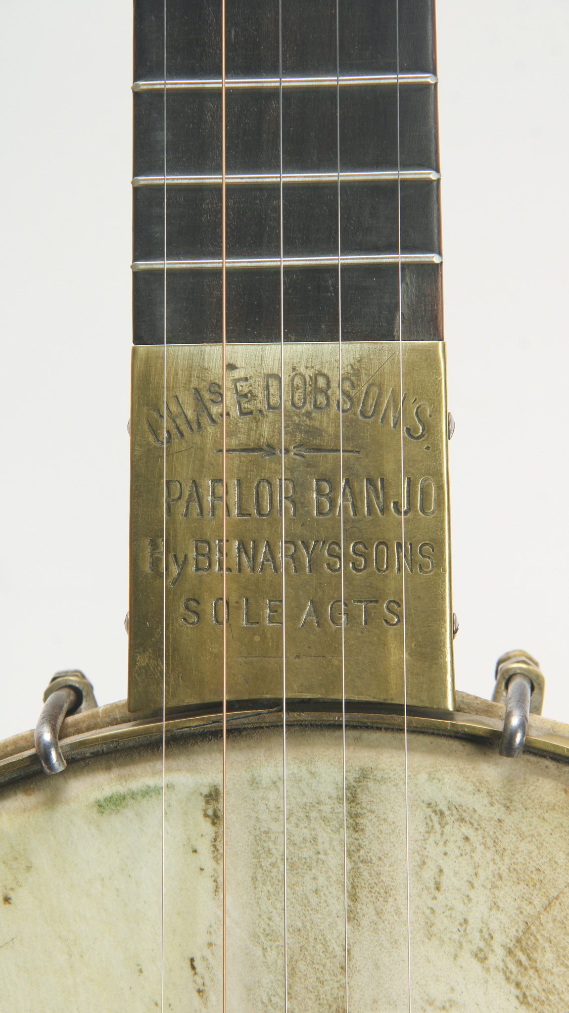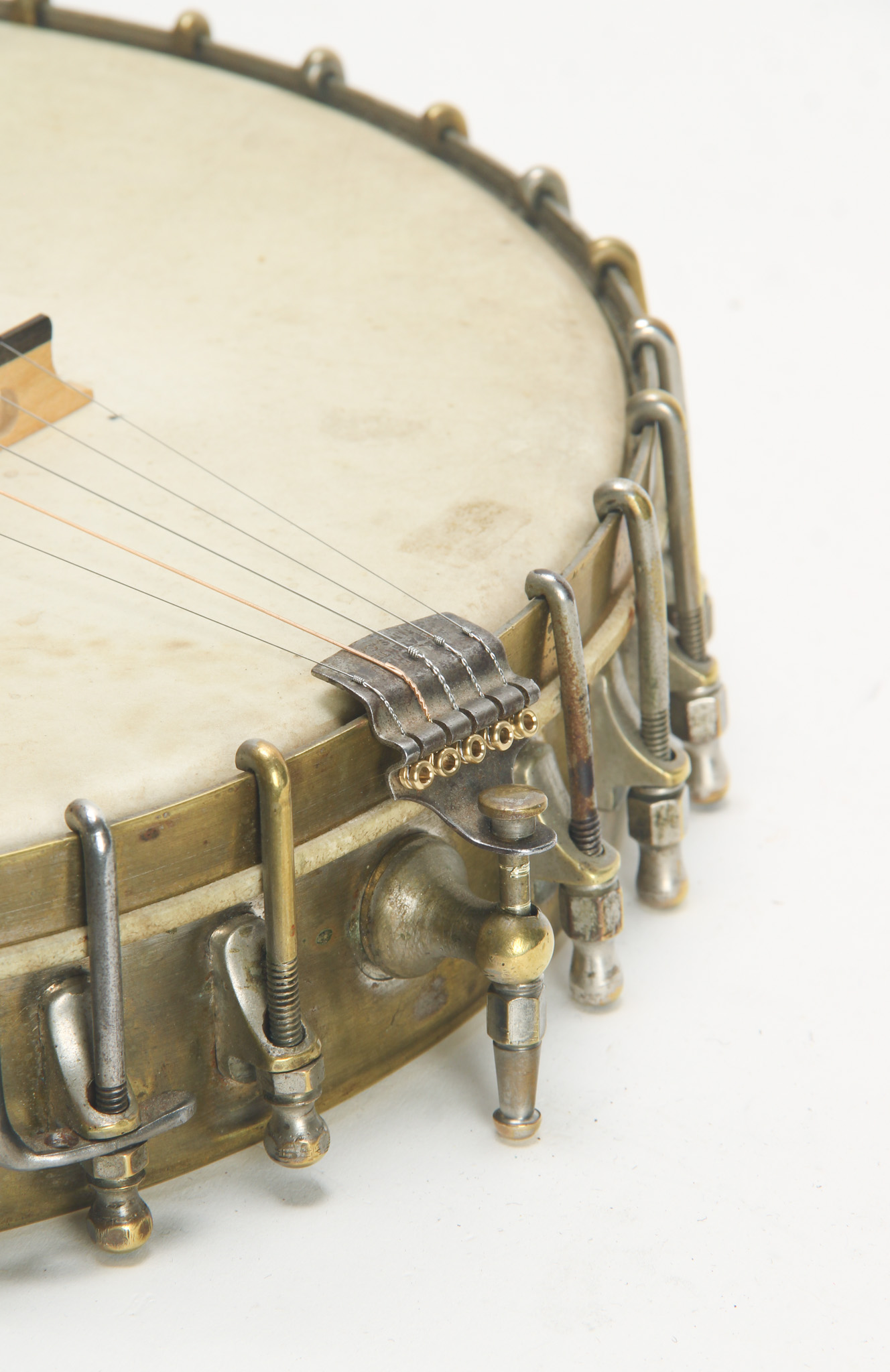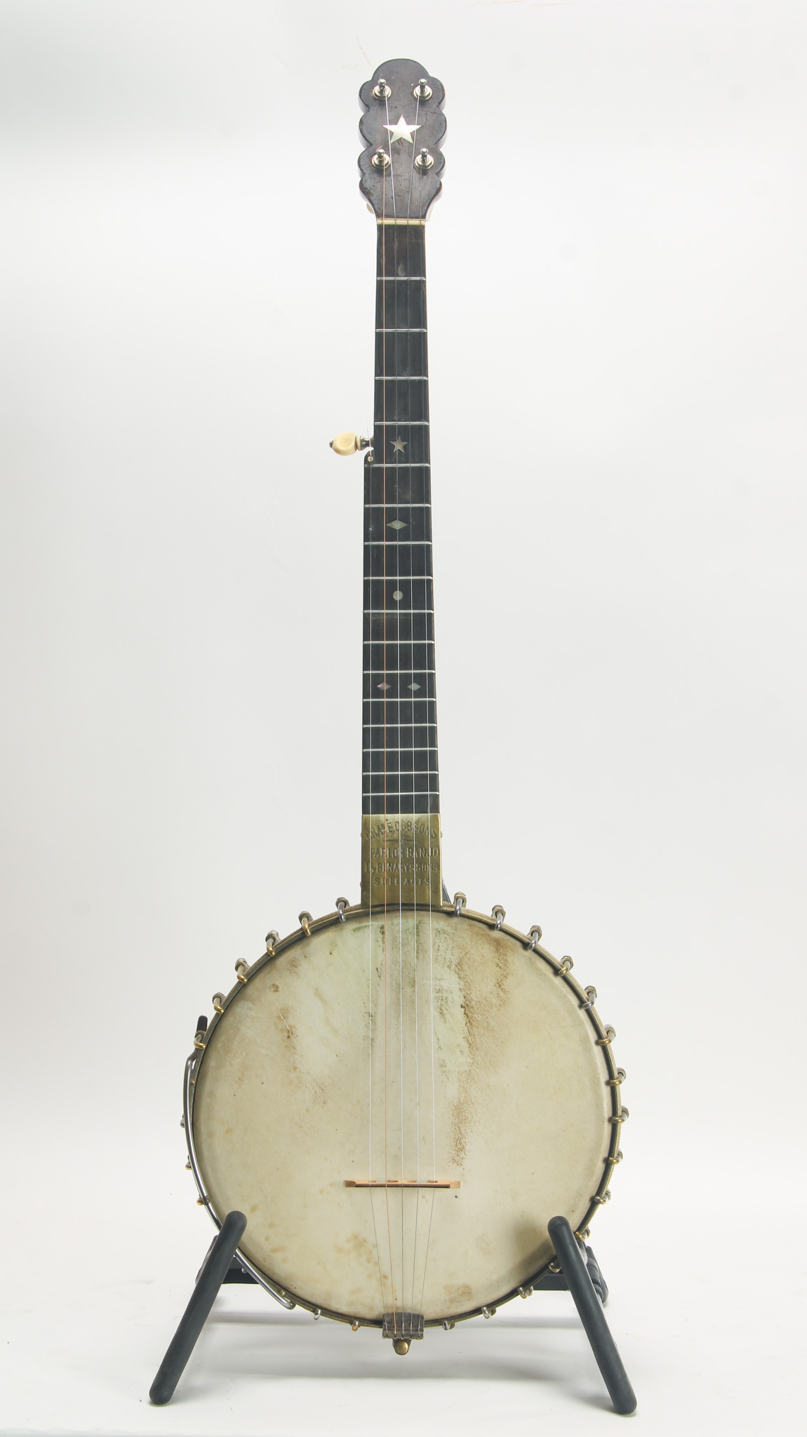 A simple banjo with a less-than-simple plaque; 11" silverspun-over rim with internal bead edge, 30 brackets with mismatched hardware, equipped with Bell Brand tailpiece. The 25-1/4" scale mahogany...