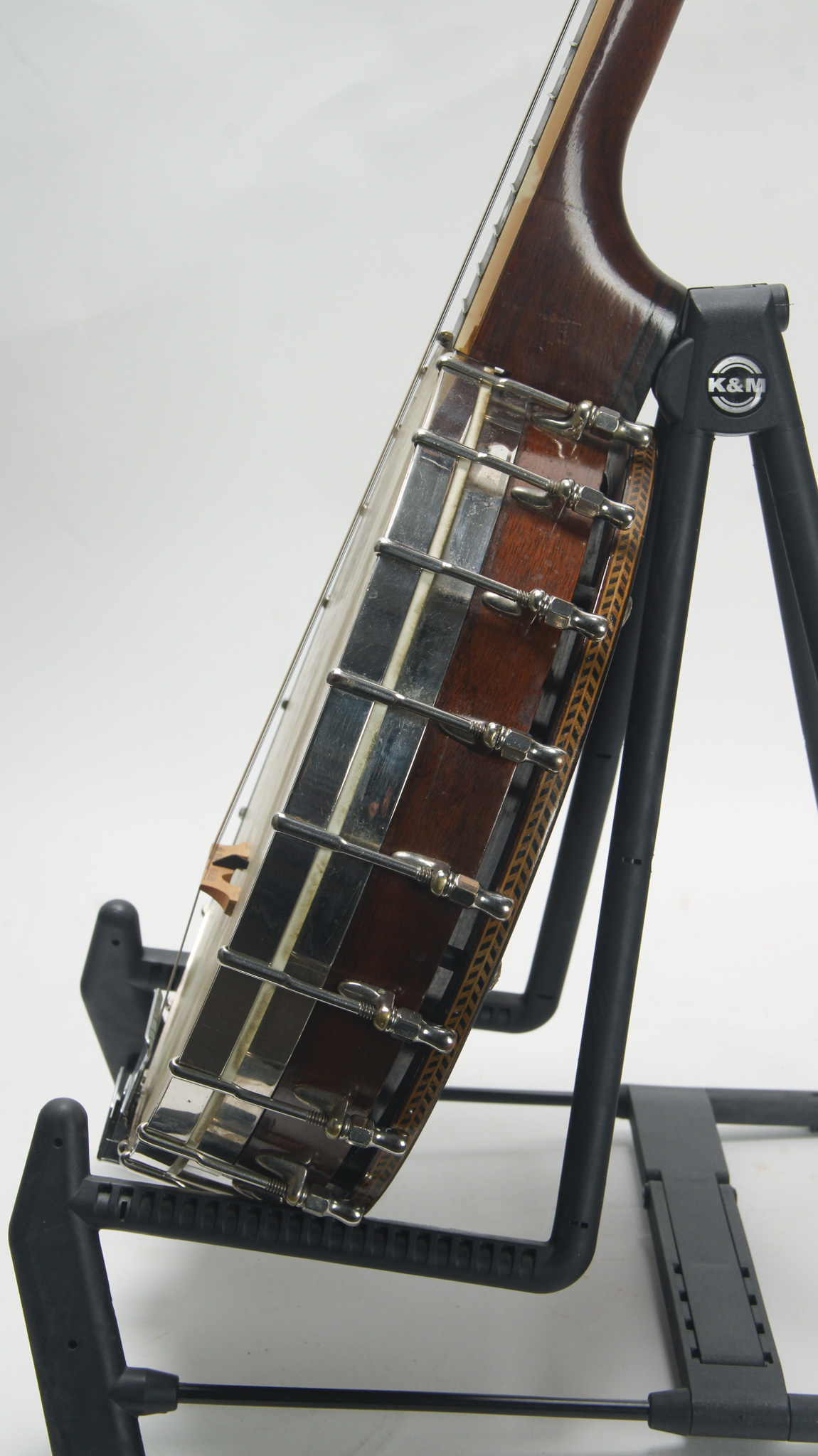 From the early 20th century, a nice playing Washburn Style 445 (as stamped on the heel cap), featuring its original hard shell case. The 10-3/4 diameter mahogany rim assembly is 5/8" thick, is...