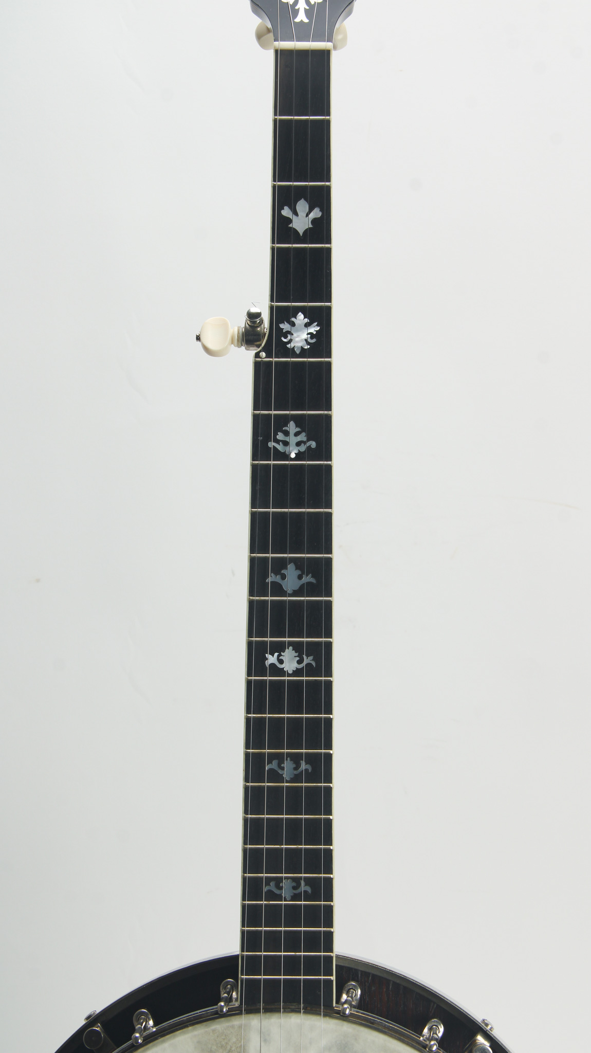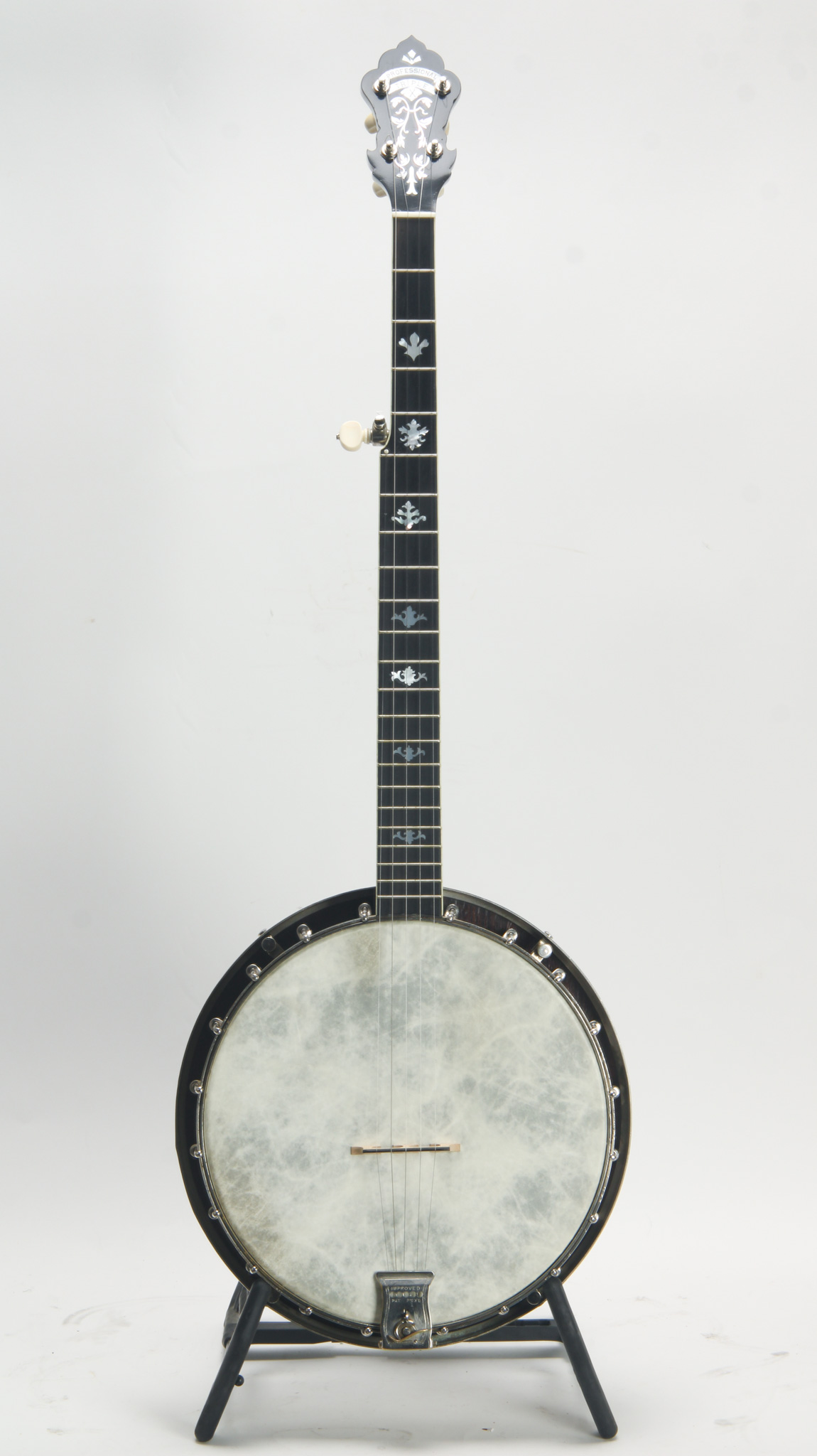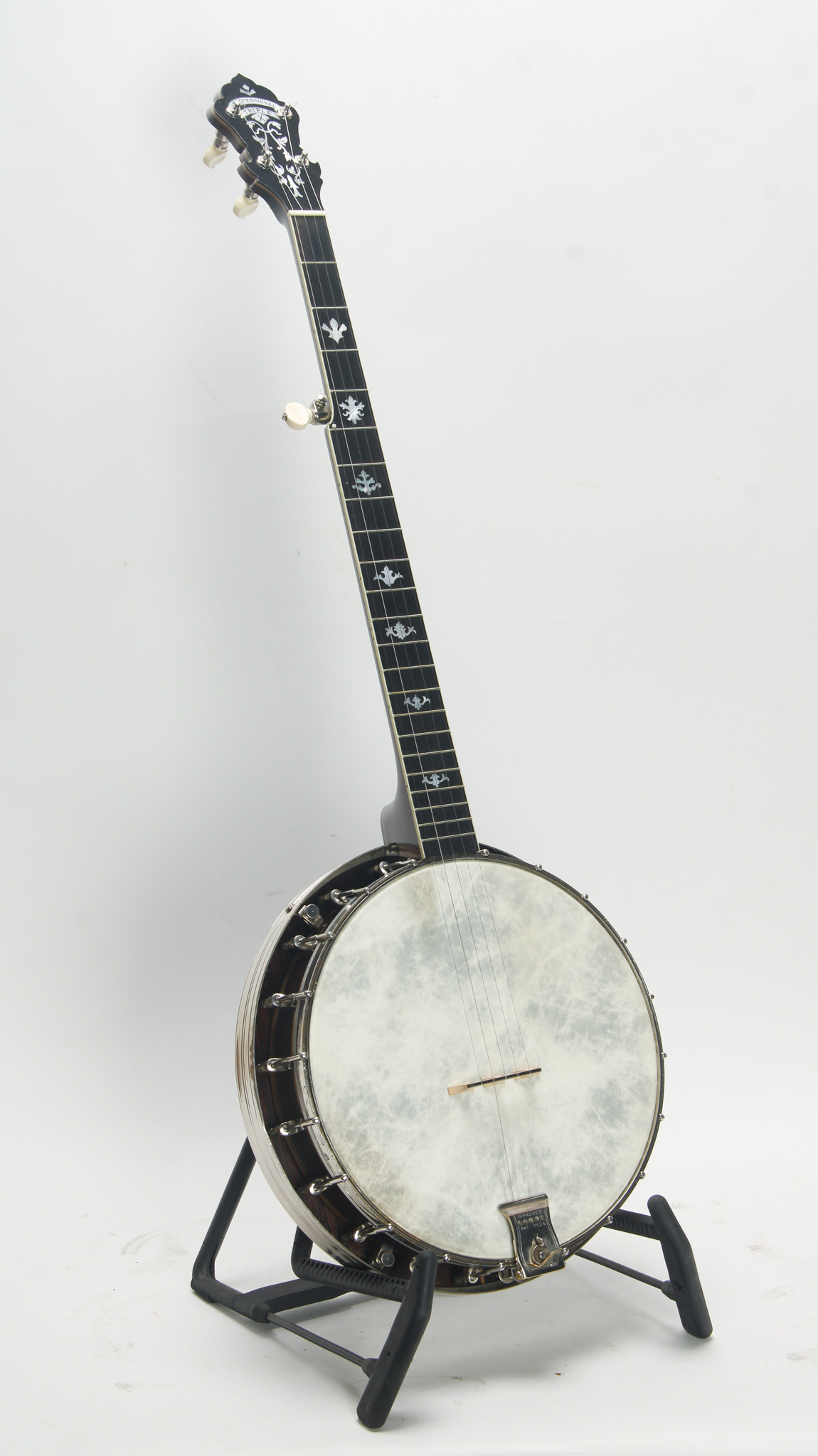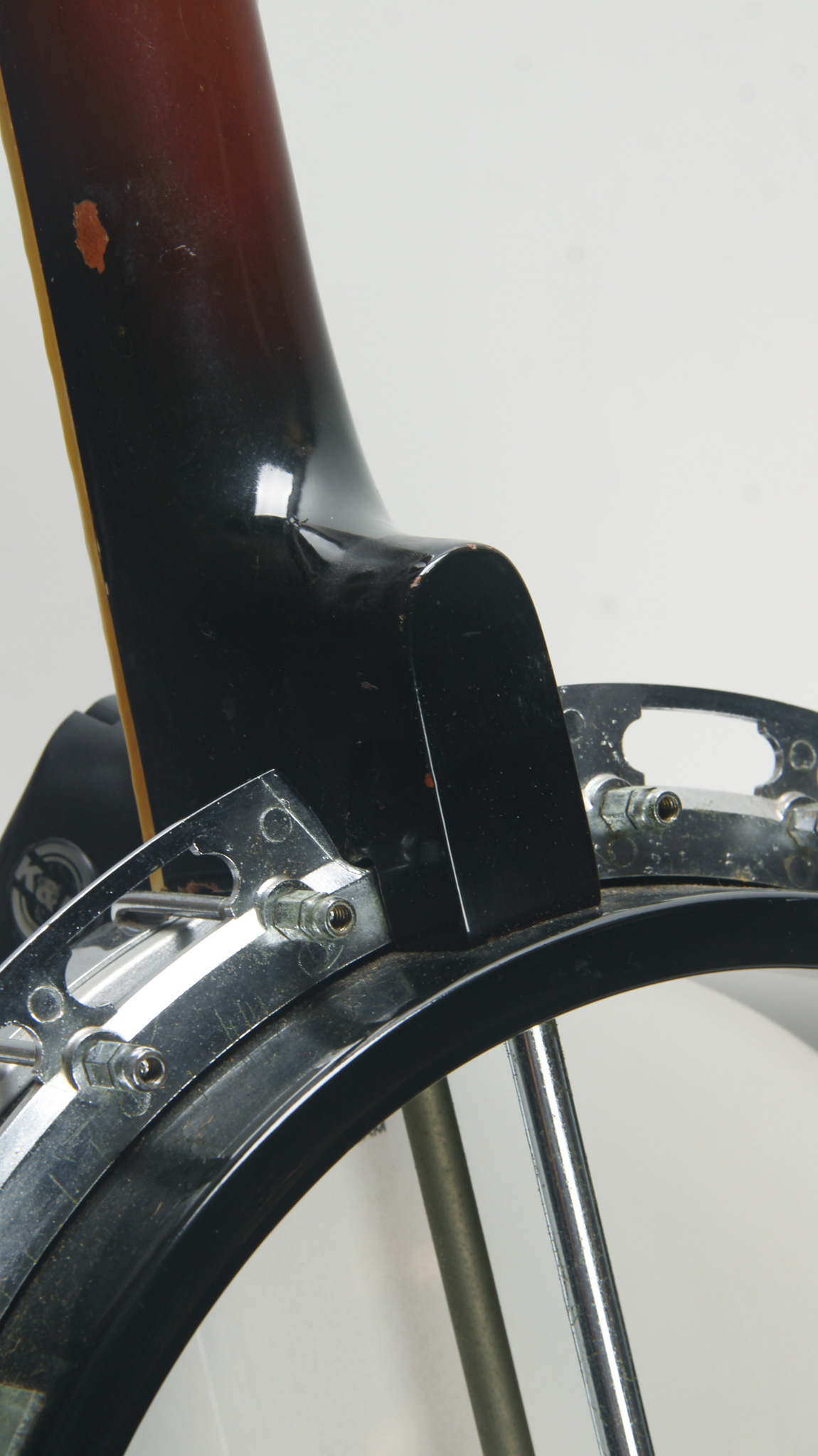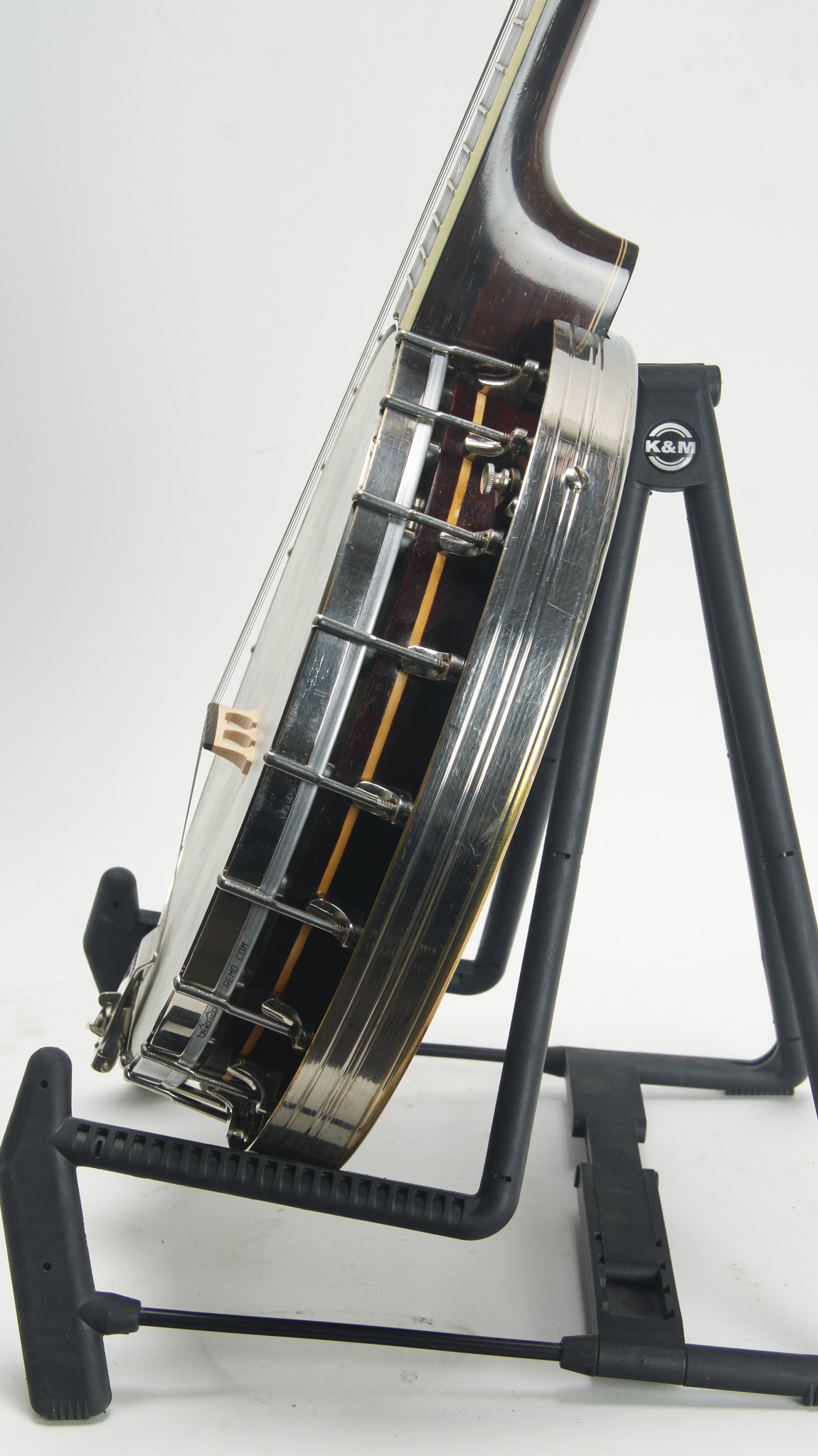 Excellent lightweight festival banjo employing an original style 150 rim assembly, and a higher grade RB-250 five string neck. The black painted 1/2" wide 11" diameter pot has a simple rolled brass...
