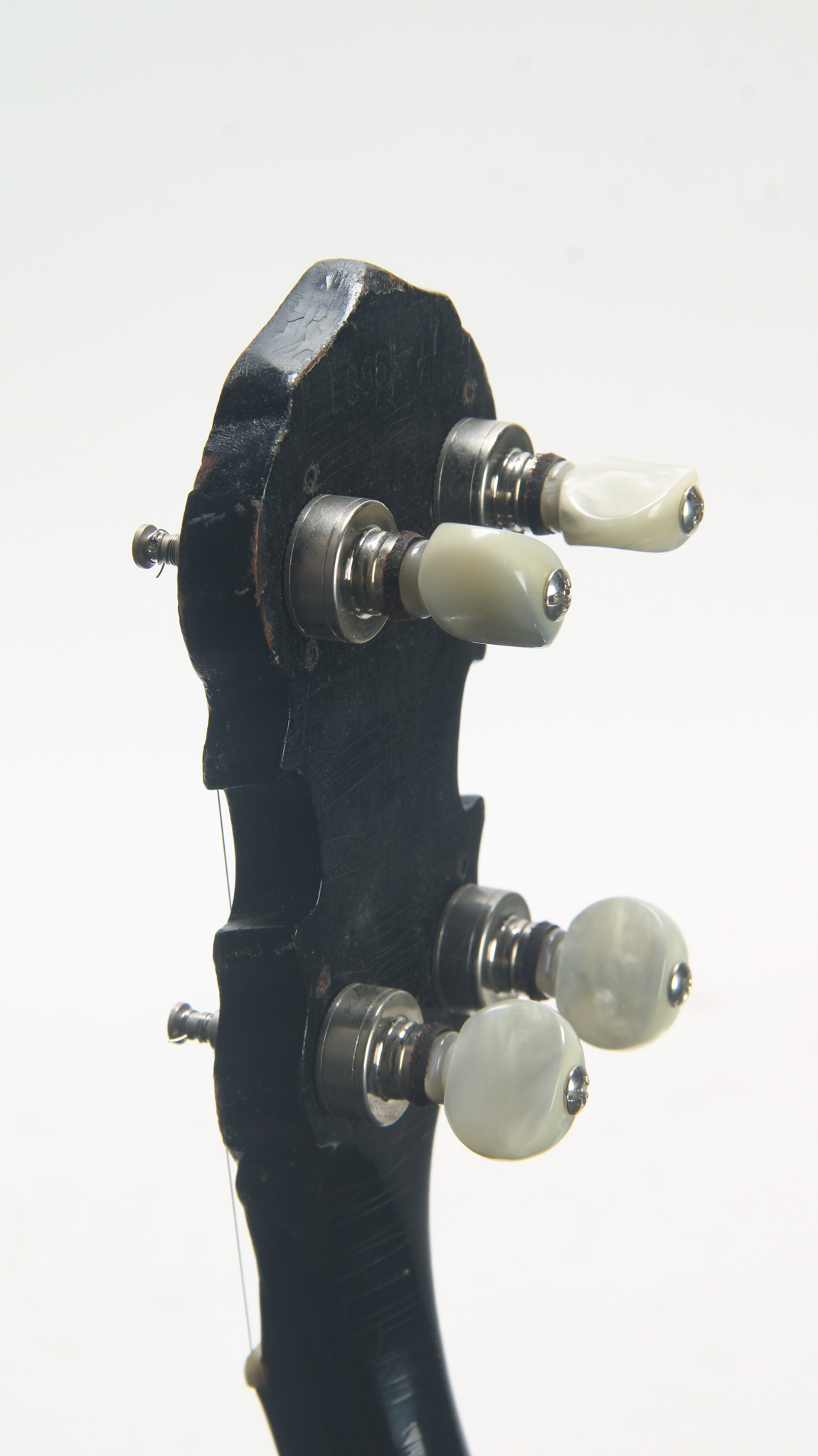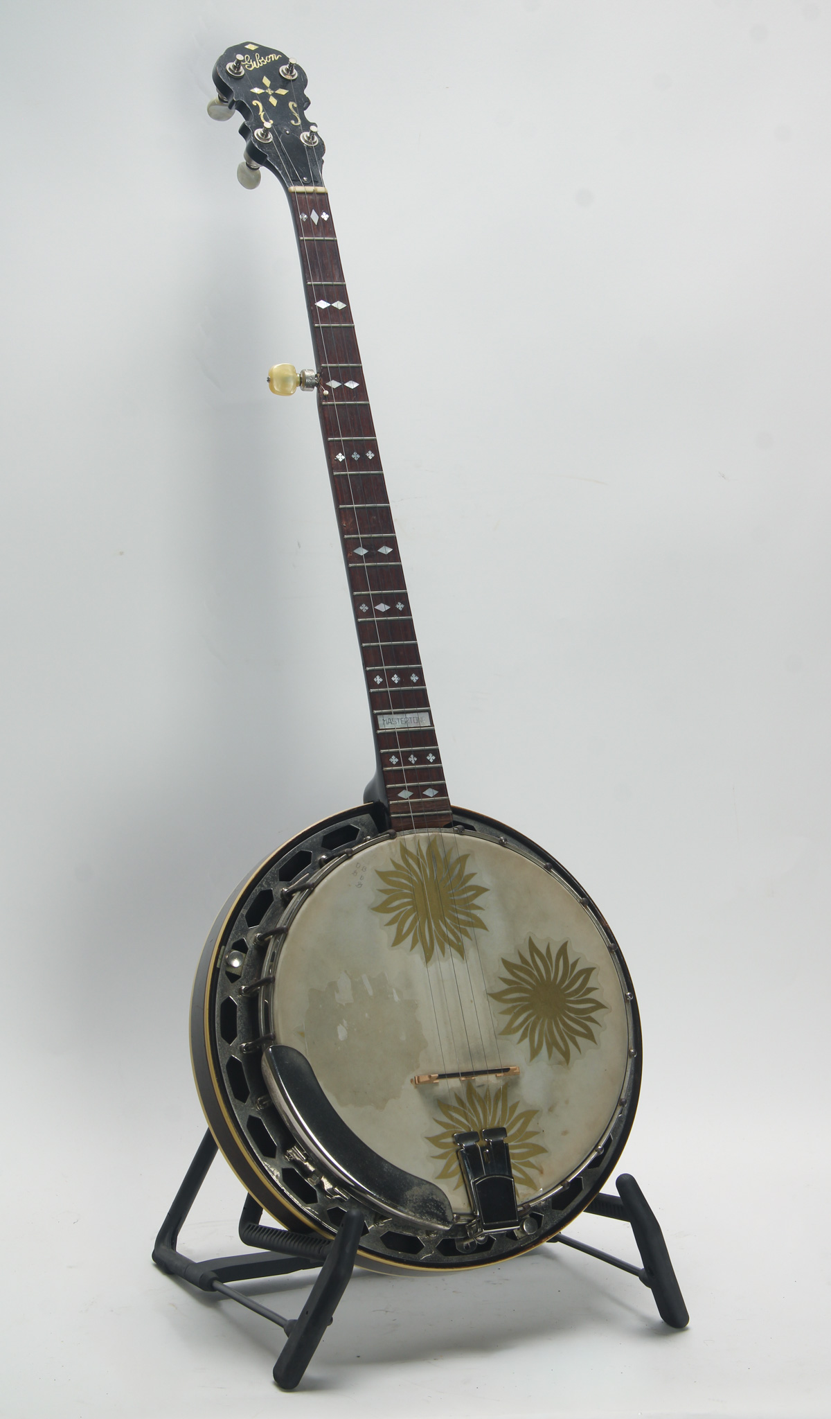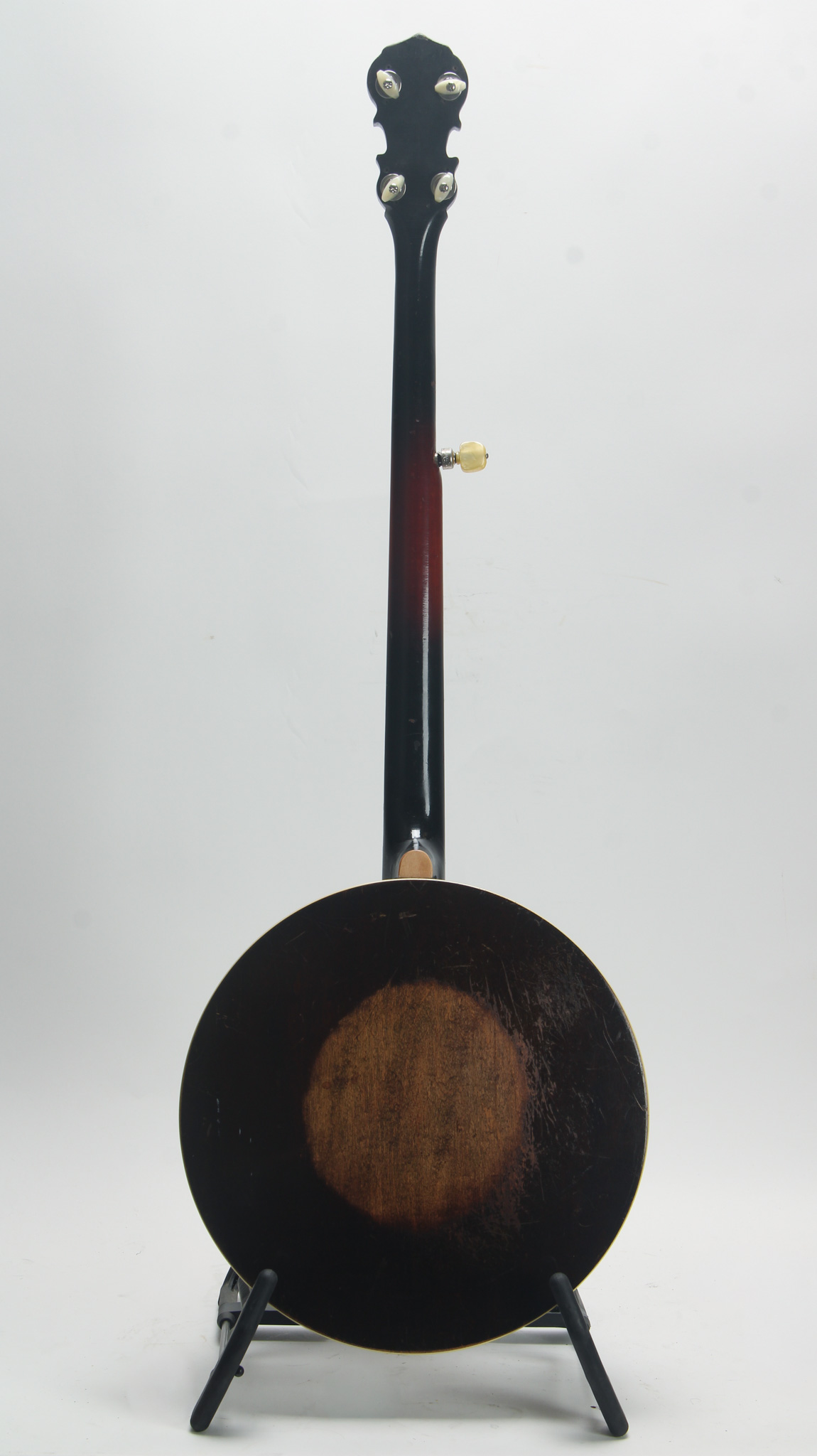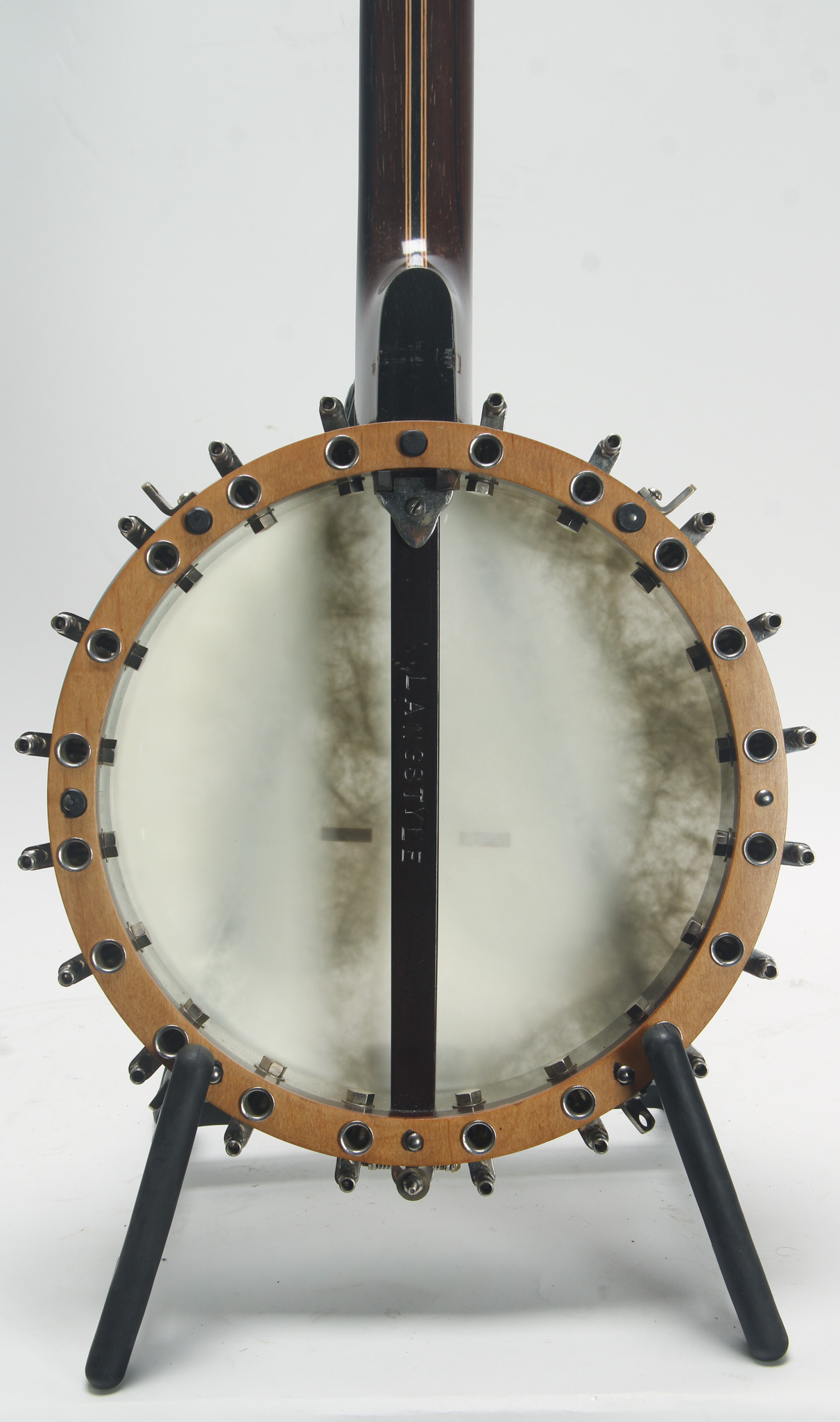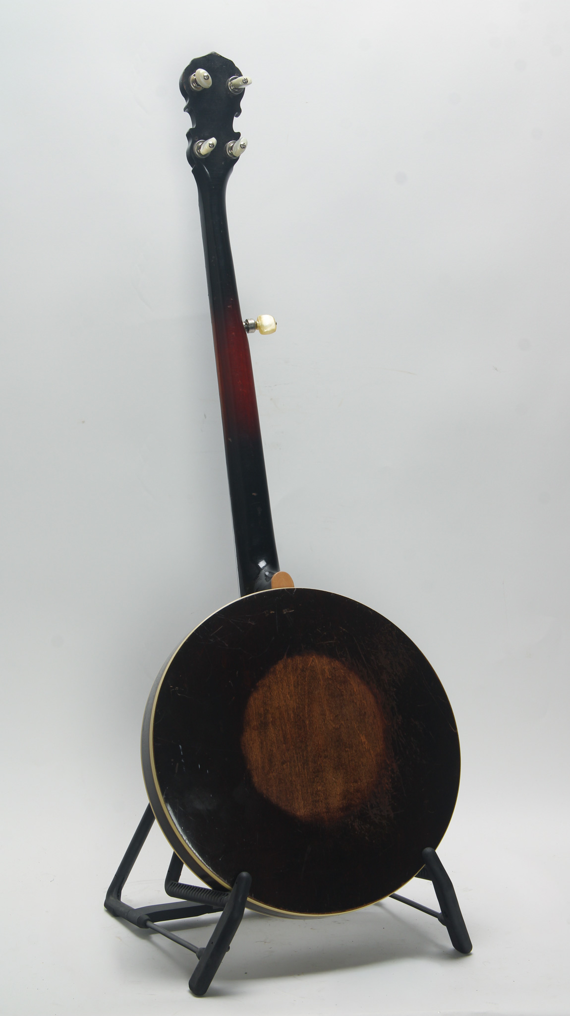 Excellent lightweight festival banjo employing an original style 150 rim assembly, and a higher grade RB-250 five string neck. The black painted 1/2" wide 11" diameter pot has a simple rolled brass...