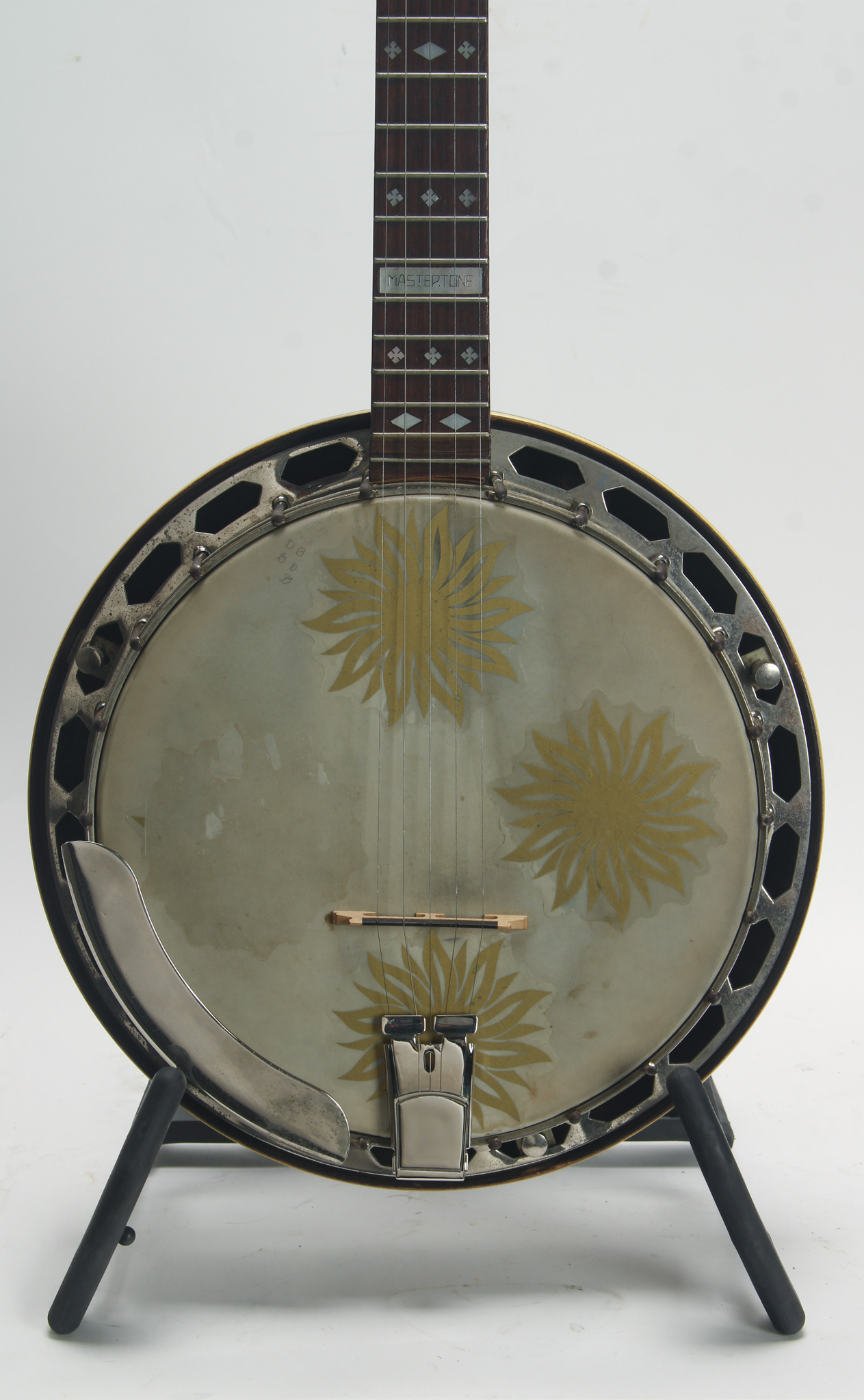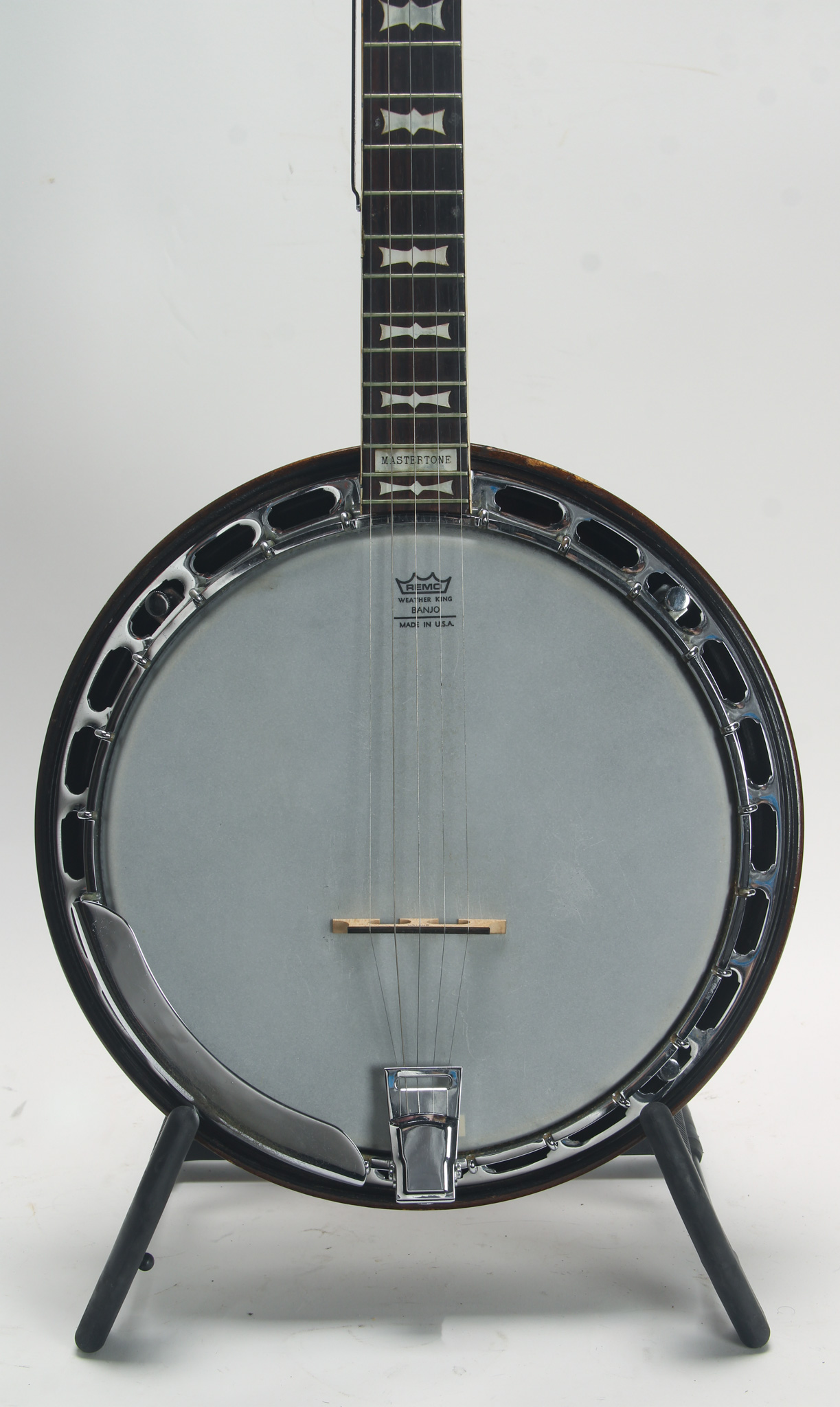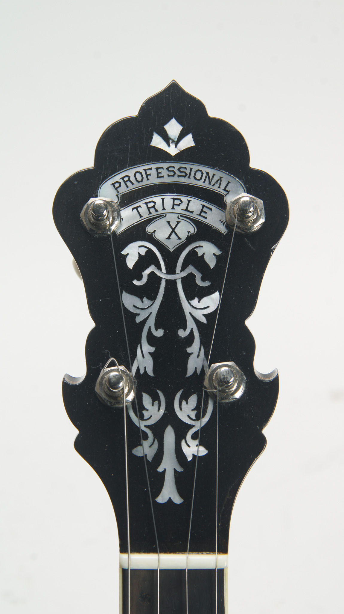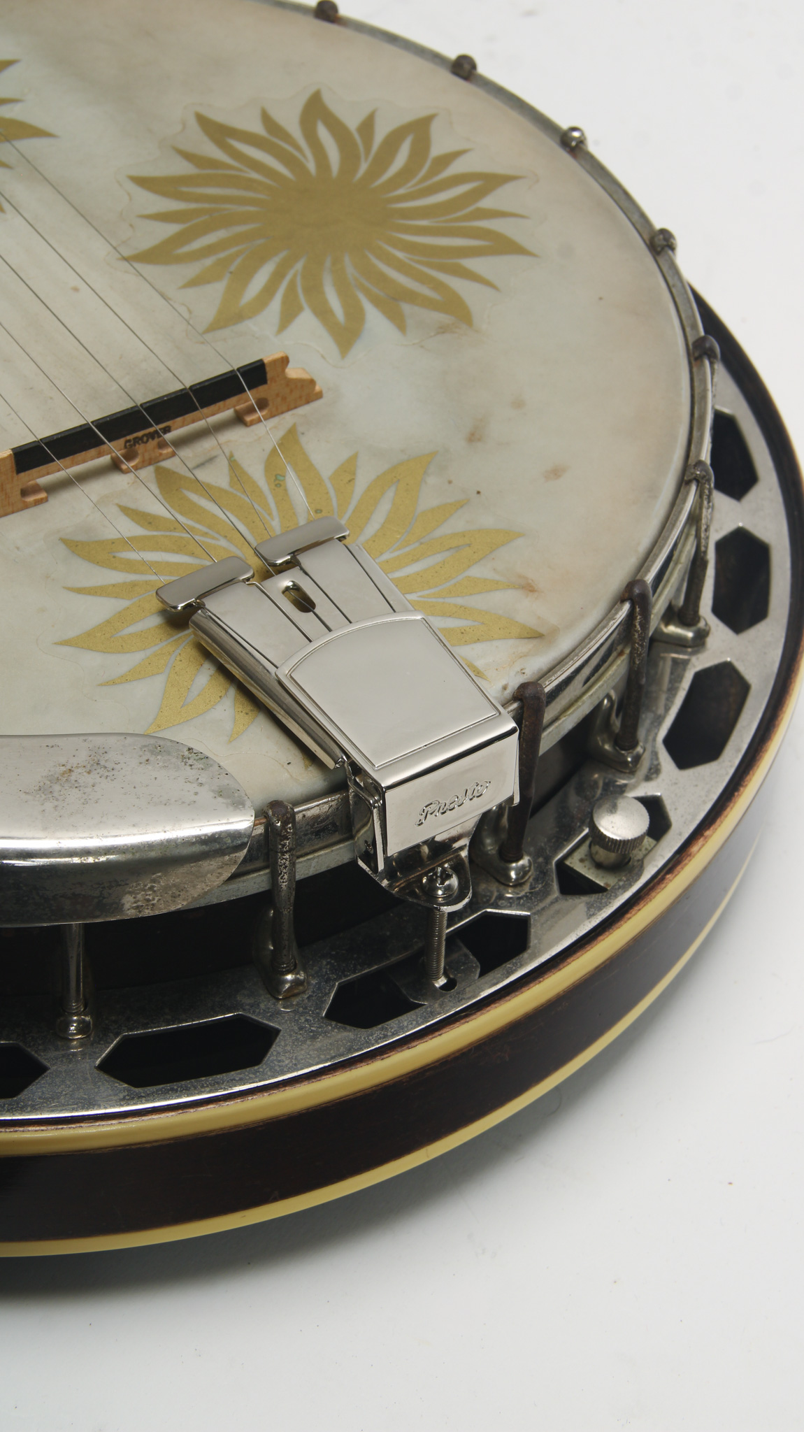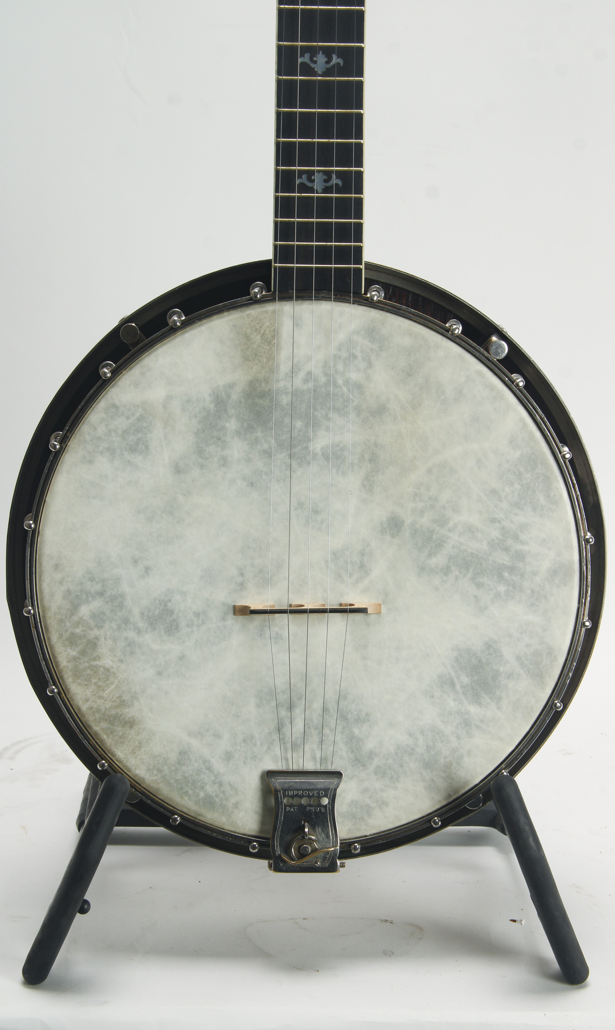 Excellent lightweight festival banjo employing an original style 150 rim assembly, and a higher grade RB-250 five string neck. The black painted 1/2" wide 11" diameter pot has a simple rolled brass...