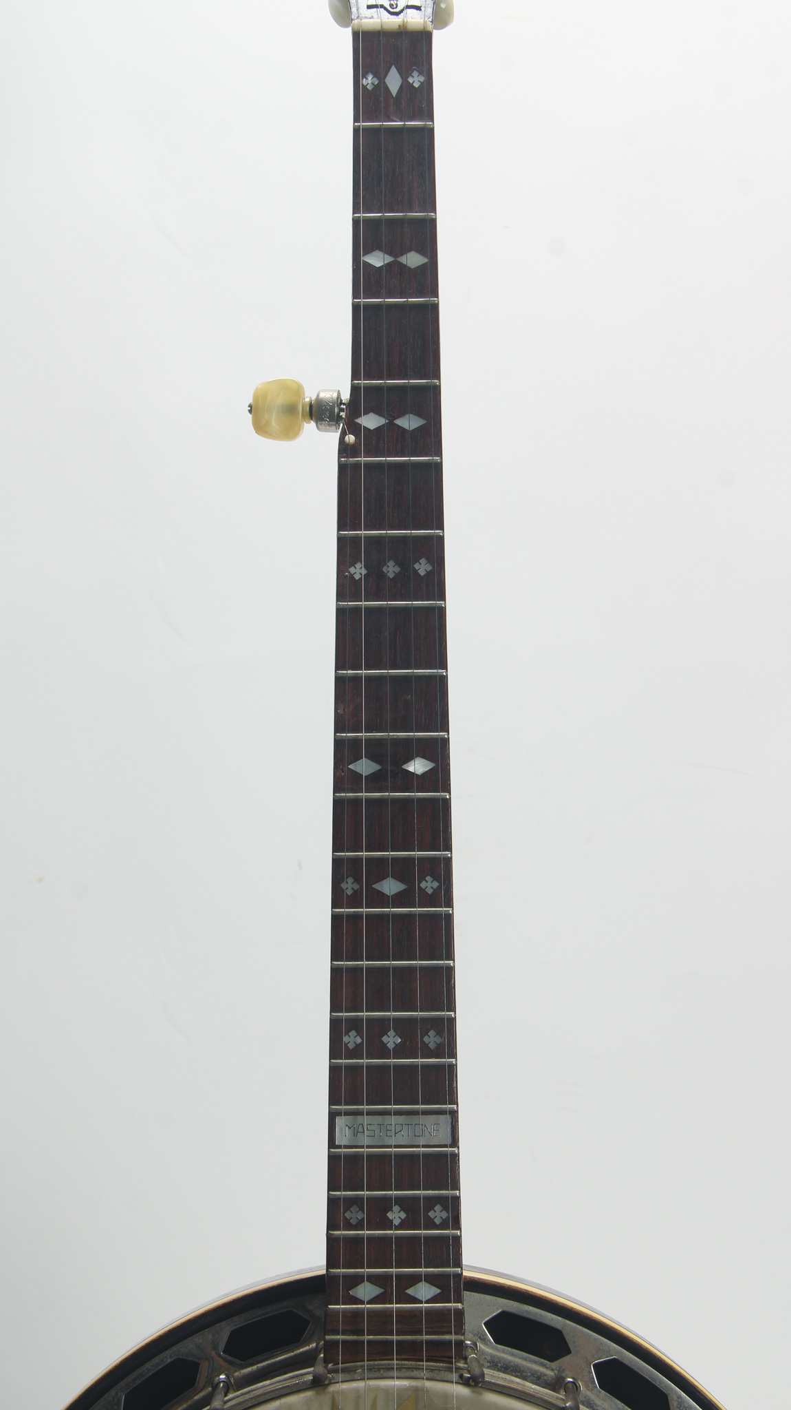 Well-executed, light-weight conversion to five string utilizing an original Gibson mandolin banjo rim assembly, and upgraded original five string Gibson KRB neck. The MB-1 rim assembly measures 10.5"...