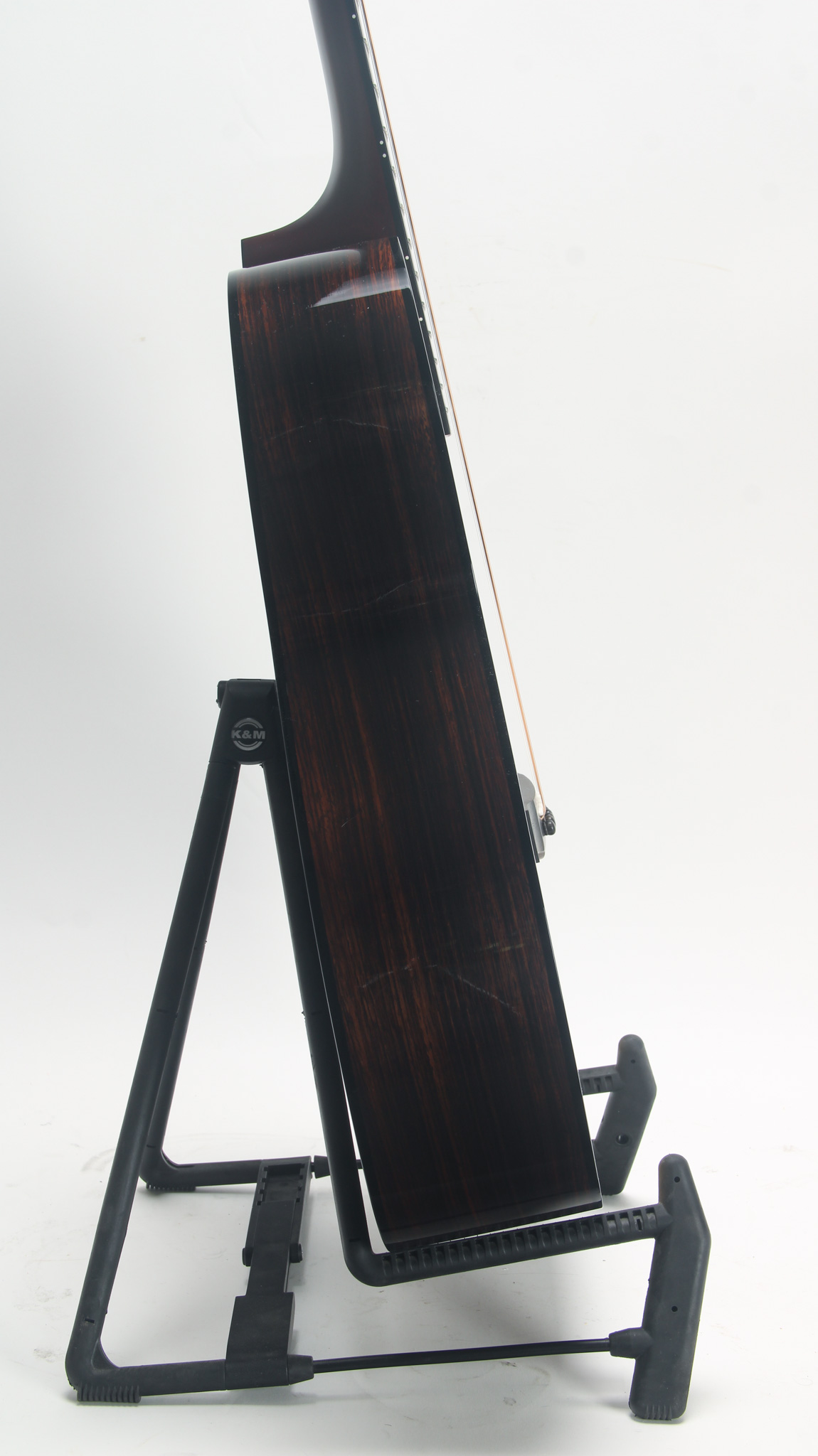 A nice dreadnaught with spruce top and lam sapele sides and back. This is a great flat top for a beginner or to have something to play around the campfire. Has a nice brown stained spruce top.