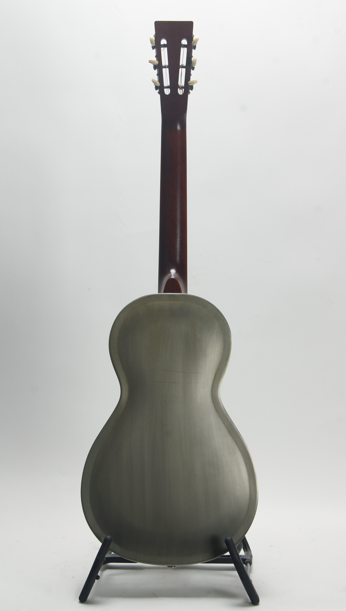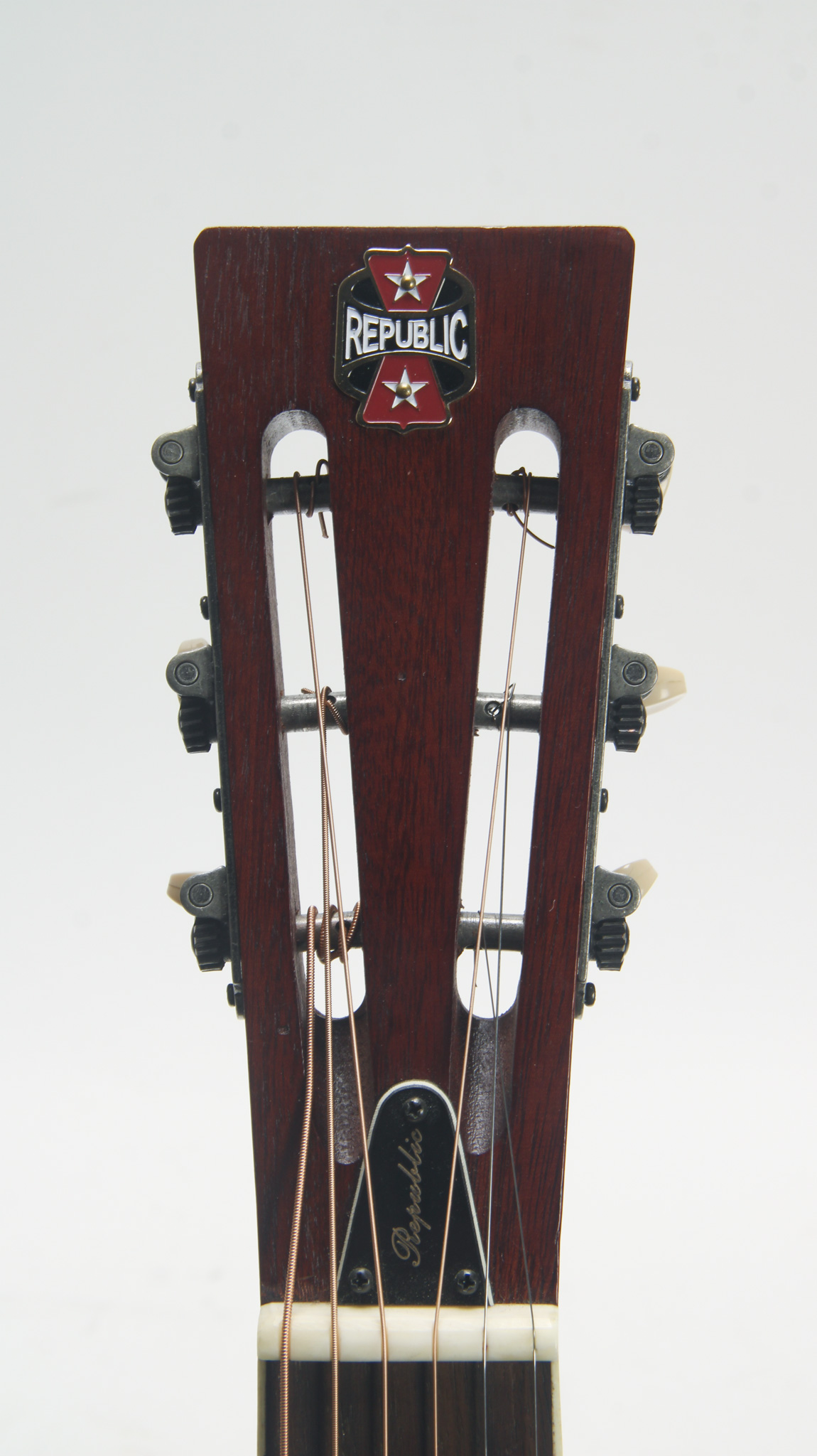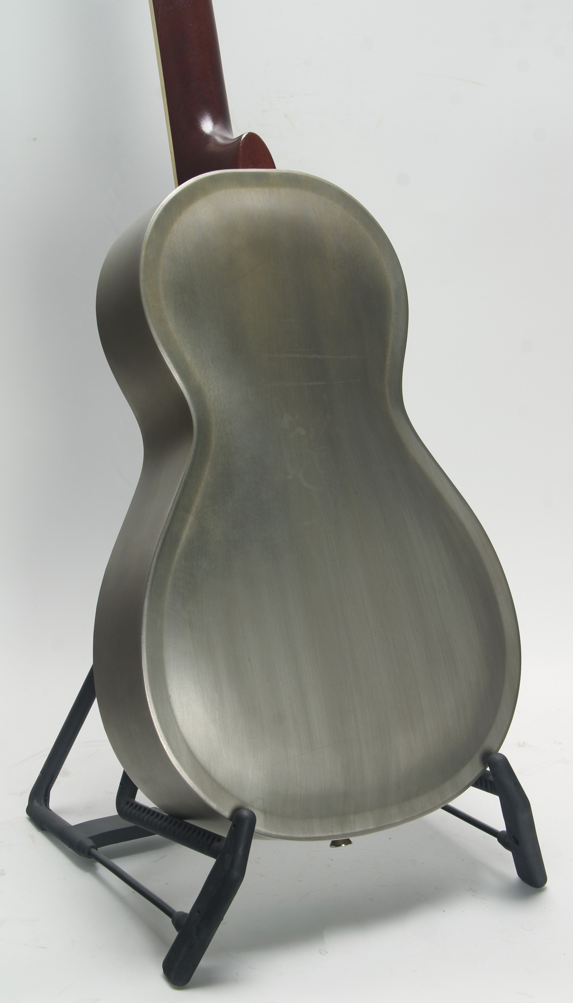 A used Republic Parlor resonator guitar. Parlor sized stainless steel body, single cone guitar. This one sports a brushed steel finish with a diamond cover plate. Looks and plays like a baby blues...