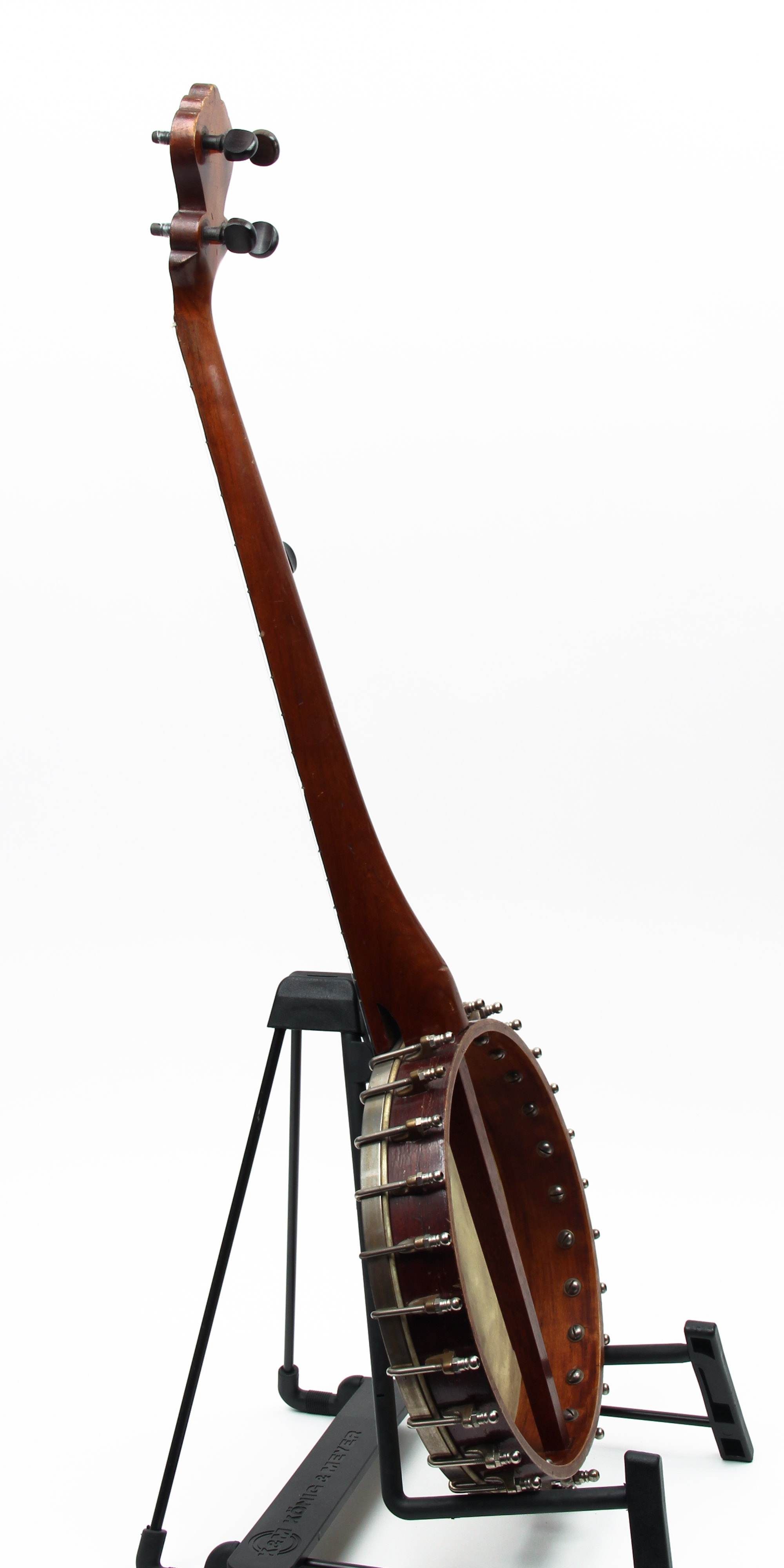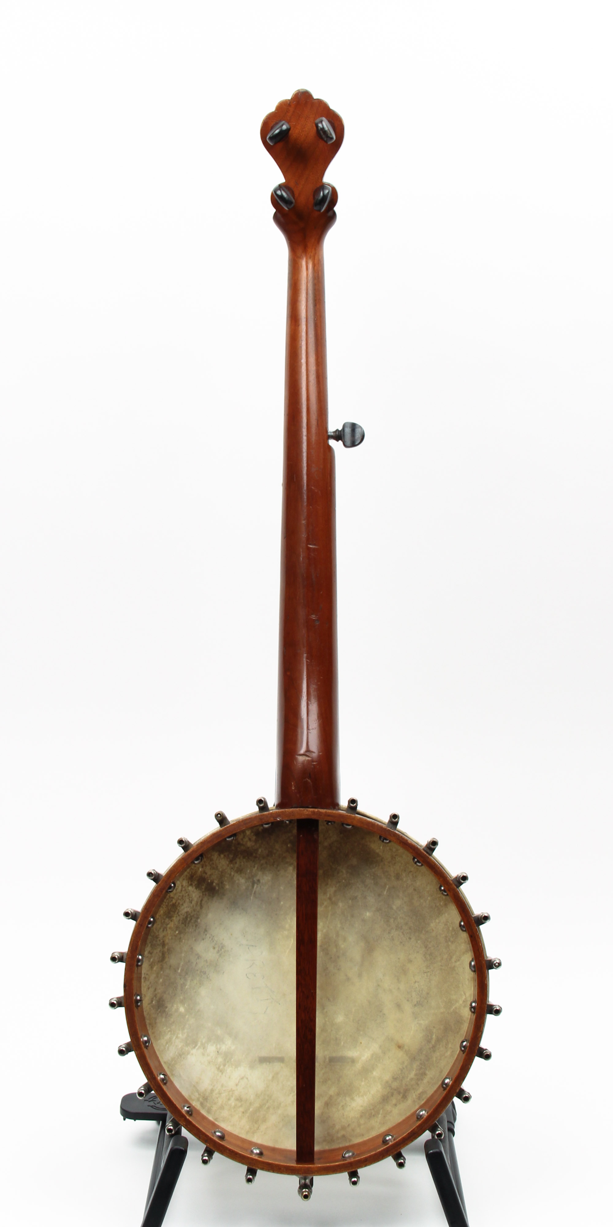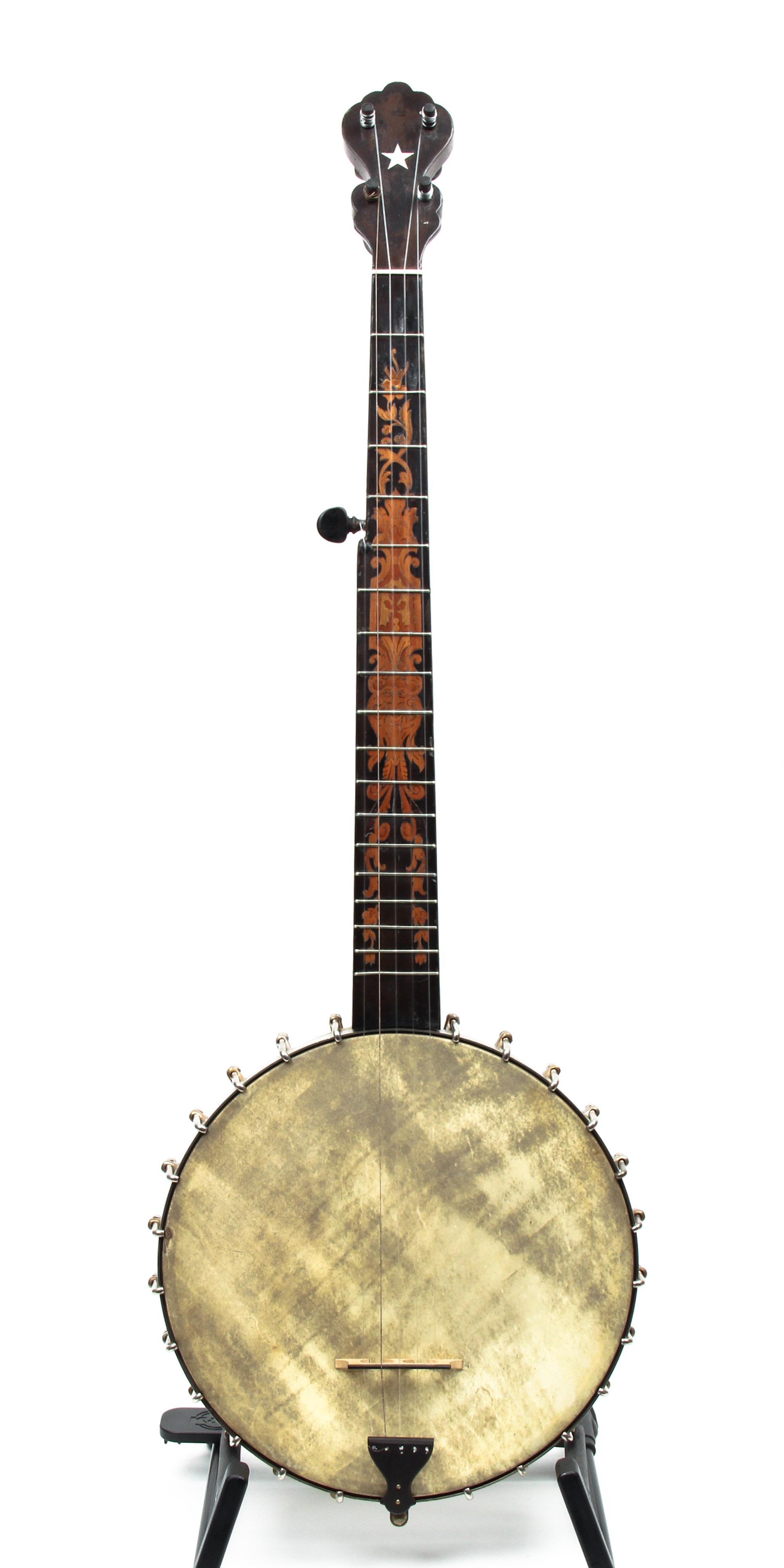 A very special wood rim Buckbee with ornate celtic inspired Green man marquetry on fretboard. Frets have been added to this banjo, which was originally fretless. Friction pegs, original ebony tailpiece present. Star inlayed in peghead.