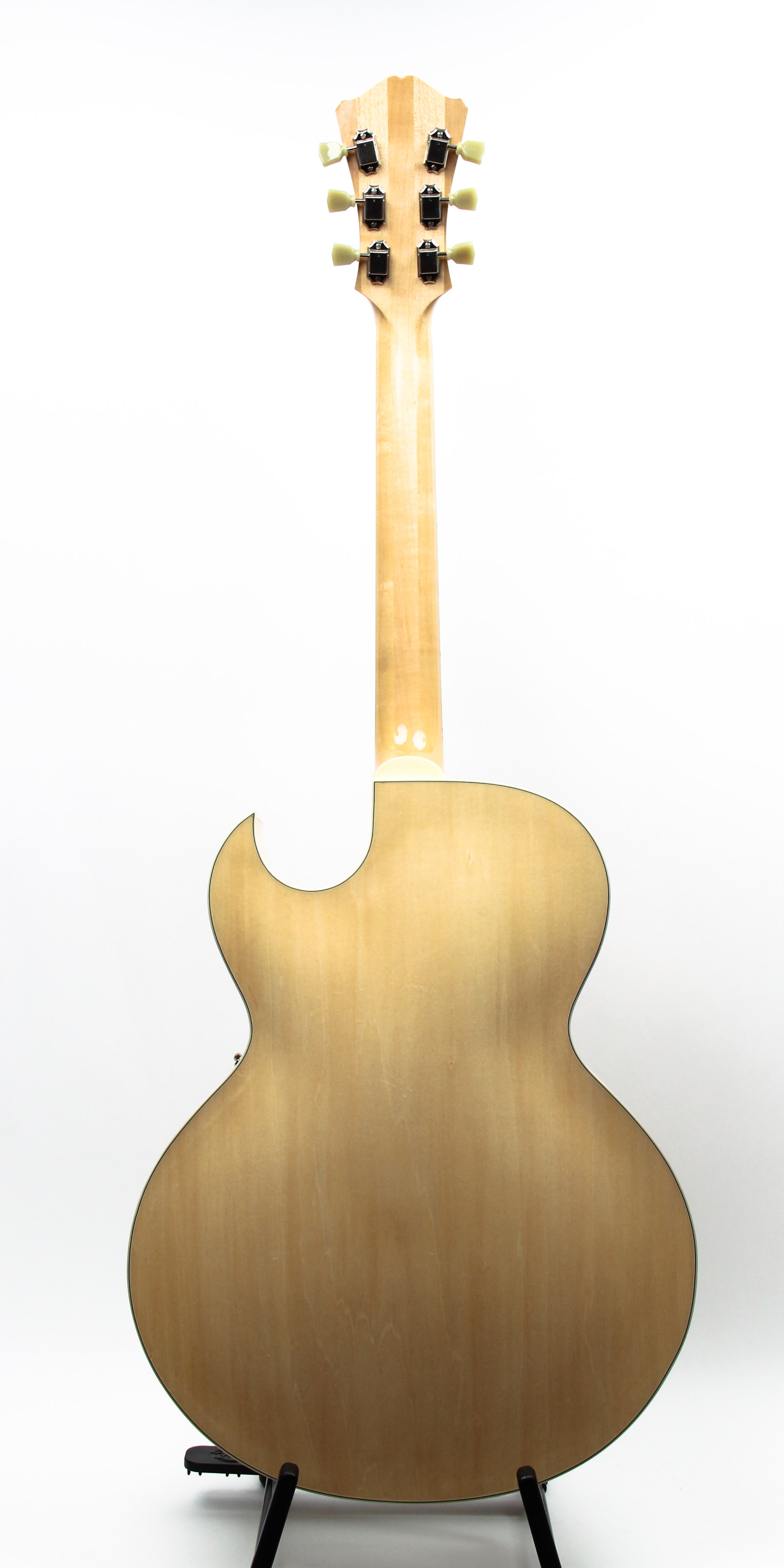 BLONDE FINISH!! This gorgeous guitar features a 16″ maple laminate body construction with tone bar bracing, and sunburst finish. Single humbucking pickup at the neck position, volume and tone controls, rosewood fingerboard and bridge and chrome trapeze tailpiece. A great, super affordable jazz box that is versatile across many genres and tastes. Its a very playable animal, it feels like an ES 335 neck on a full hollow guitar with great response from the stock single humbucker pickup. 24 7/8" scale and 1 3/4" nut. This example is slightly used with a small ding on the top by the trapeze bridge.