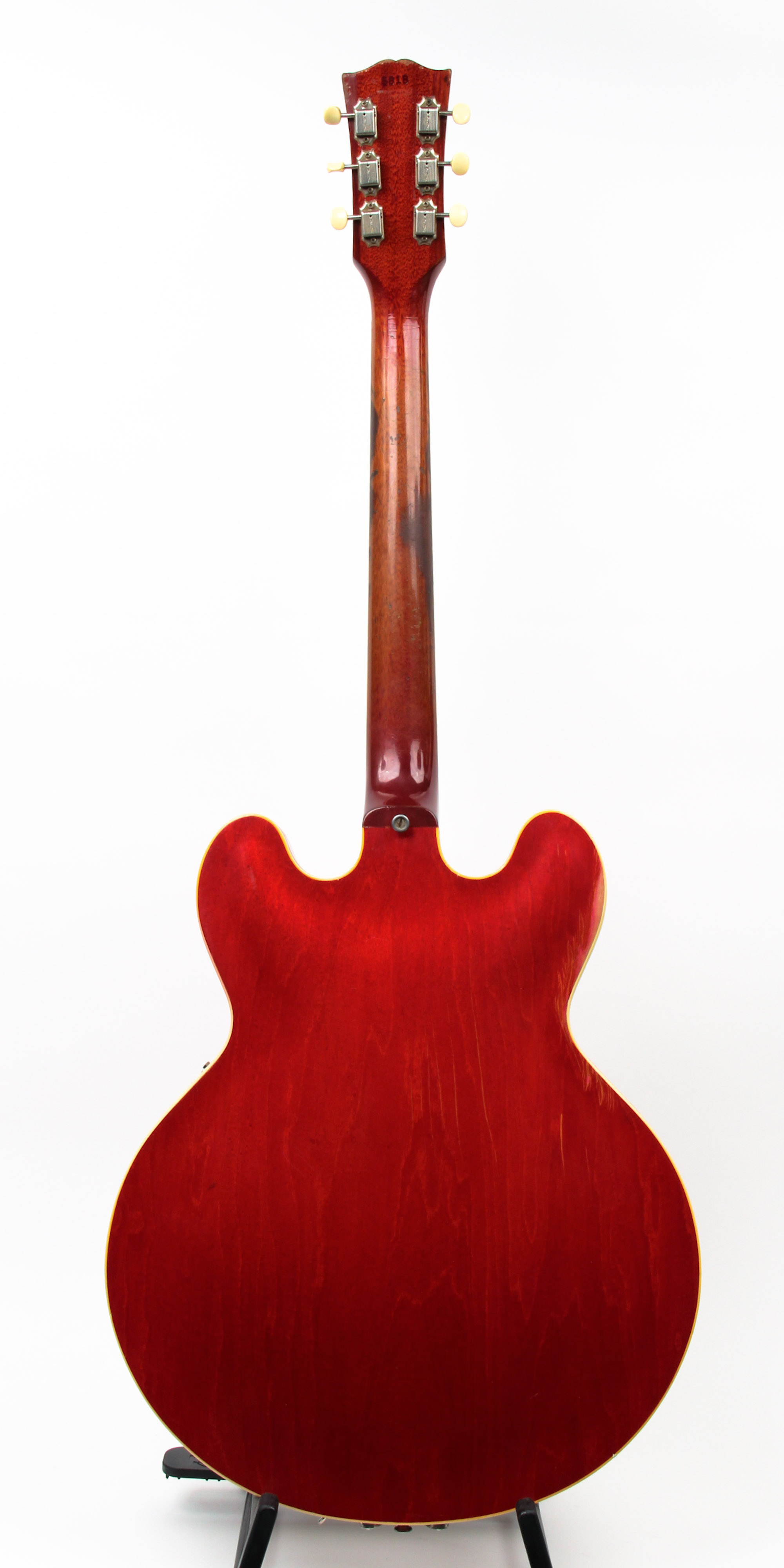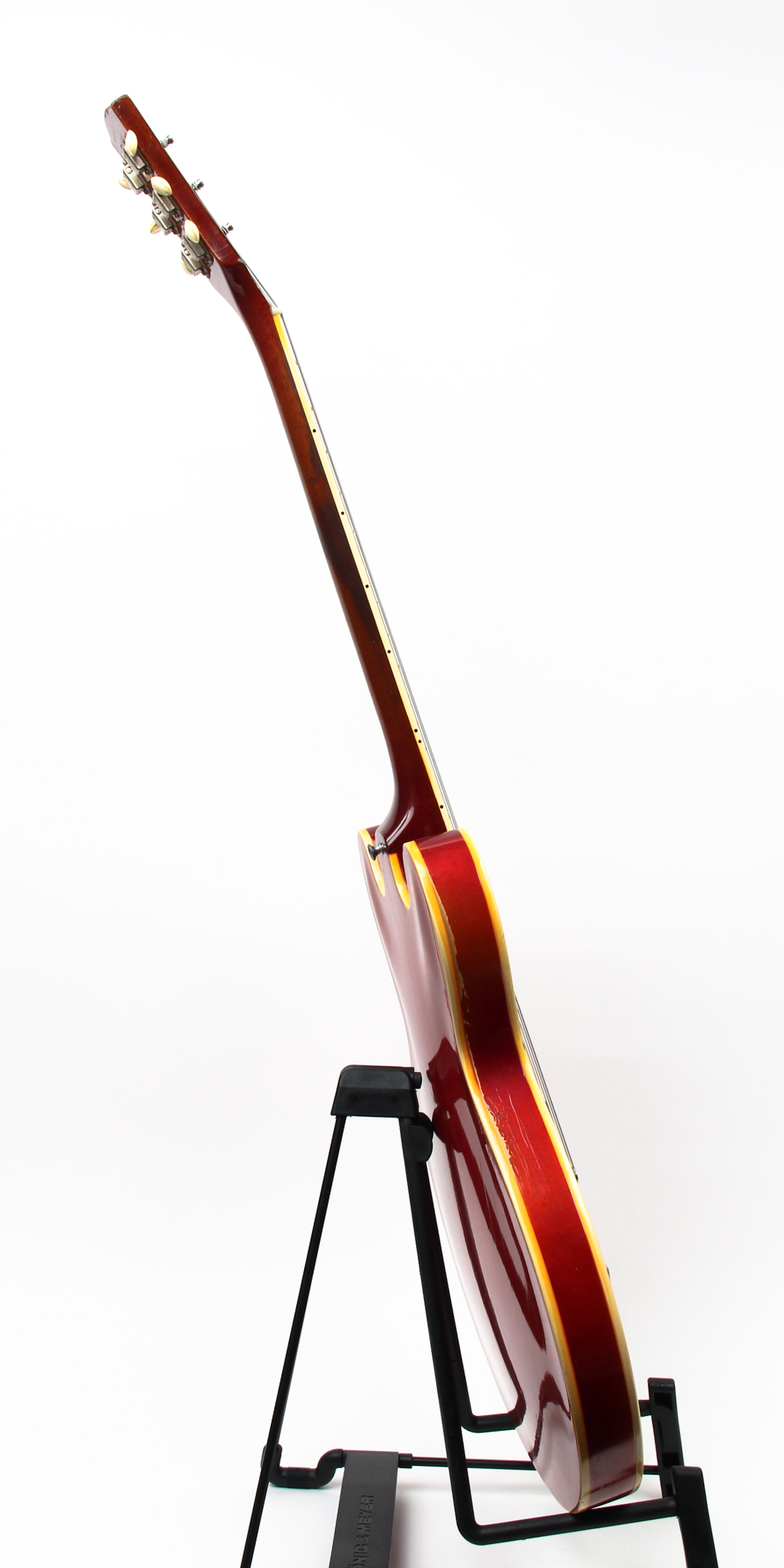 First year Cherry red finish, with custom ordered sideways vibrola. Dead straight rosewood neck, guitar is in excellent structural condition. Cosmetically, checking is present, and some discoloration on the sides and back upper left corner. Standard black plastic P-90 pickups, tune-o-matic bridge, bound top, back and fingerboard, and dot inlays. A fantastic player, as well as looker. Newer Gibson TKL case with pink interior/dust cover.
