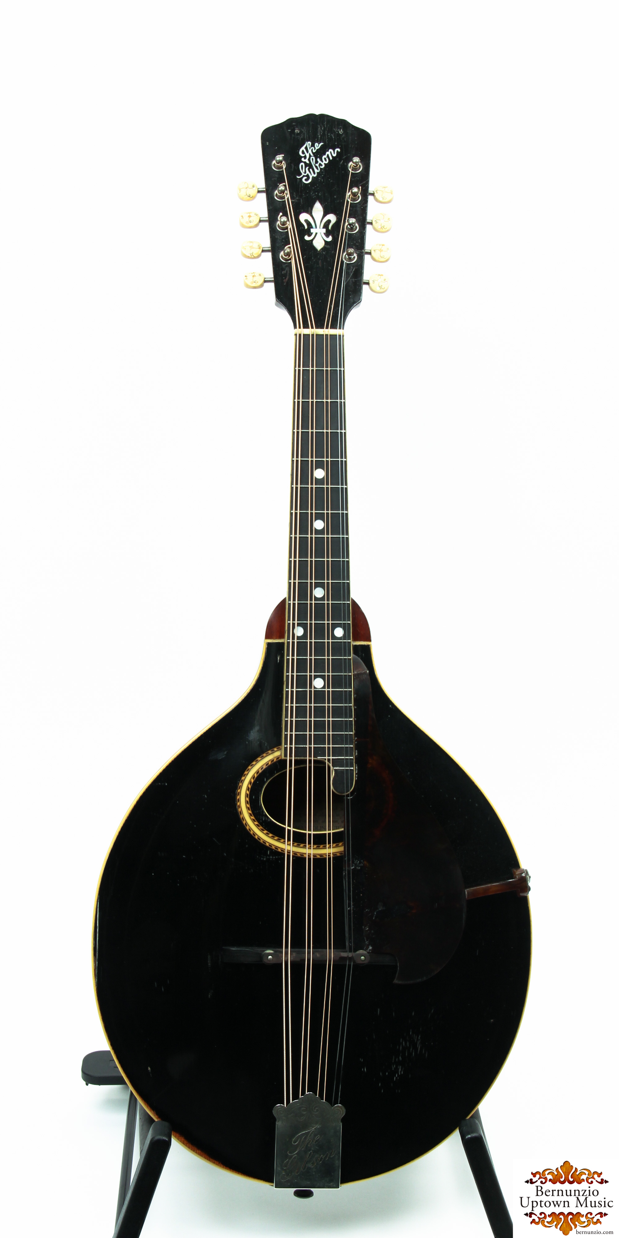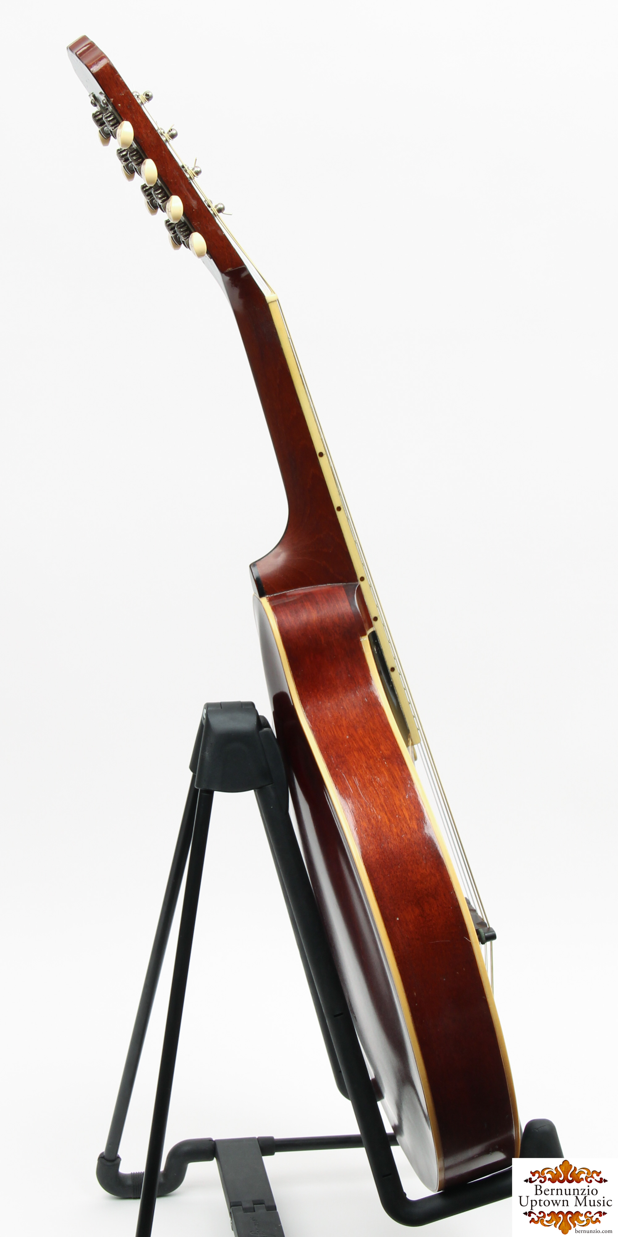 This is an all original mandola (tuned C G D A used in mandolin orchestras to play the "viola" voice). The top is opaque black finish with good arching. The back and sides are red stained birch. The neck is fitted with original Handel style tuners which hold the tuning quite well. A small section of the back has been filled and reglued but is structurally sound. The neck is straight and true and the frets show little wear. The original pickguard is present but has some decay and has been retired to the case. The original single piece bridge was replaced at some point with a 1920s patented adjustable bridge. This is a fine playing mandola with its original hard case.