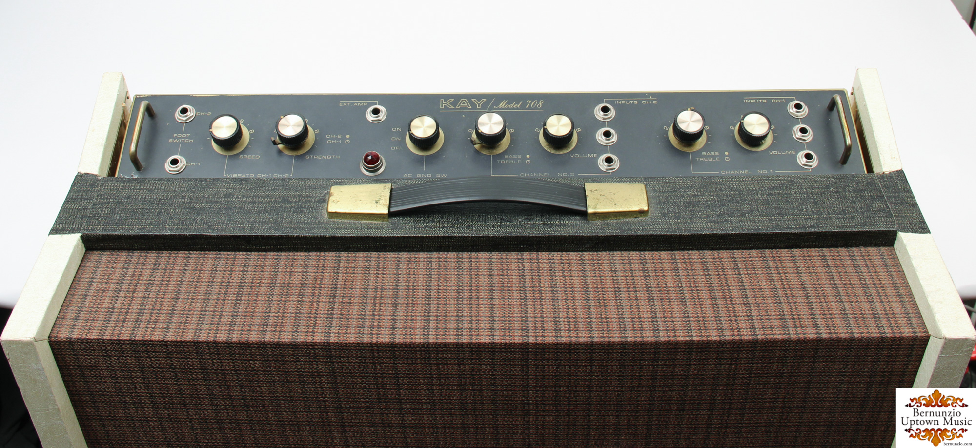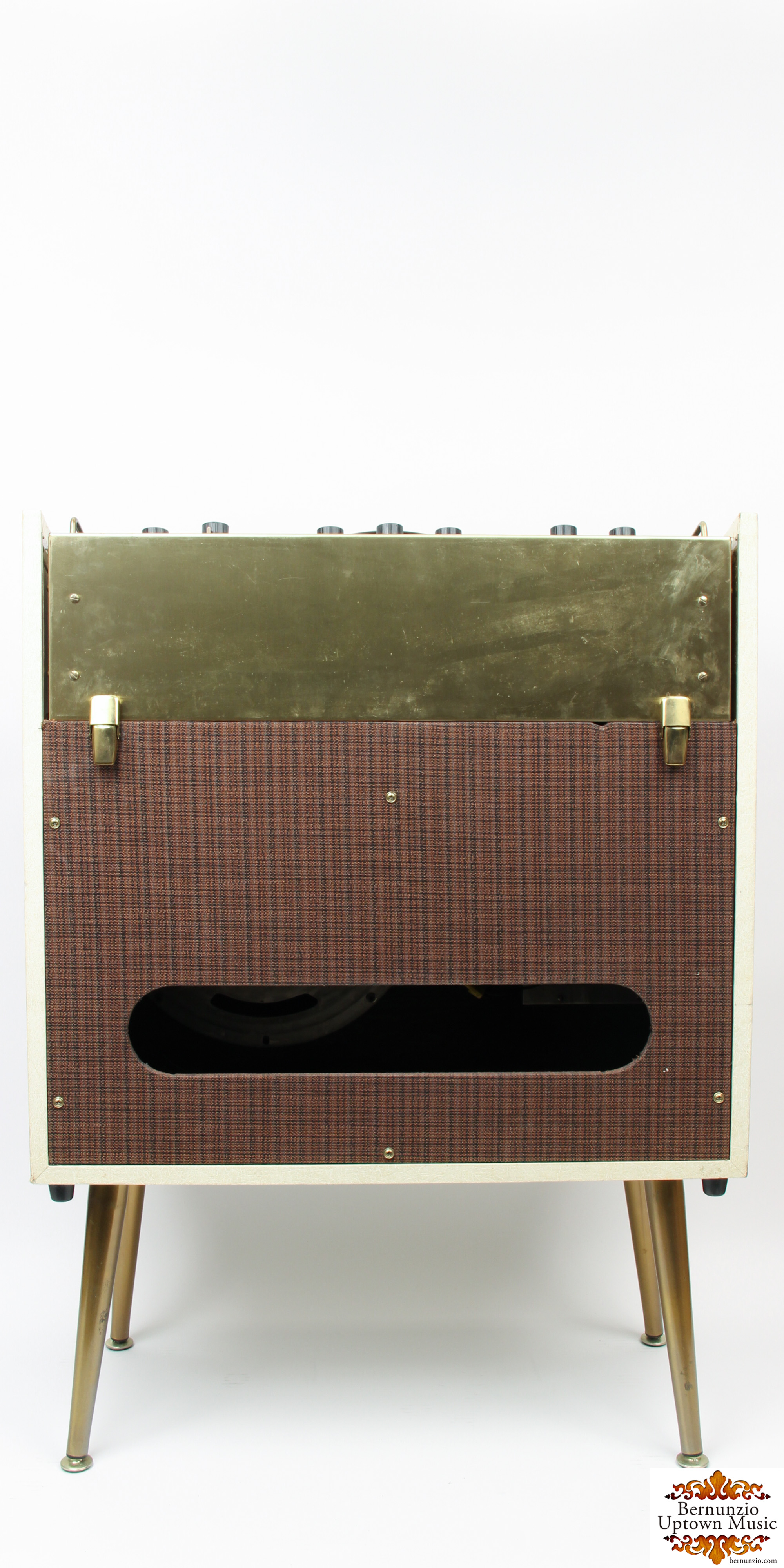 Kay introduced their line of "Transistorized Amplifiers" in the late 1960's, with the Model 708 "Galaxie II" sitting at the top of the line. The most notable design aspect is certainly the removable chassis, which is secured to the top of the cabinet with clasps, and can be placed up to 25 feet away from the speaker by way of a cable. Removable brass console-style legs are present giving this unit a "space-age" mid-century look. Original 12" "Special Purpose Speaker" is present, 35 watt output, two channel inputs with corresponding foot switch inputs, bass/treble eq, vibrato. Recently professionally gone-over, the Galaxie II features 11 transistors, and 8 diodes. In excellent condition, handle is original and sturdy.