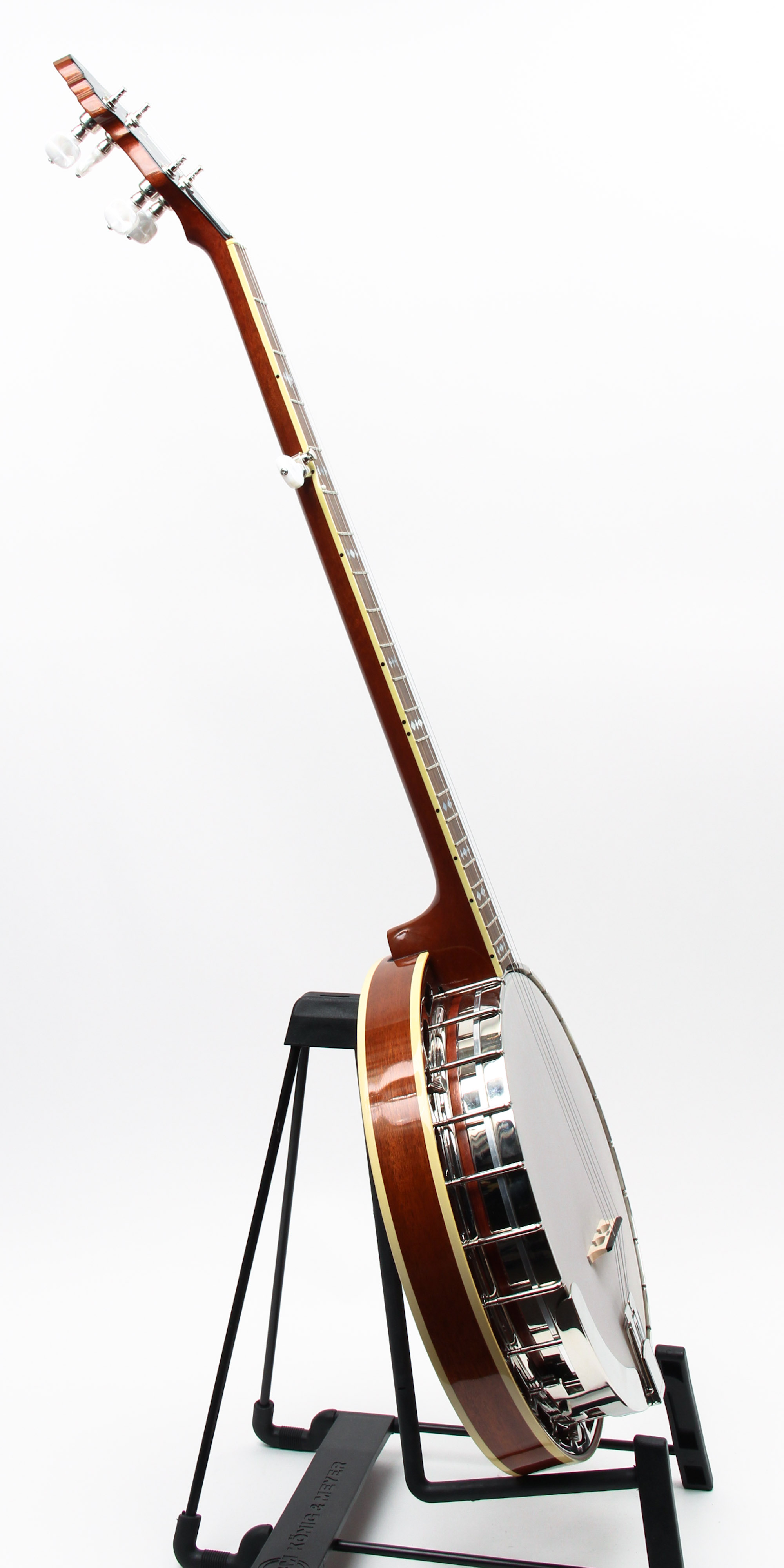 We were really impressed with these banjos when they were introduced at the Winter NAAM show. They are hand-built in the USA with high-end features like a Honduran mahogany neck and resonator, diamond and square fretboard inlay and hand-rubbed nitrocellulose lacquer finish. The "dark" sound harkens back to the pre war banjos favored by players around the world. The M7 will hold its own against any top shelf banjo on the market.