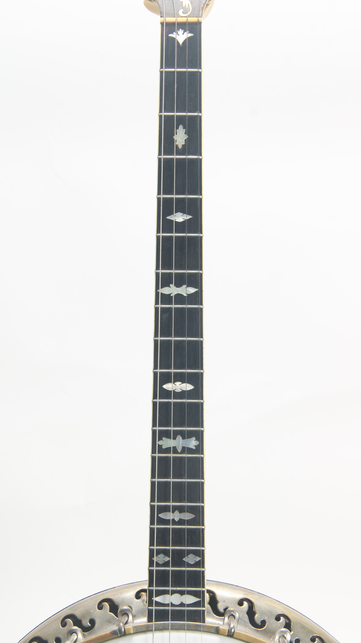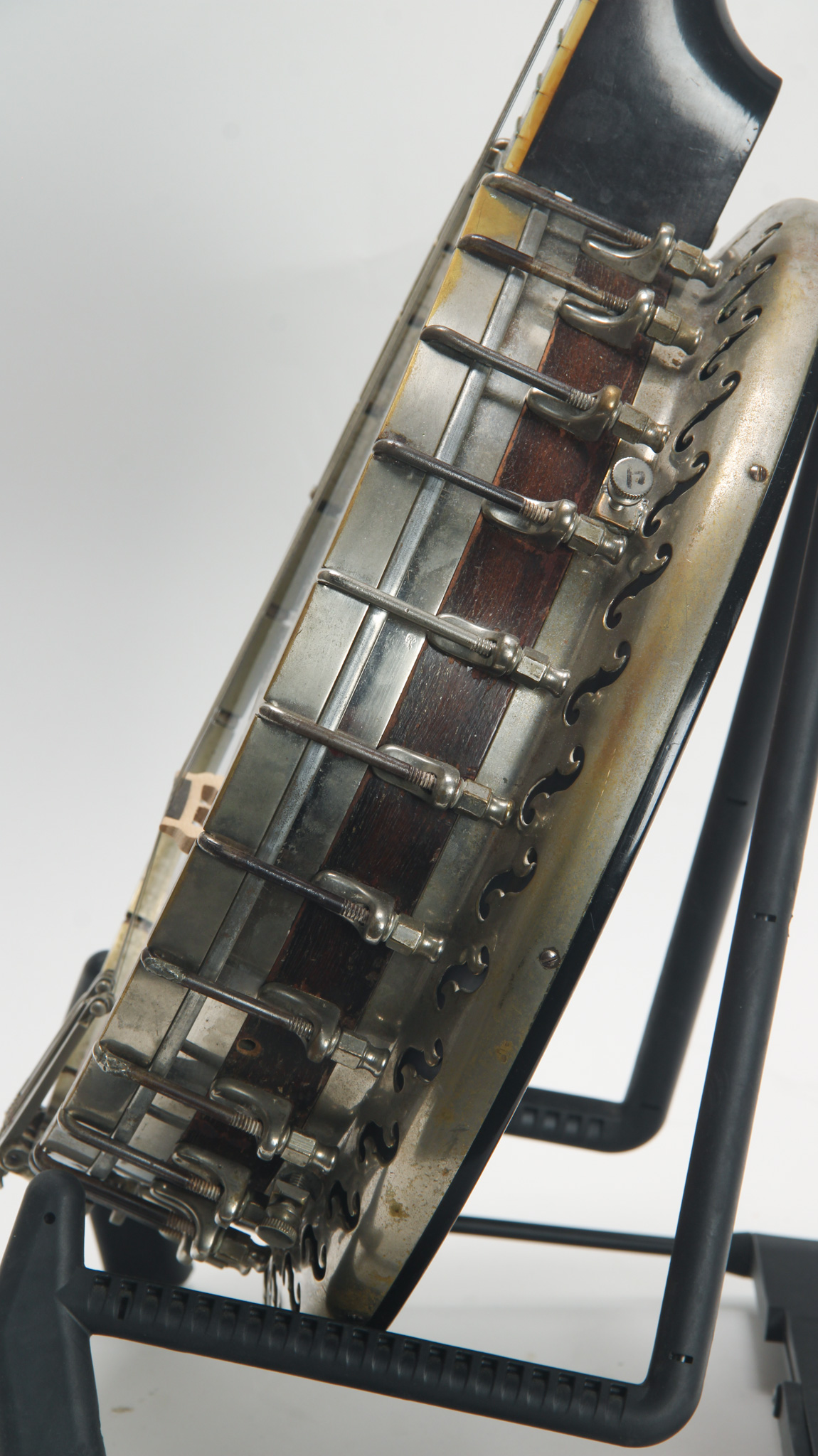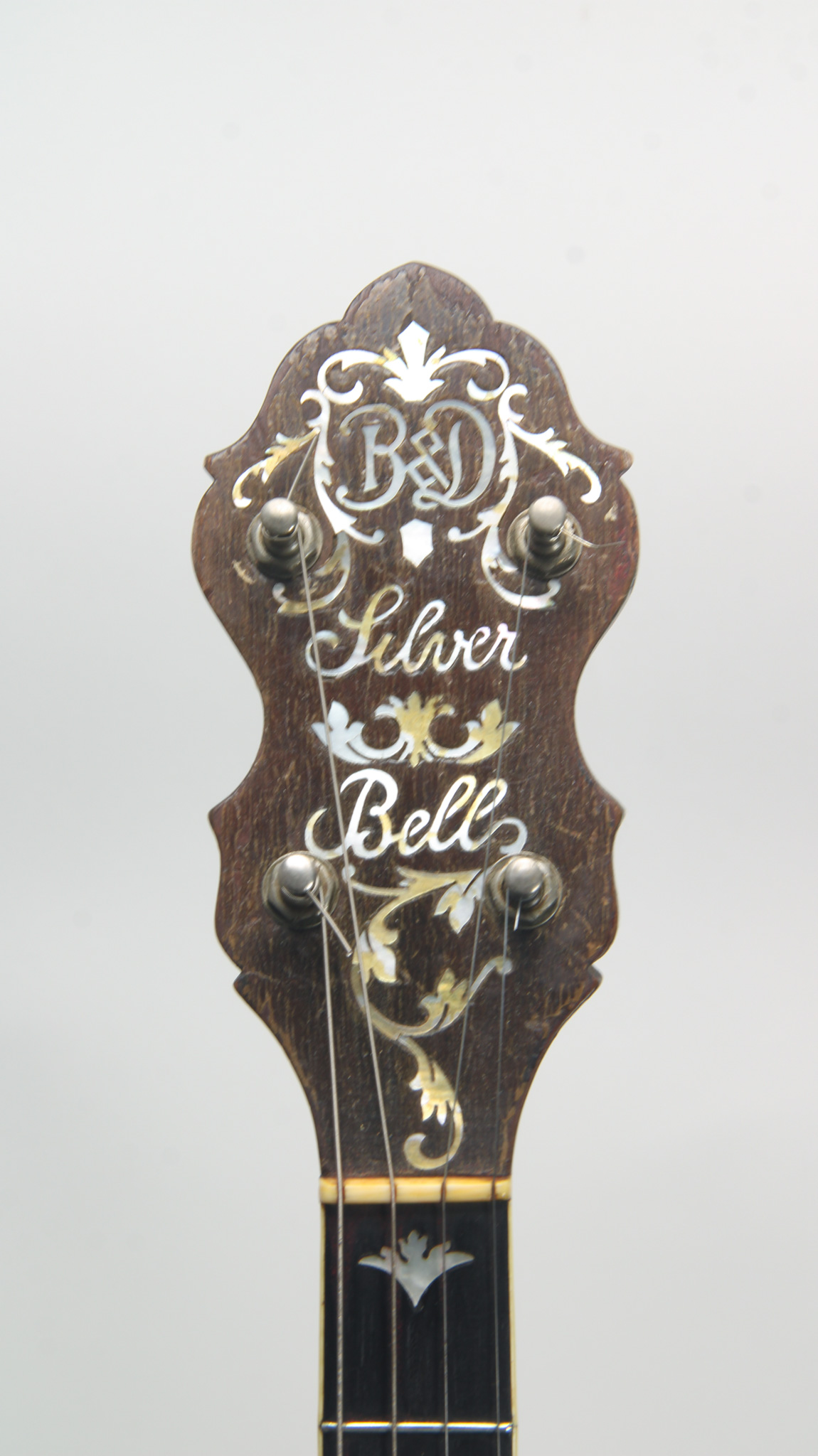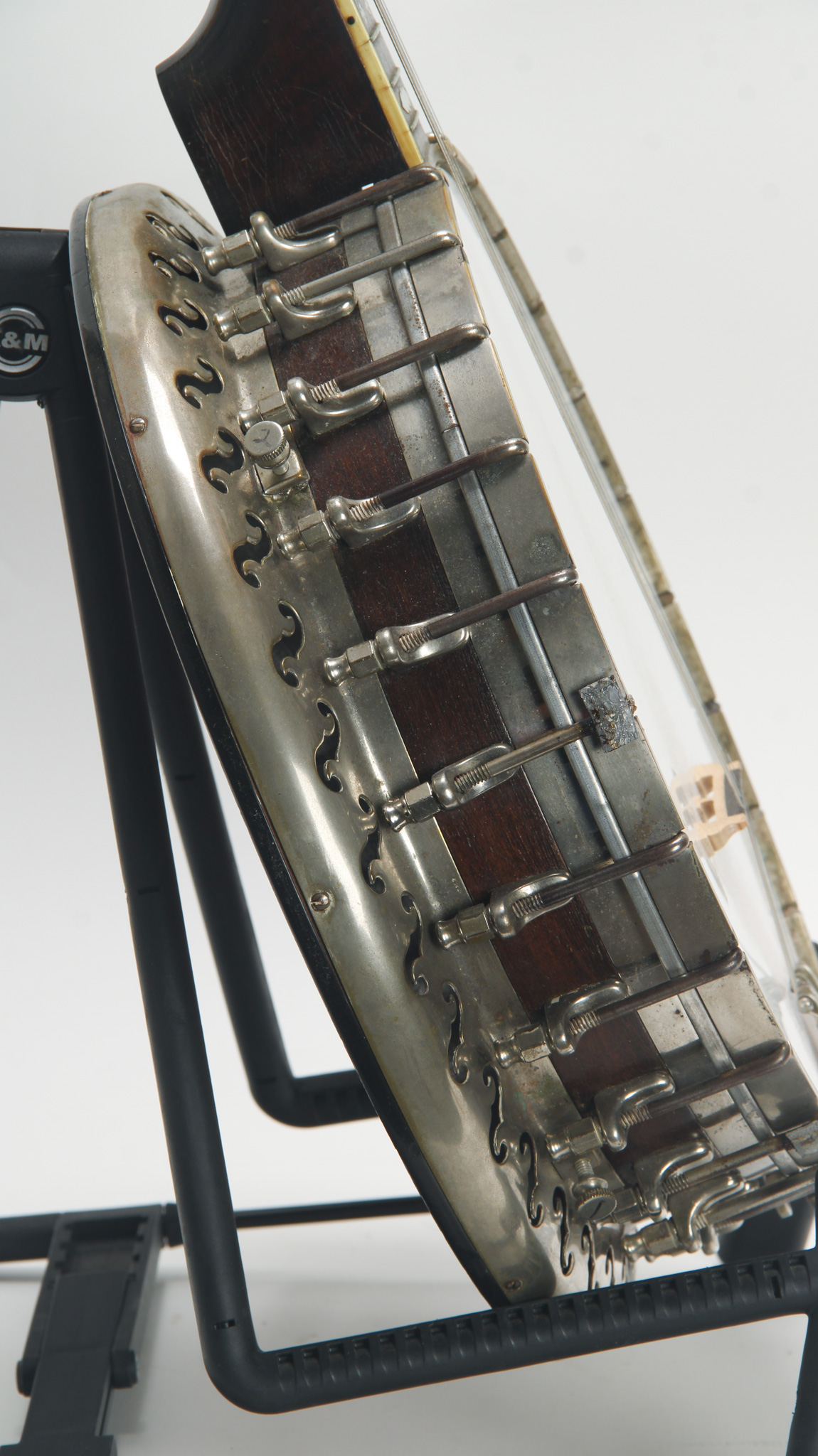 Player's example of a Silver Bell No. 1 19 fret tenor, from the Bacon Banjo Co., who were operating out of Groton CT at the time of this banjo's manufacture. The 11" rim assembly features all original hardware down to hooks and nuts, Oettinger tailpiece, Silver Bell tonering, with square resonator nub broken from f hole flange, and hook-mounted armrest ends present on hooks (armrest in case pocket); stained maple resonator with lots of plating and finish wear, with red Bacon label intact. The five piece maple neck has 19 frets, 23" scale length, 1-3/16" wide nut, with bound ebony board featuring pearl inlay; frets show mild pitting mostly in treble postion; large peghead shape with pearl inlay on face (finish checking and scratching present throughout neck), with large chunk of material absent from reverse; equipped with offset tab Grover tuners. Includes hard case, lots of exterior wear/missing handle.
