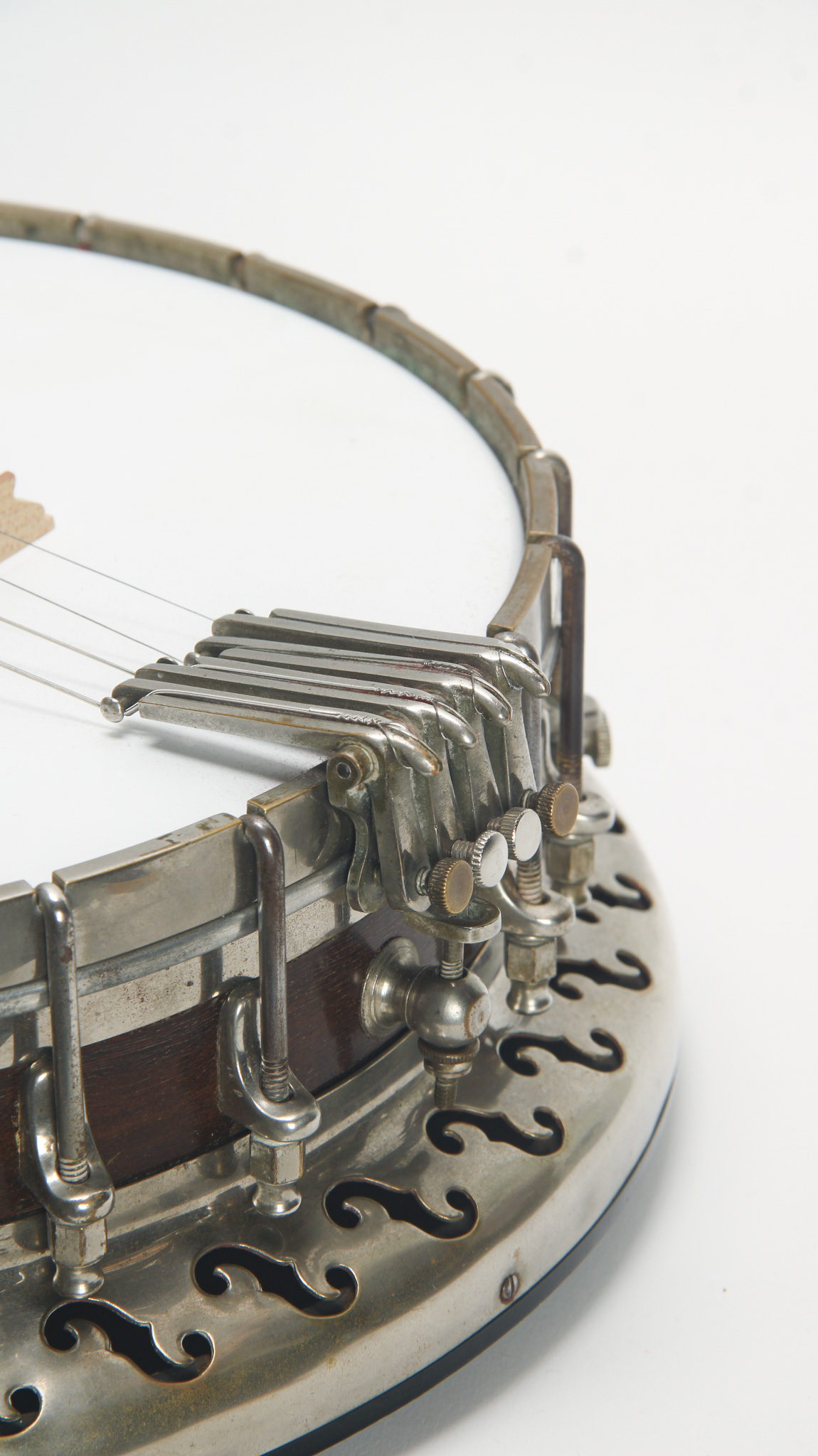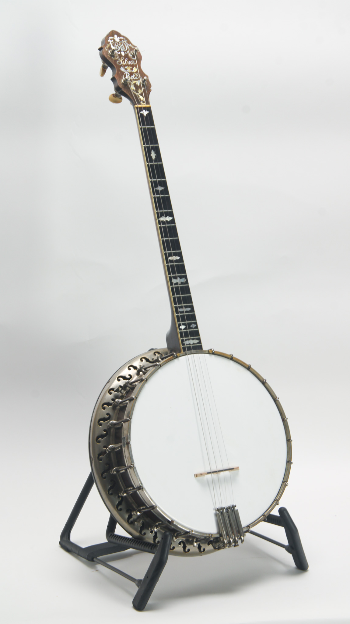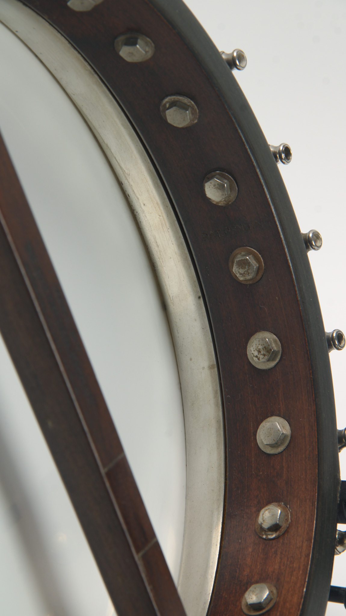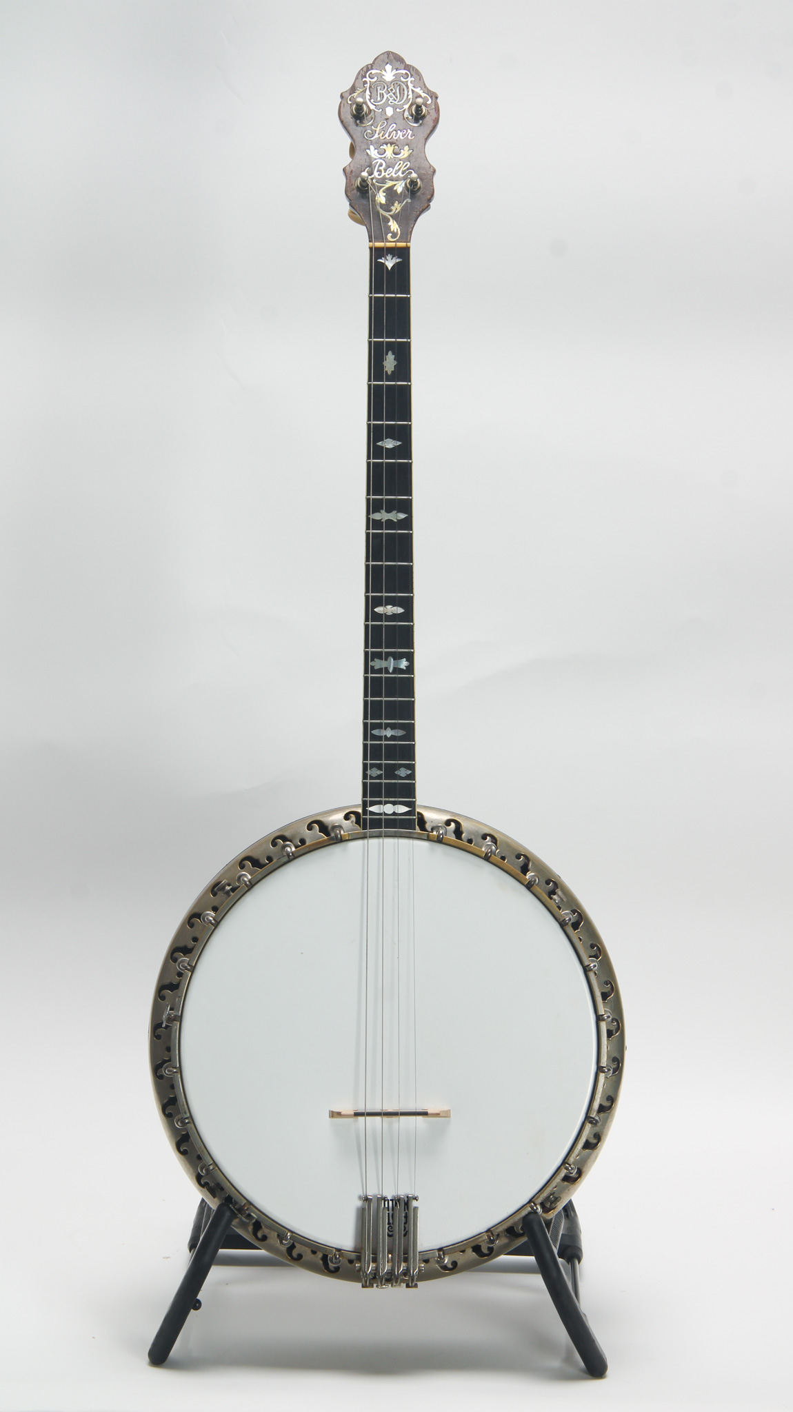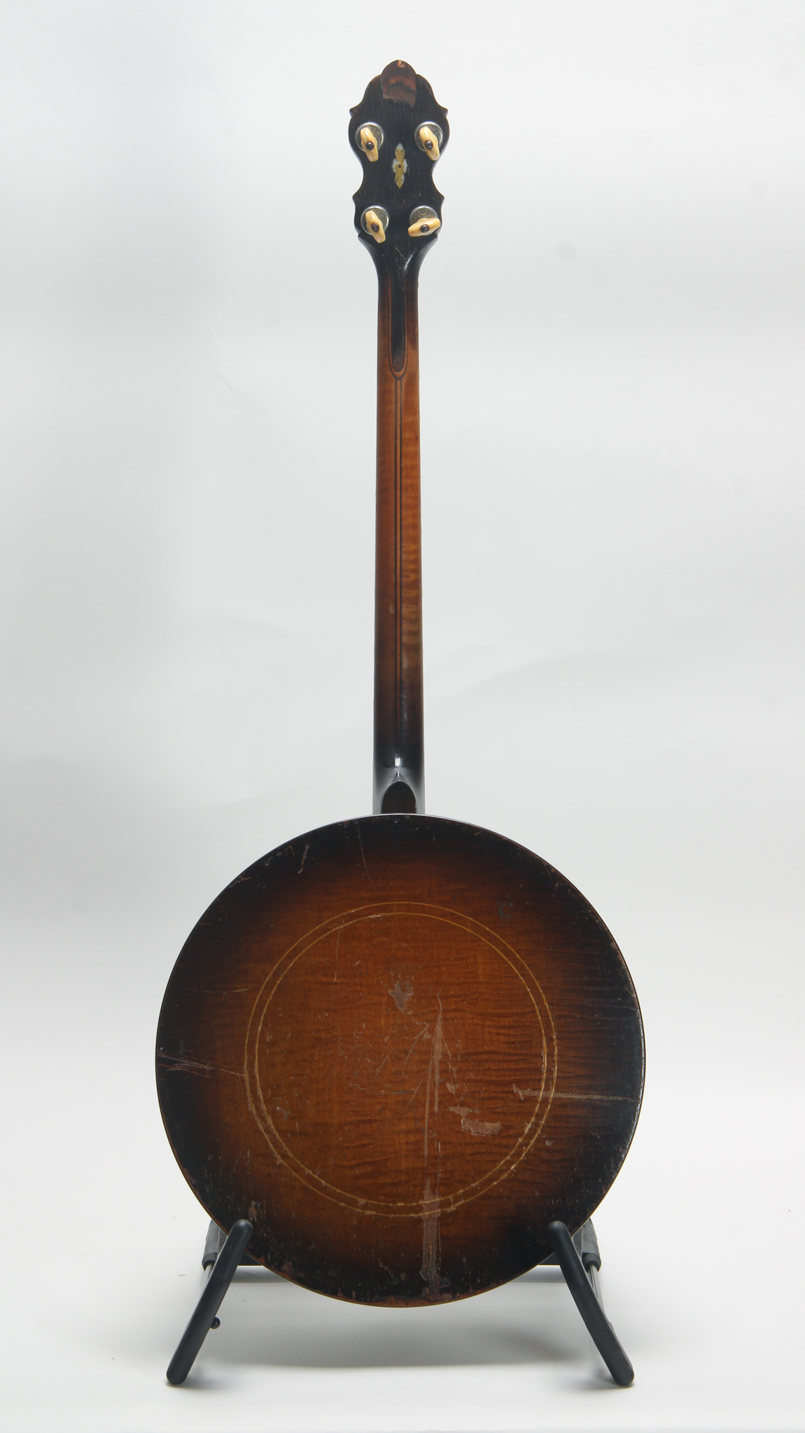 Player's example of a Silver Bell No. 1 19 fret tenor, from the Bacon Banjo Co., who were operating out of Groton CT at the time of this banjo's manufacture. The 11" rim assembly features all original hardware down to hooks and nuts, Oettinger tailpiece, Silver Bell tonering, with square resonator nub broken from f hole flange, and hook-mounted armrest ends present on hooks (armrest in case pocket); stained maple resonator with lots of plating and finish wear, with red Bacon label intact. The five piece maple neck has 19 frets, 23" scale length, 1-3/16" wide nut, with bound ebony board featuring pearl inlay; frets show mild pitting mostly in treble postion; large peghead shape with pearl inlay on face (finish checking and scratching present throughout neck), with large chunk of material absent from reverse; equipped with offset tab Grover tuners. Includes hard case, lots of exterior wear/missing handle.