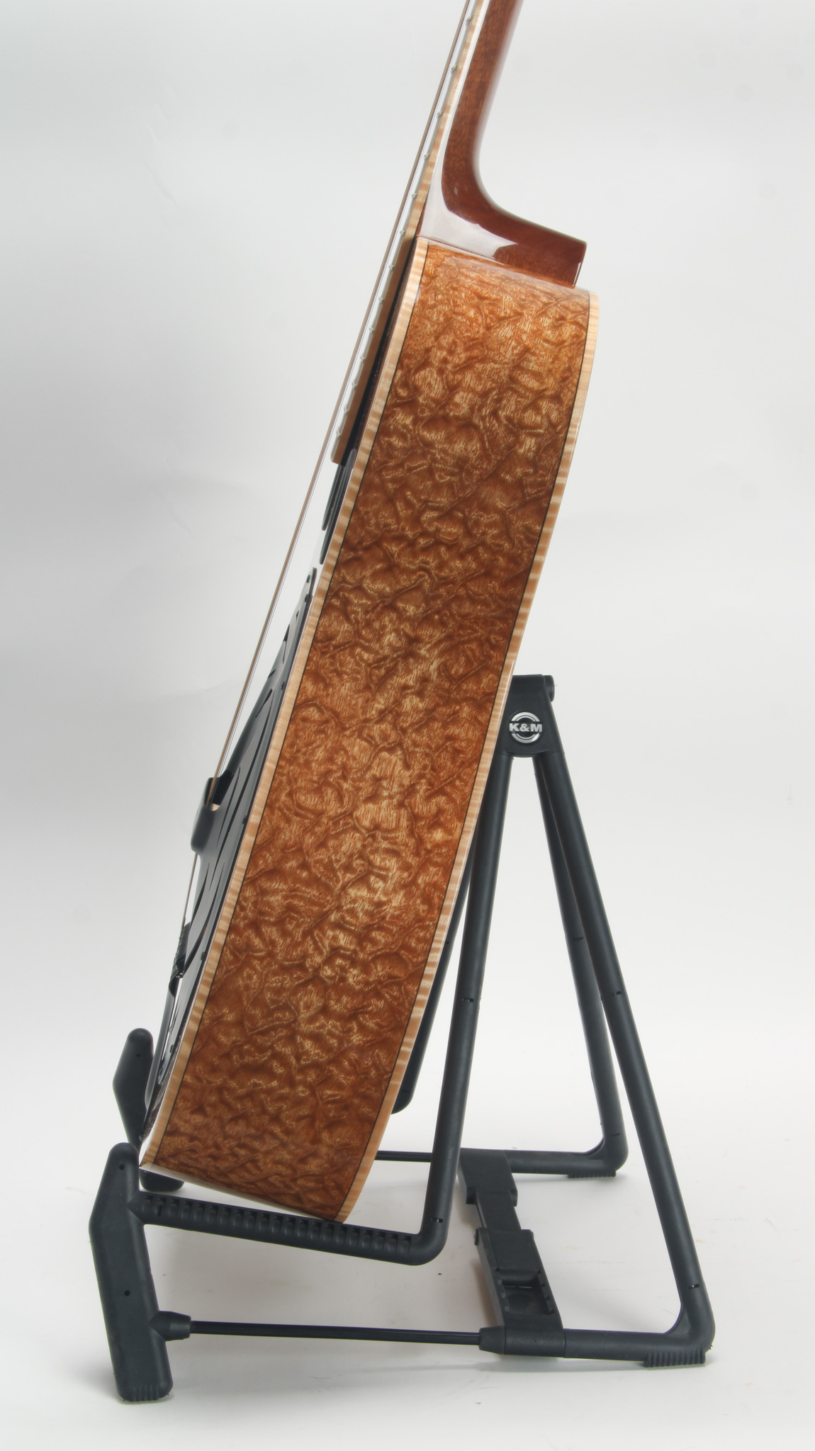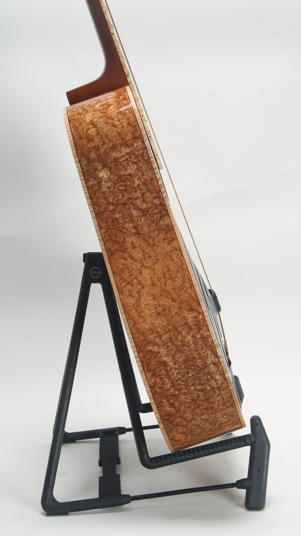 Thanks to its round neck design, this is a versatile instrument. The neck is built with a mahogany profile, the maple bound ebony fingerboard adorning nice abalone inlay. The neck is constructed with a 25" scale length and 1 25/32" nut width - making it a nice crossover instrument. The neck profile is nice and comfortable a bit on the thinner side measuring .83'" in depth at the first position and tapering up to about 1" at the ninth fret. Currently setup in D for Spanish style playing the action is low and easy measuring a factory spec 6/64" in height at the twelfth fret of the sixth string and 5/64" on the first. Virtually unplayed, the frets and fingerboard are exceptionally clean.