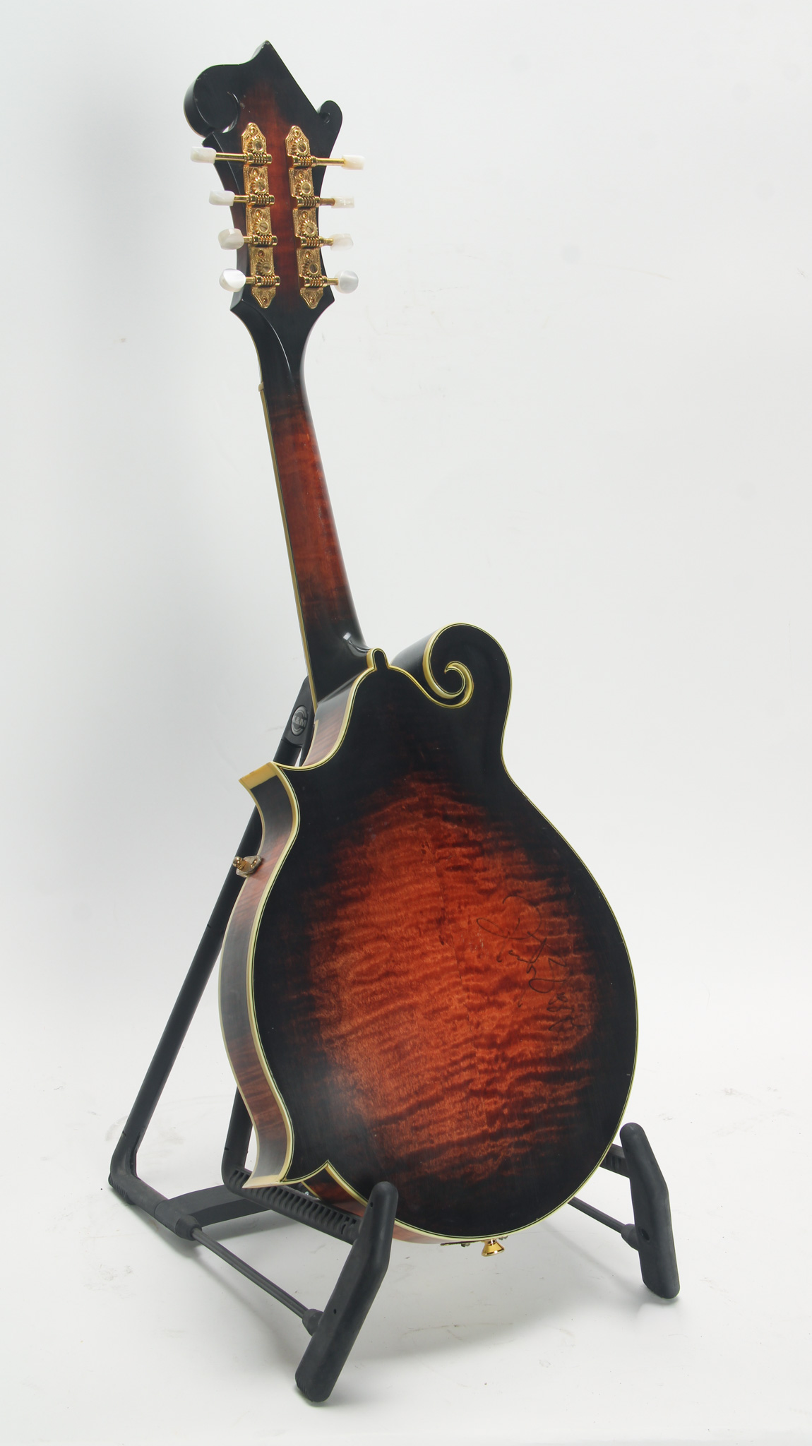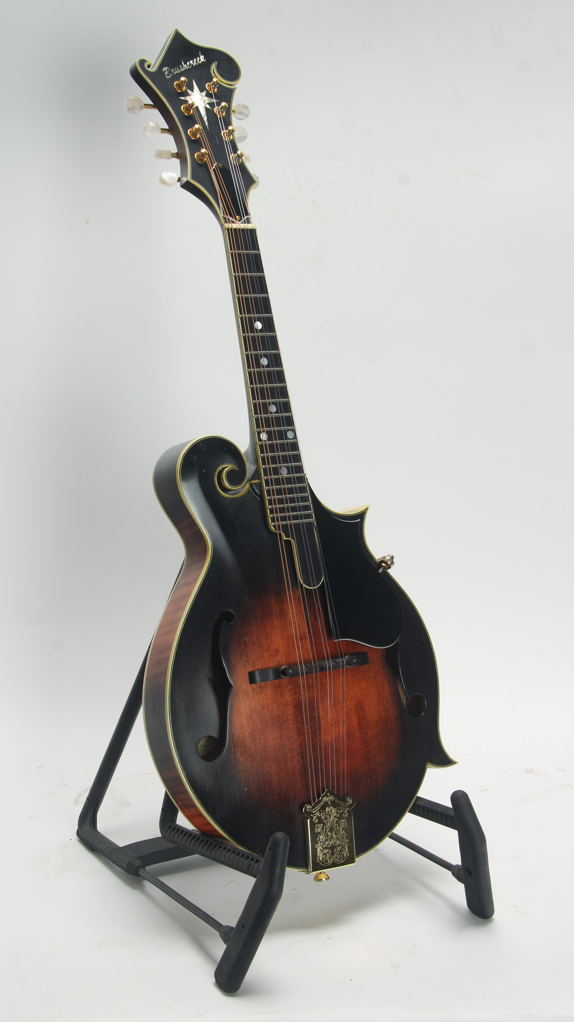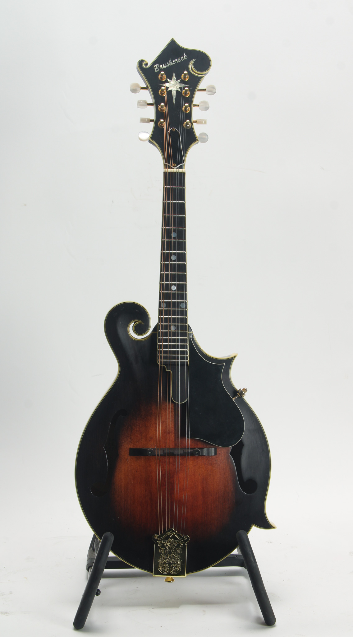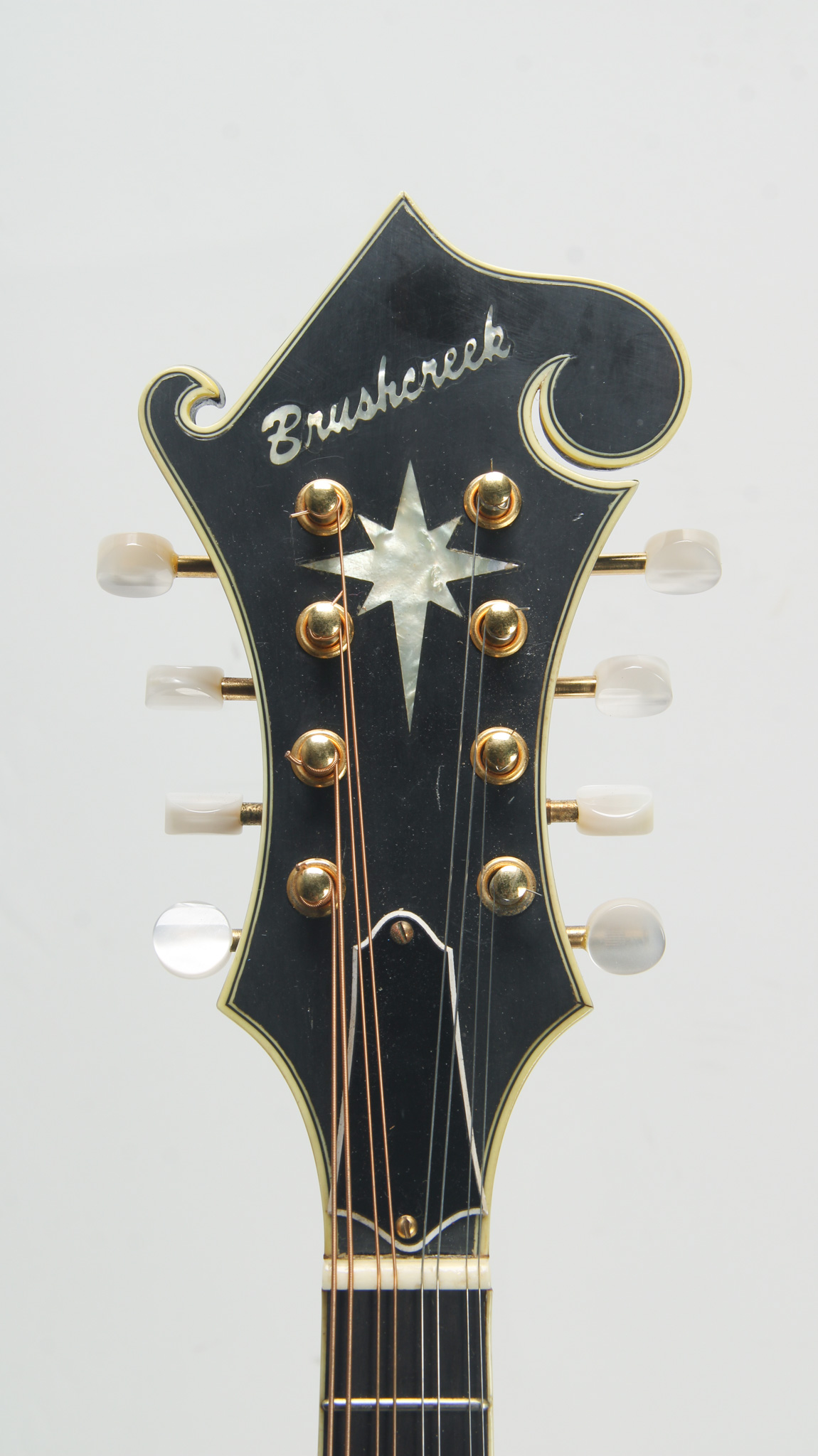 Truly a banjo-killer, early 2000s Brushcreek F-5 T model, high quality, small output single maker construction, from Geoff C. Waters (signature present on oval label inside, below 8/10/2003 date); rich and dynamic tone. Featuring flamed maple construction throughout the fully bound and trimmed F style body, the instrument has a two piece finely grained spruce top, with two piece back, two vertical braces on top, f holes, with gold-plated tailpiece, pickguard hardware; hairline finish checking present, with some dings and scratches from playing, and Ricky Skaggs' signature on back. The one piece maple neck has an extended ebony fingerboard, pearl dot markers, with engraved plate tuners, maker name and shooting star inlaid in pearl on peghead, with some dings on top of peghead, and tarnish on tuner shafts. A nice playing mandolin with low/medium action, there is slight fall-off on the extension, and the adjustable bridge at its lowest. Included in sale is original square hard case.