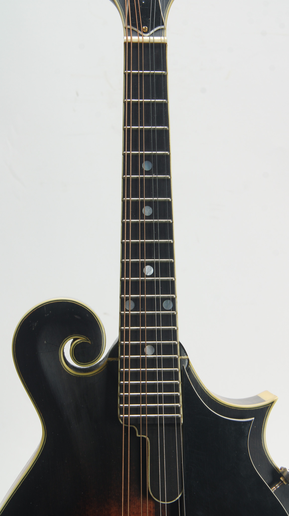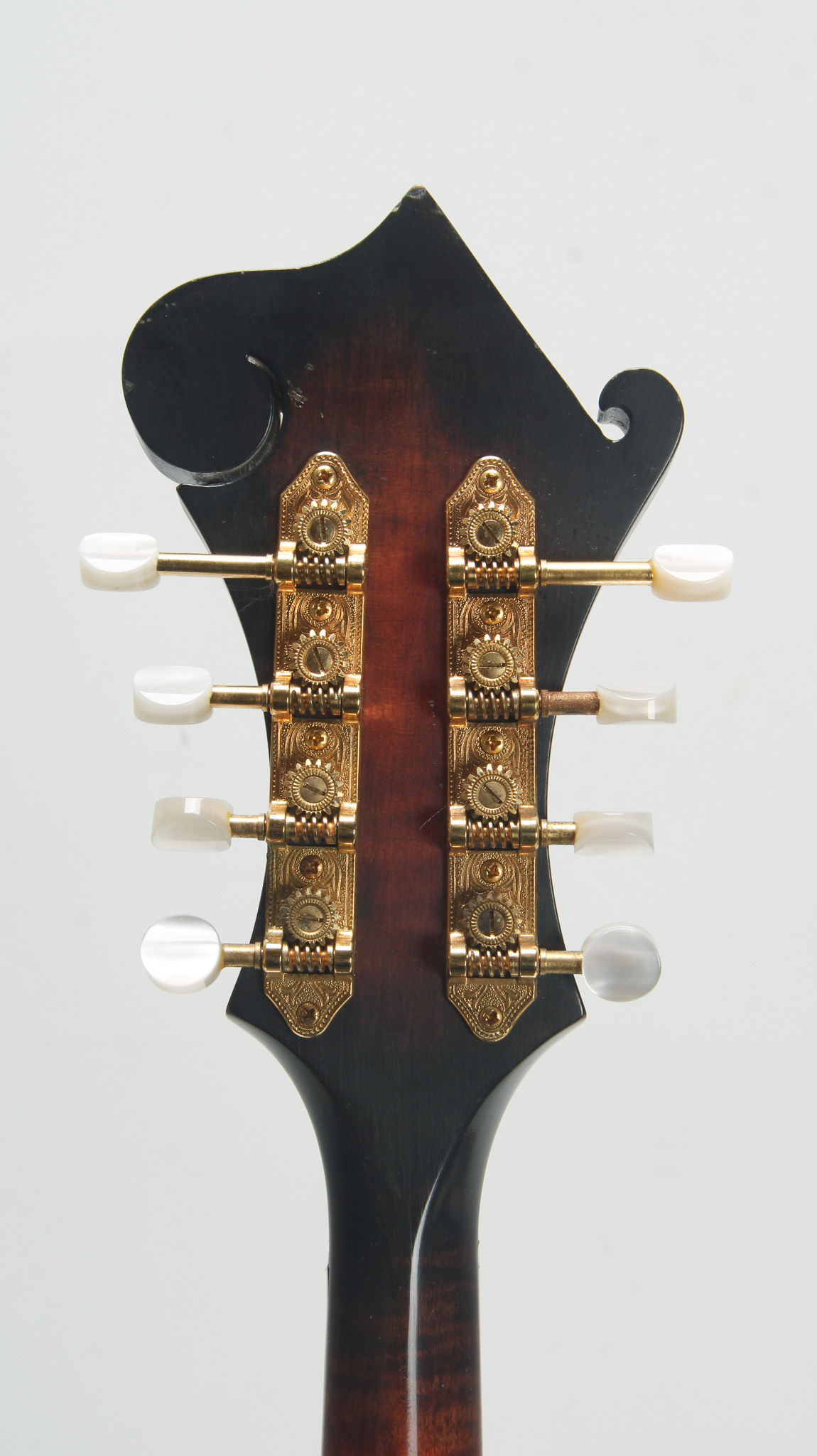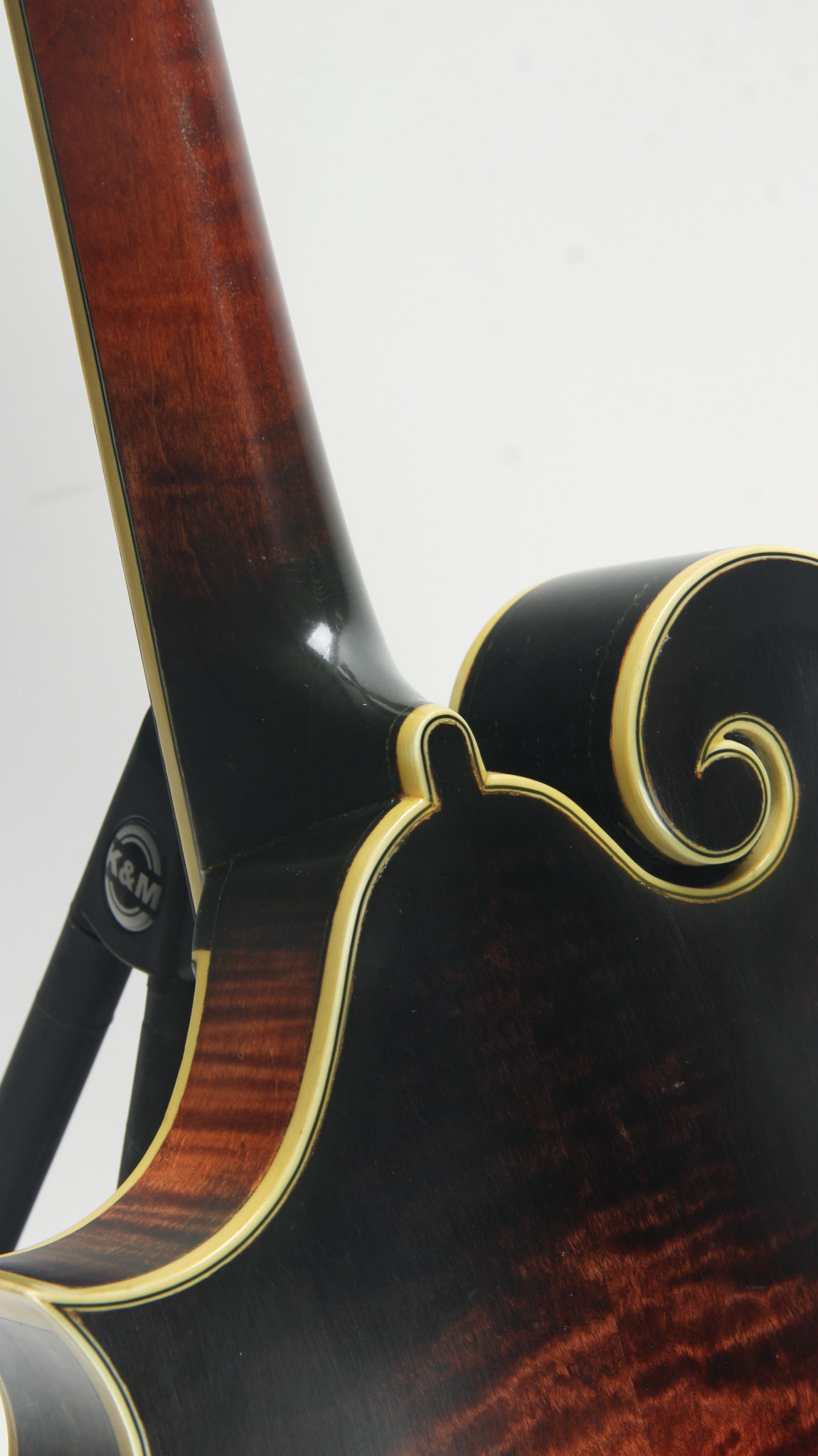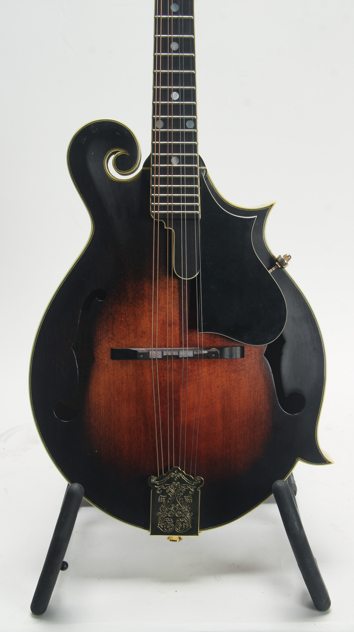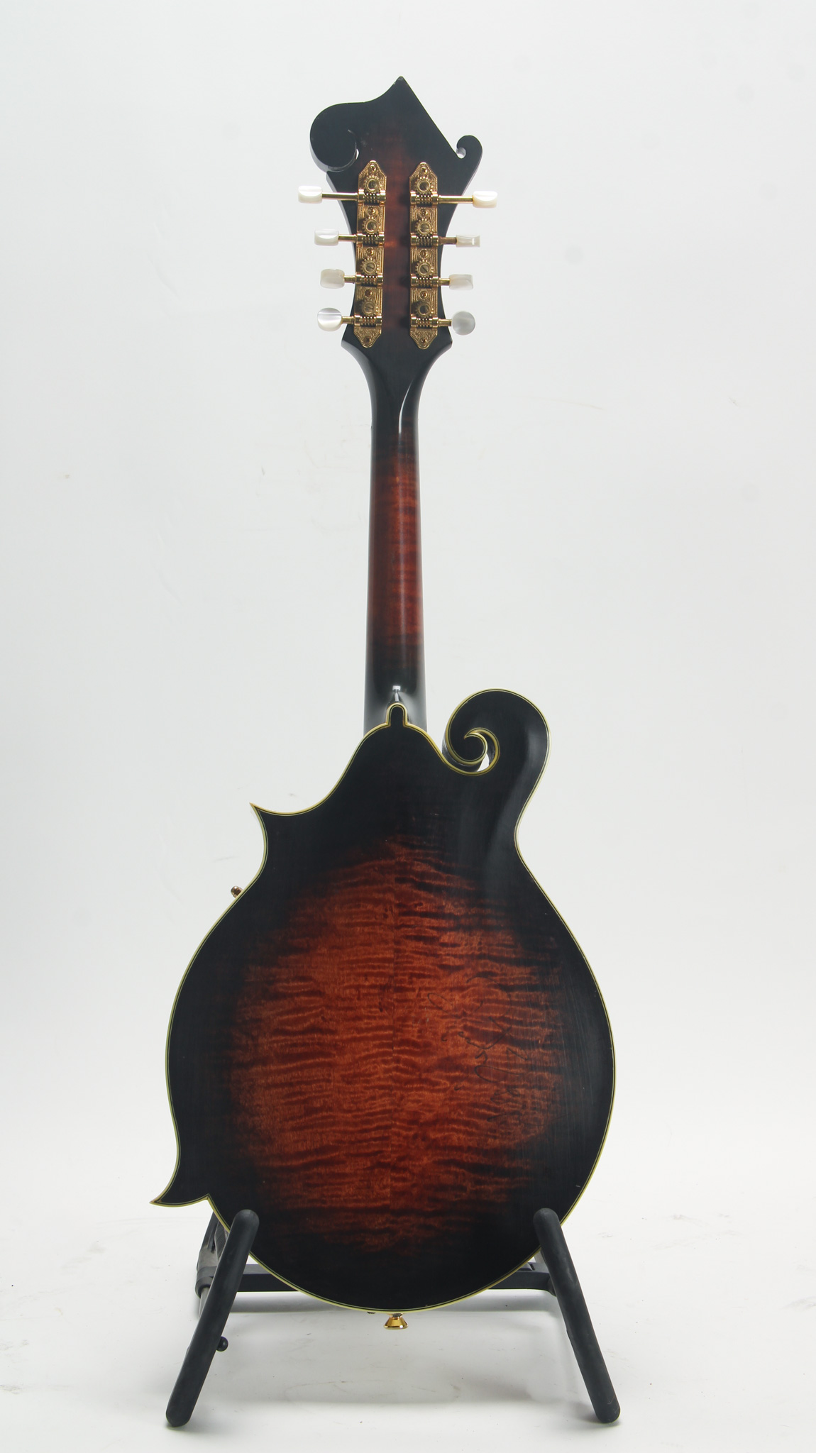 Truly a banjo-killer, early 2000s Brushcreek F-5 T model, high quality, small output single maker construction, from Geoff C. Waters (signature present on oval label inside, below 8/10/2003 date); rich and dynamic tone. Featuring flamed maple construction throughout the fully bound and trimmed F style body, the instrument has a two piece finely grained spruce top, with two piece back, two vertical braces on top, f holes, with gold-plated tailpiece, pickguard hardware; hairline finish checking present, with some dings and scratches from playing, and Ricky Skaggs' signature on back. The one piece maple neck has an extended ebony fingerboard, pearl dot markers, with engraved plate tuners, maker name and shooting star inlaid in pearl on peghead, with some dings on top of peghead, and tarnish on tuner shafts. A nice playing mandolin with low/medium action, there is slight fall-off on the extension, and the adjustable bridge at its lowest. Included in sale is original square hard case.
