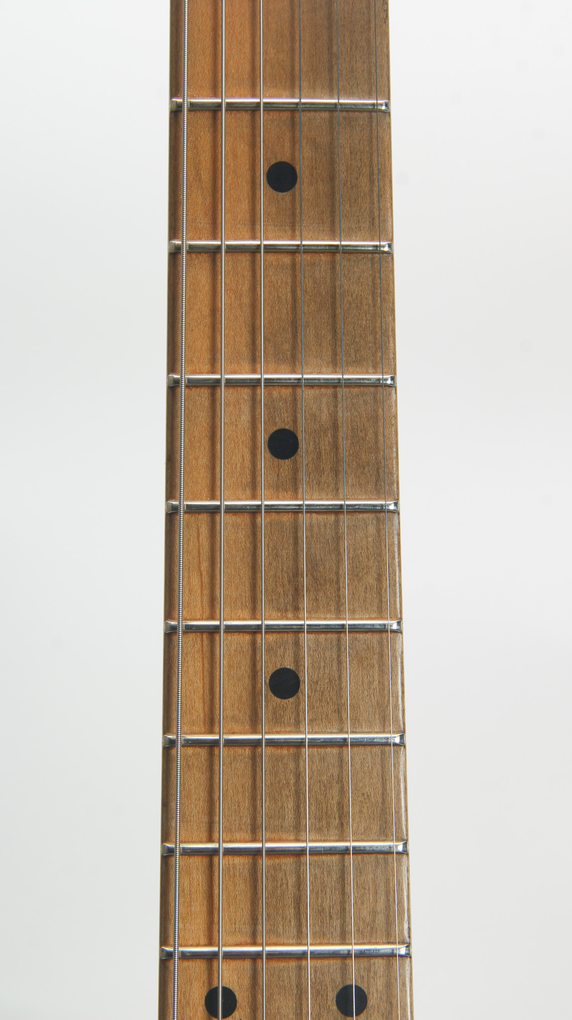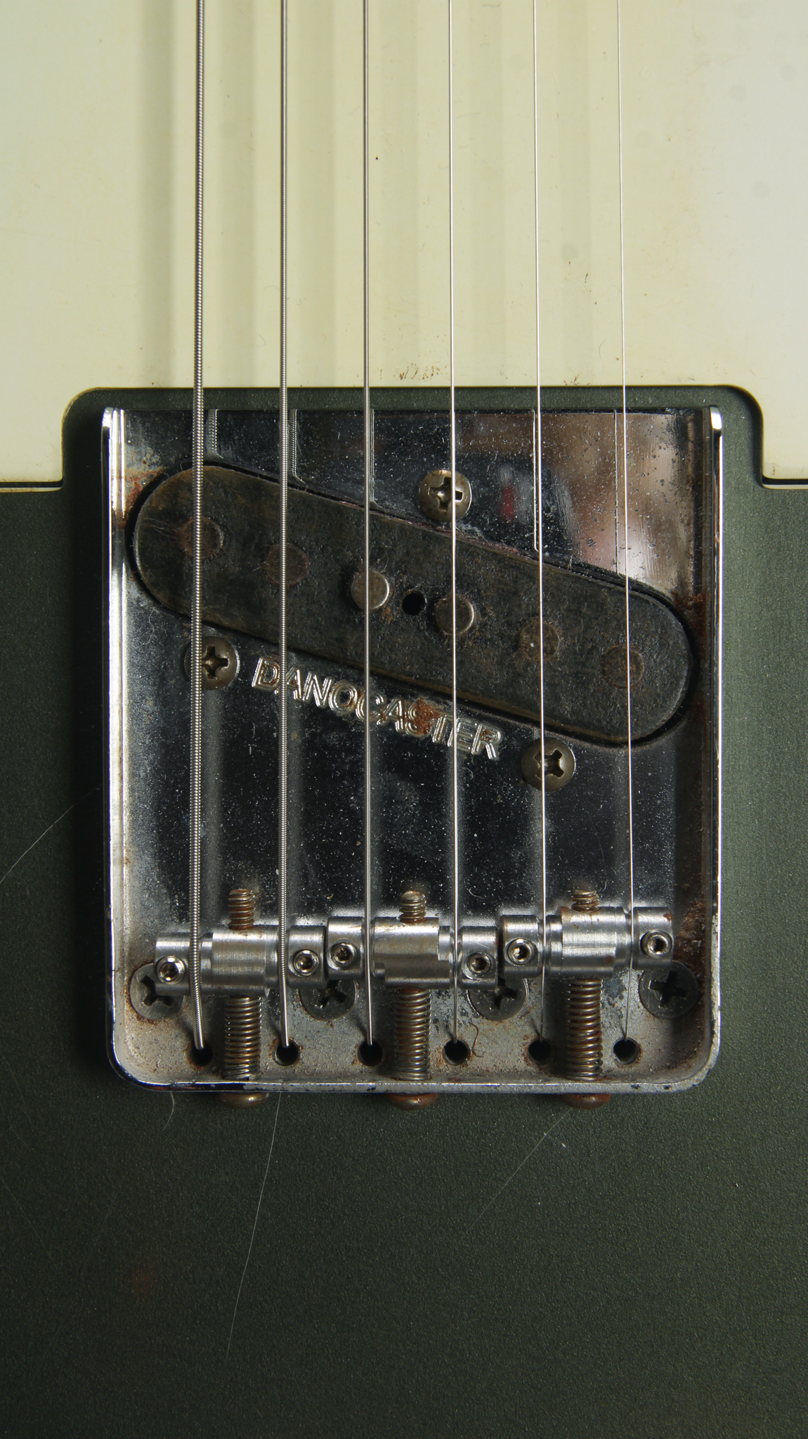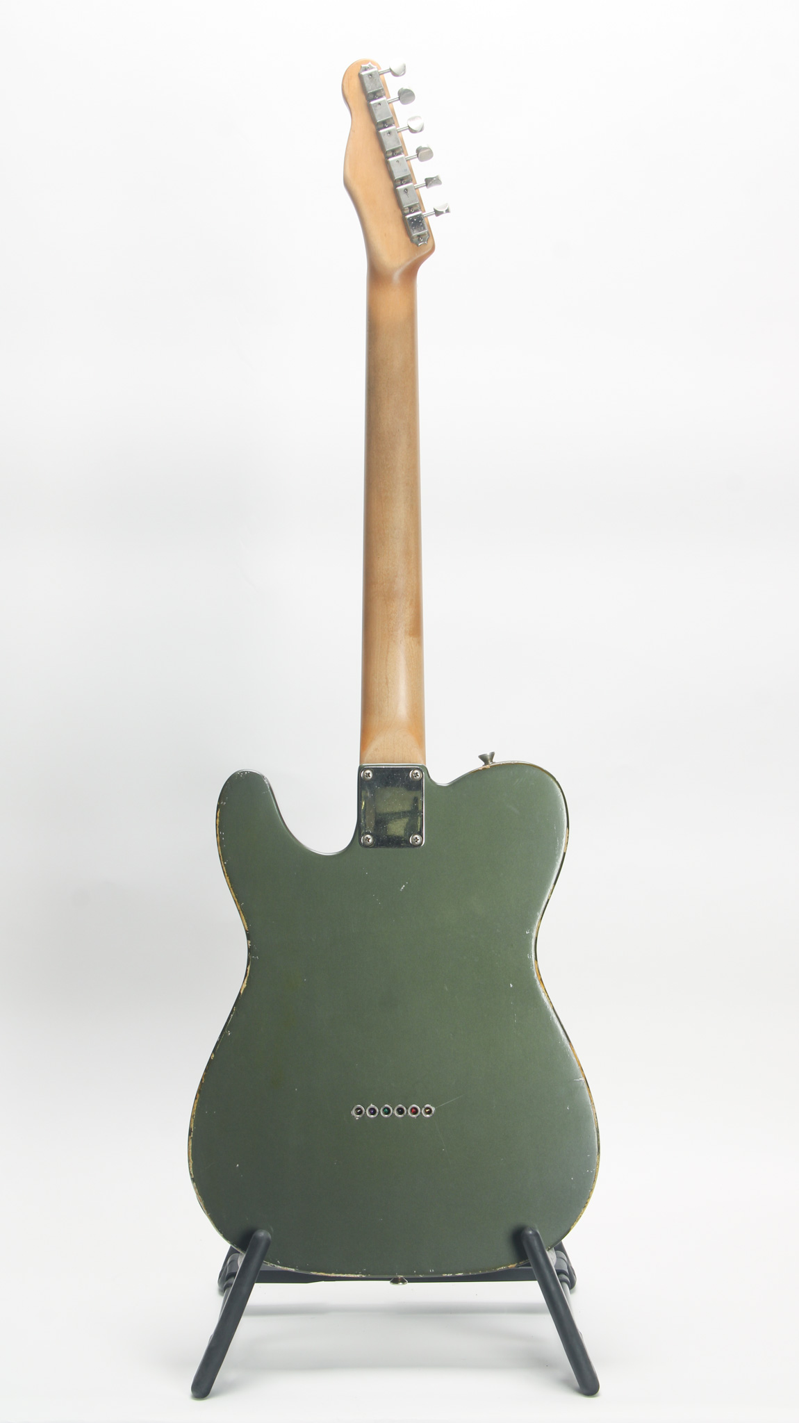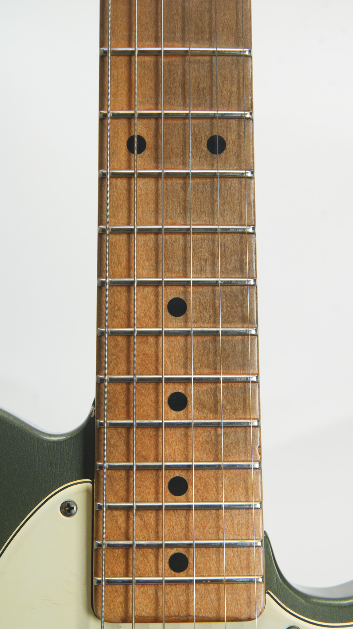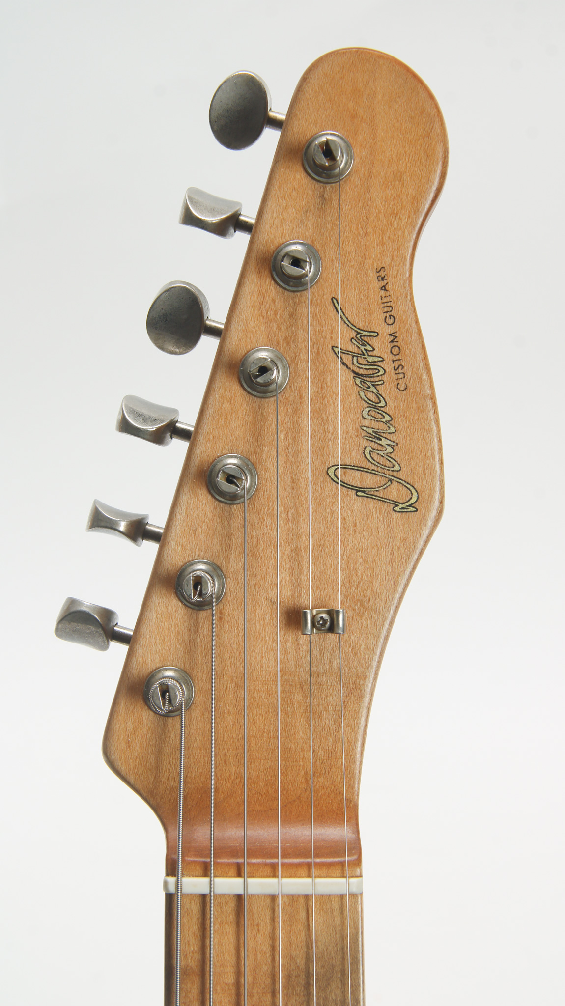 This guitar comes to us from the original owner with the COA hang tag. Weighing in at 7lbs with a 2 piece ash body and finished in an aged charcoal frost. The neck is maple with a chunky C shape measuring .86" in depth at the first fret. The radius is 9.5 and the nut width is 1.65". Fretted w/ Jescar medium jumbos ( .095 x .047 ). The Arcane "Max Dano" pick ups make this tele sing in every position. It is remarkably comfortable to play with spanky low action paired with 5/16" steel saddles giving it a smooth bright tone even when used for fingerstyle.