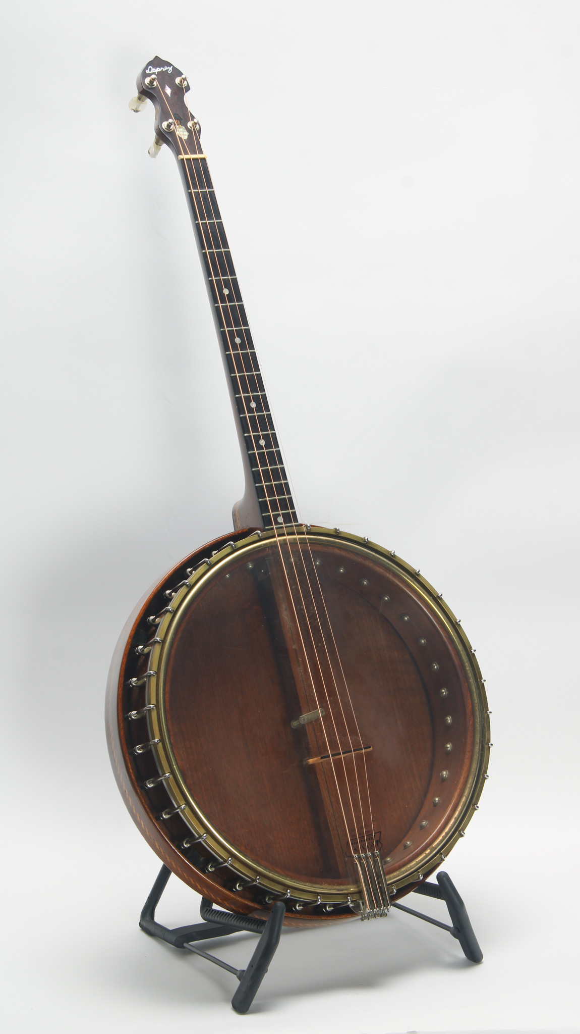 A mammoth cello banjo built in 1993 by Rochester maker M. E. Deprez with full resonator and rolled brass tonering. The 16-1/8" diameter walnut rim assembly has 34 hooks and nuts, four piece rim cap, maker stamped dowel stick (July, 1993), notched brass tension hoop, Oettinger style tailpiece, with thick bands of marquetry on the side of the rim and walnut resonator; some cosmetic wear and tear present on wooden and metal parts, such as dings, scuffs, a product of largess; open separation on edge of side. The 28" scale, three piece walnut neck has an ebony fingerboard, Vega style peghead shape, and is equipped with geared tuners; past peghead repair rendering snap on pearl truss rod cover; 1-3/8" wide at nut.