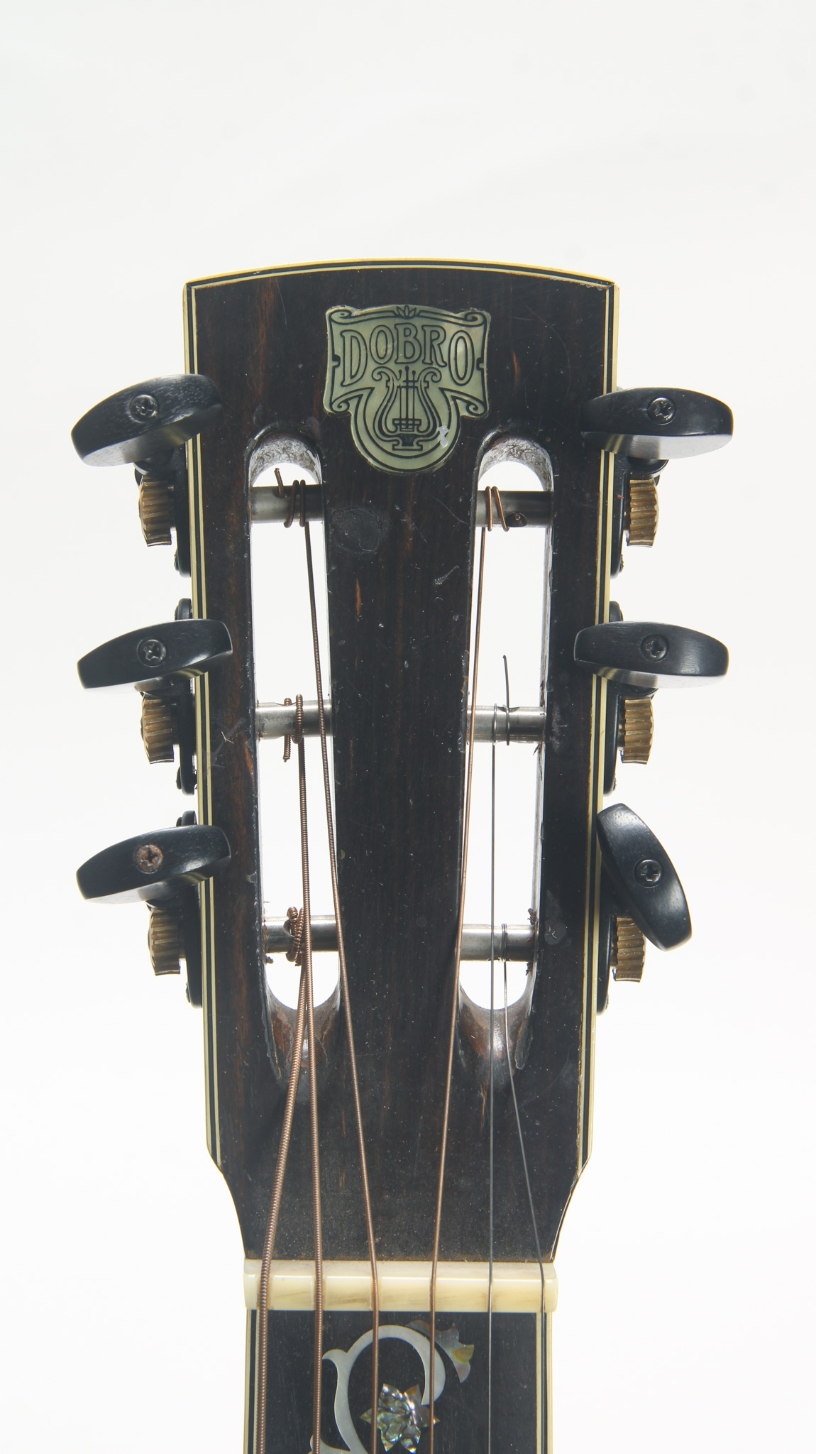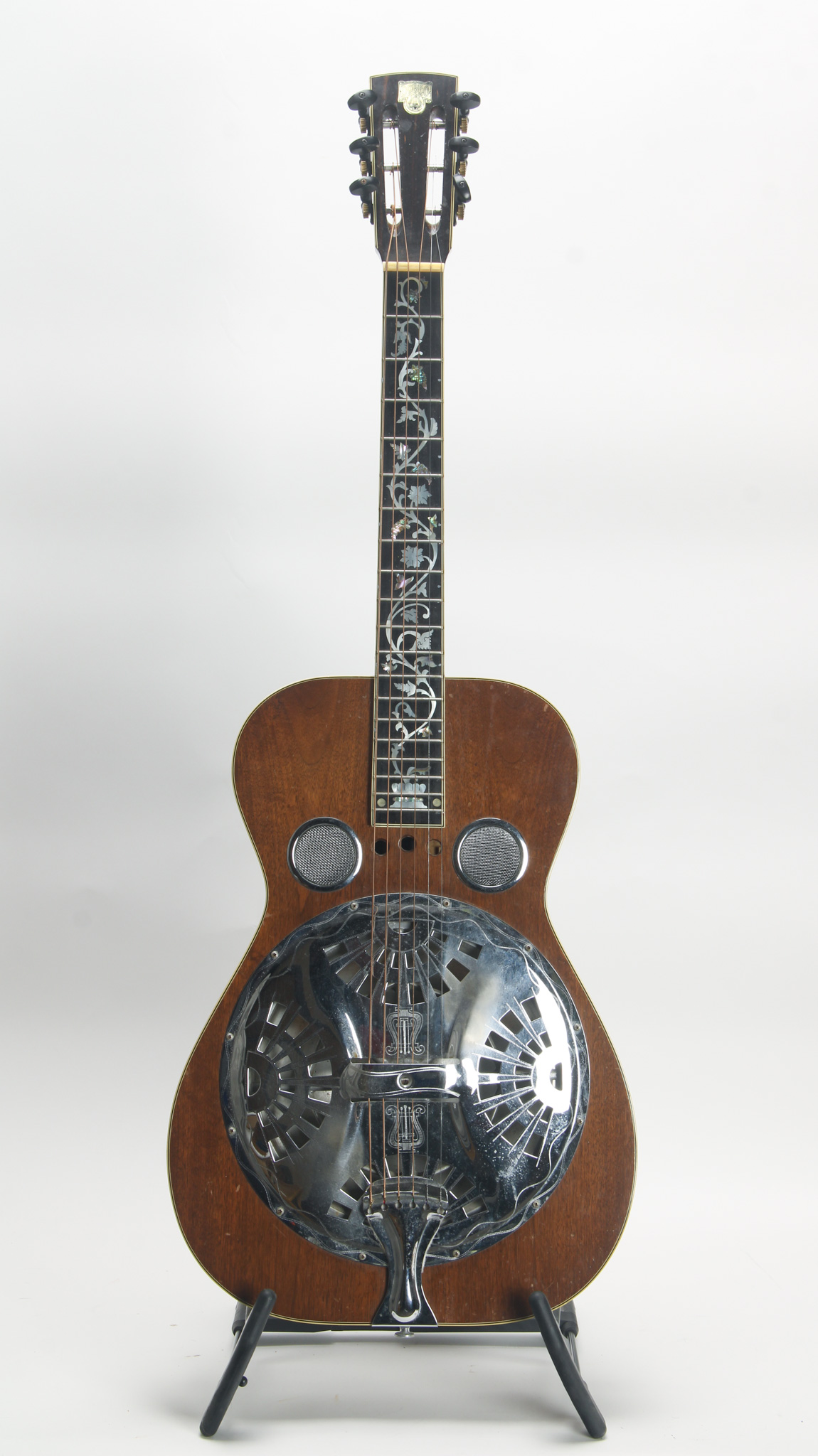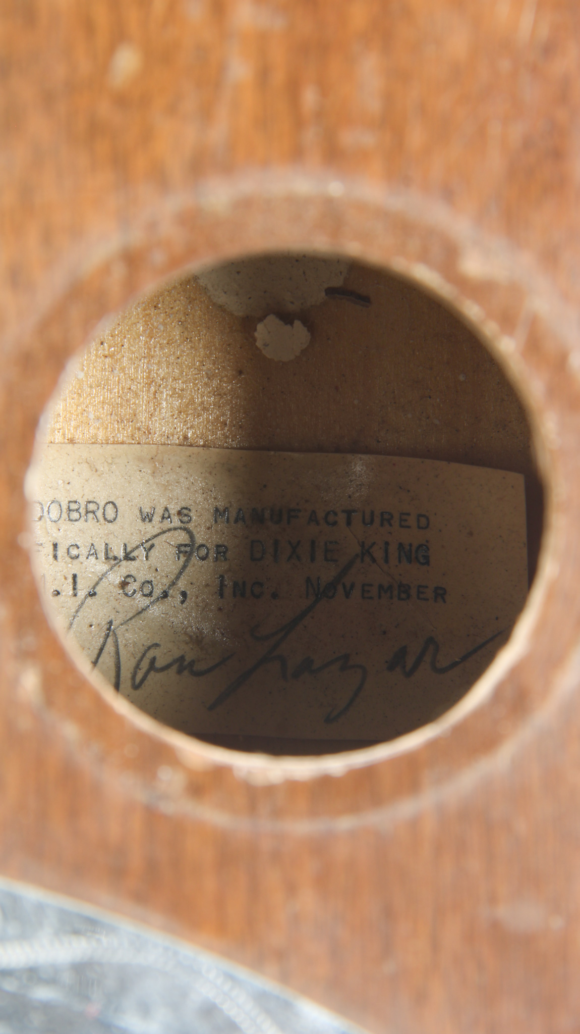 A custom built guitar for "Dixie King" by OMI dated 1980, we're tickled to offer this high grade forty five year old showpiece hound-dog. The fully bound and trimmed body is of walnut, with single cone/spider bridge, chrome plated cover plate with solar cutouts/lightly engraved lyres, two cover plate screens, with custom manufacture label inside; tons of scratching, dings, and finish touchup present throughout (notable blemish repairs on driver's-side side). The walnut square neck meets the body at the 12th fret, with a gorgeous 24.5" scale multi-bound ebony fingerboard with spectacular pearl inlay down entire board in tree of life motif, inset binding on both sides of neck, with slotted peghead/ ebony peghead overlay, and Dobro emblem engraved into pearl as peghead inlay; equipped with later geared tuners. Extremely pleasing and rich tonality, with a boat-load of projection to-boot!