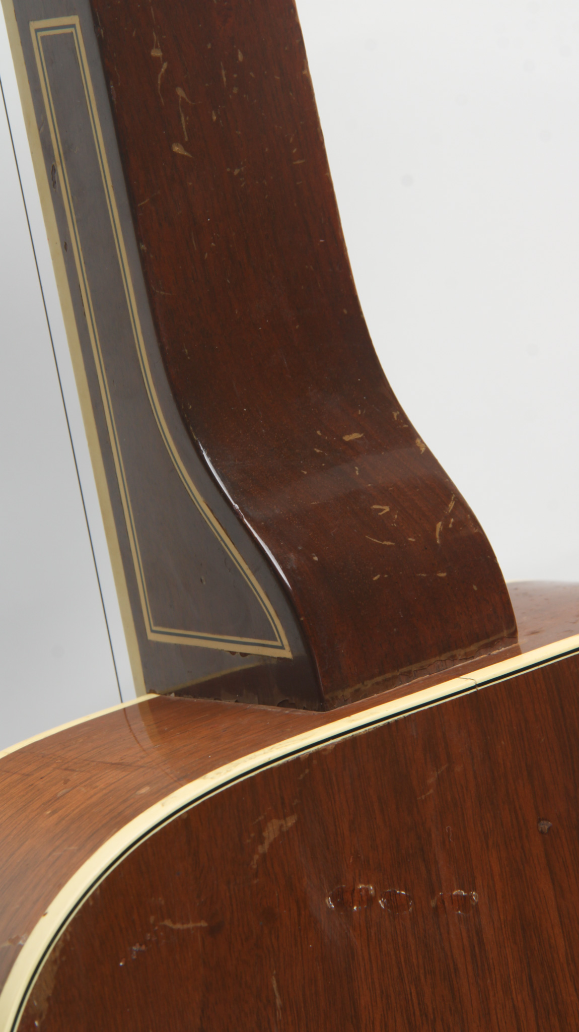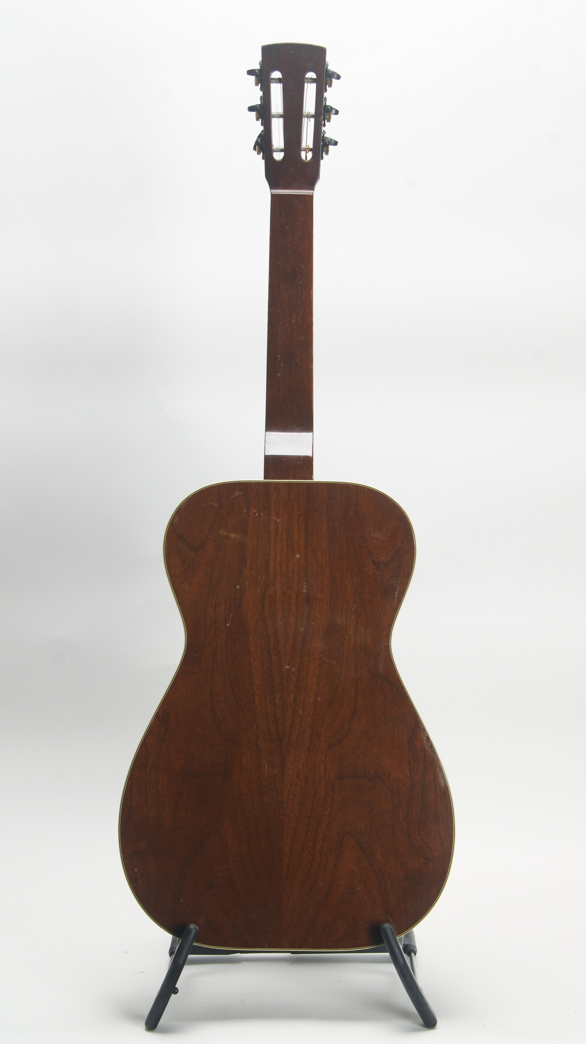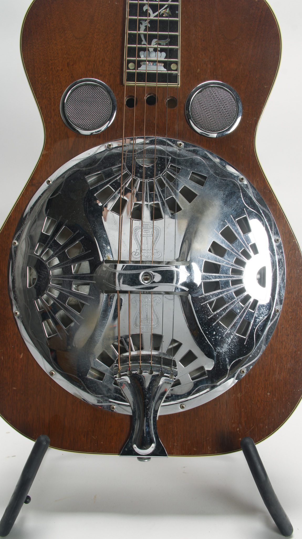 A custom built guitar for "Dixie King" by OMI dated 1980, we're tickled to offer this high grade forty five year old showpiece hound-dog. The fully bound and trimmed body is of walnut, with single cone/spider bridge, chrome plated cover plate with solar cutouts/lightly engraved lyres, two cover plate screens, with custom manufacture label inside; tons of scratching, dings, and finish touchup present throughout (notable blemish repairs on driver's-side side). The walnut square neck meets the body at the 12th fret, with a gorgeous 24.5" scale multi-bound ebony fingerboard with spectacular pearl inlay down entire board in tree of life motif, inset binding on both sides of neck, with slotted peghead/ ebony peghead overlay, and Dobro emblem engraved into pearl as peghead inlay; equipped with later geared tuners. Extremely pleasing and rich tonality, with a boat-load of projection to-boot!