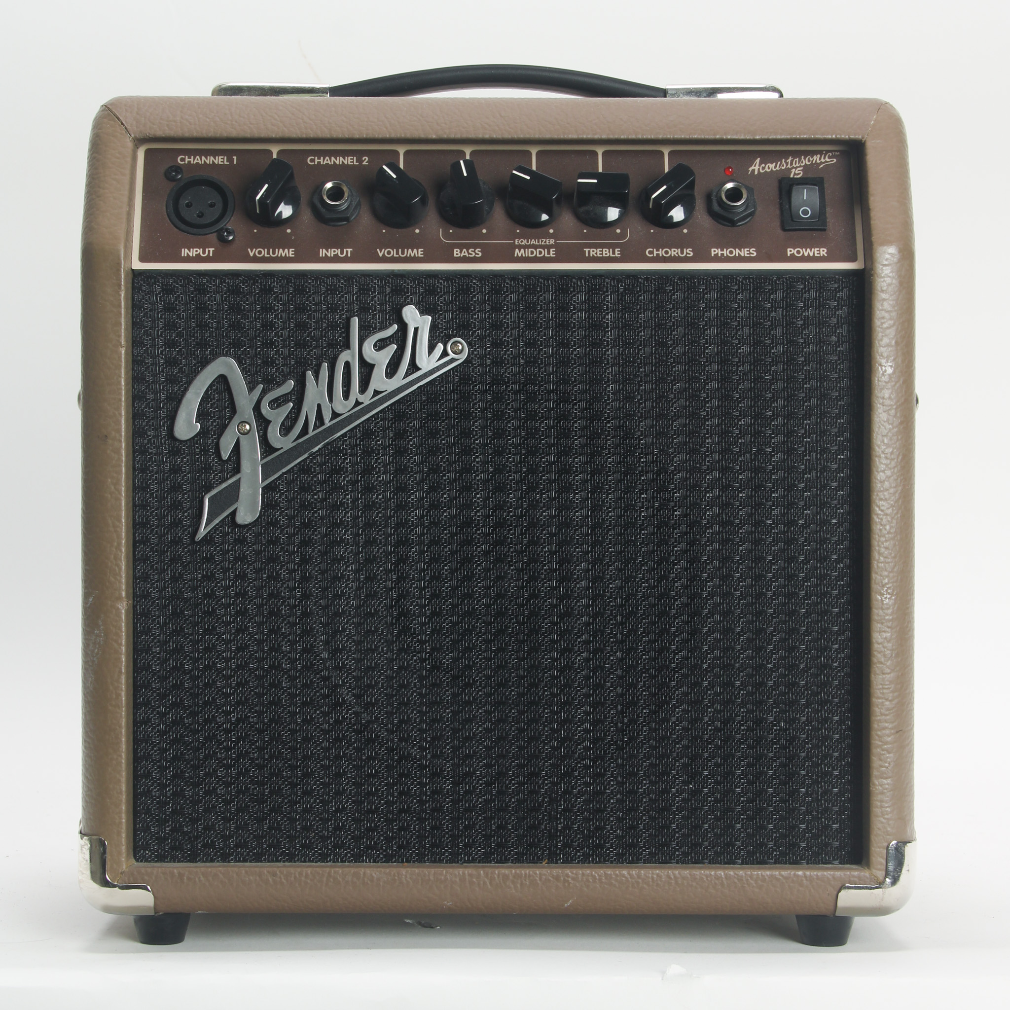 Used but not abused Fender Acoustasonic 15 amplifier. This 15 Watt amp features guitar and mic channels with separate volume controls, and would be the ideal amp/PA for small gigs or gatherings. This amp comes to us in excellent used condition, with the original box and instruction manual.