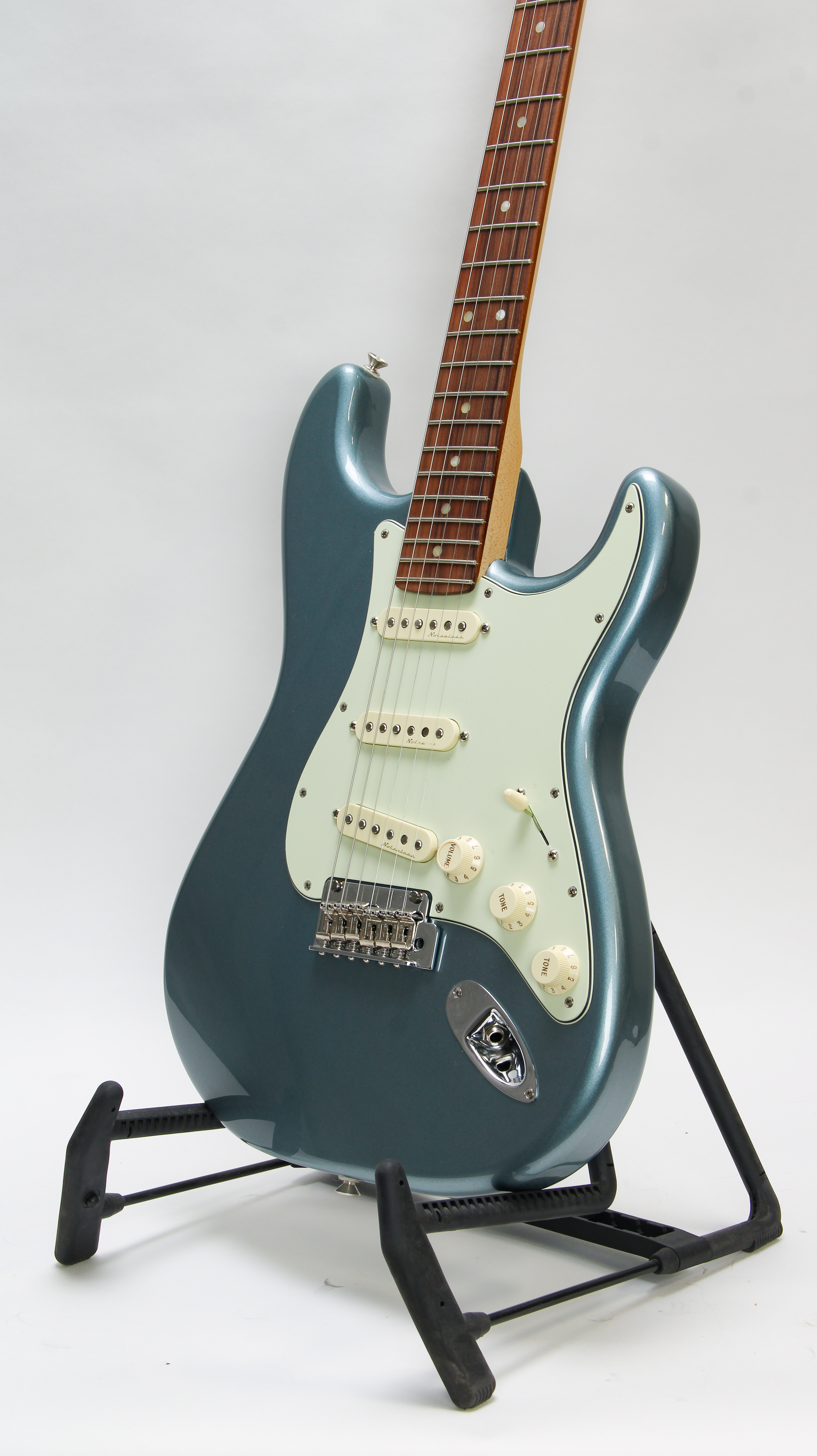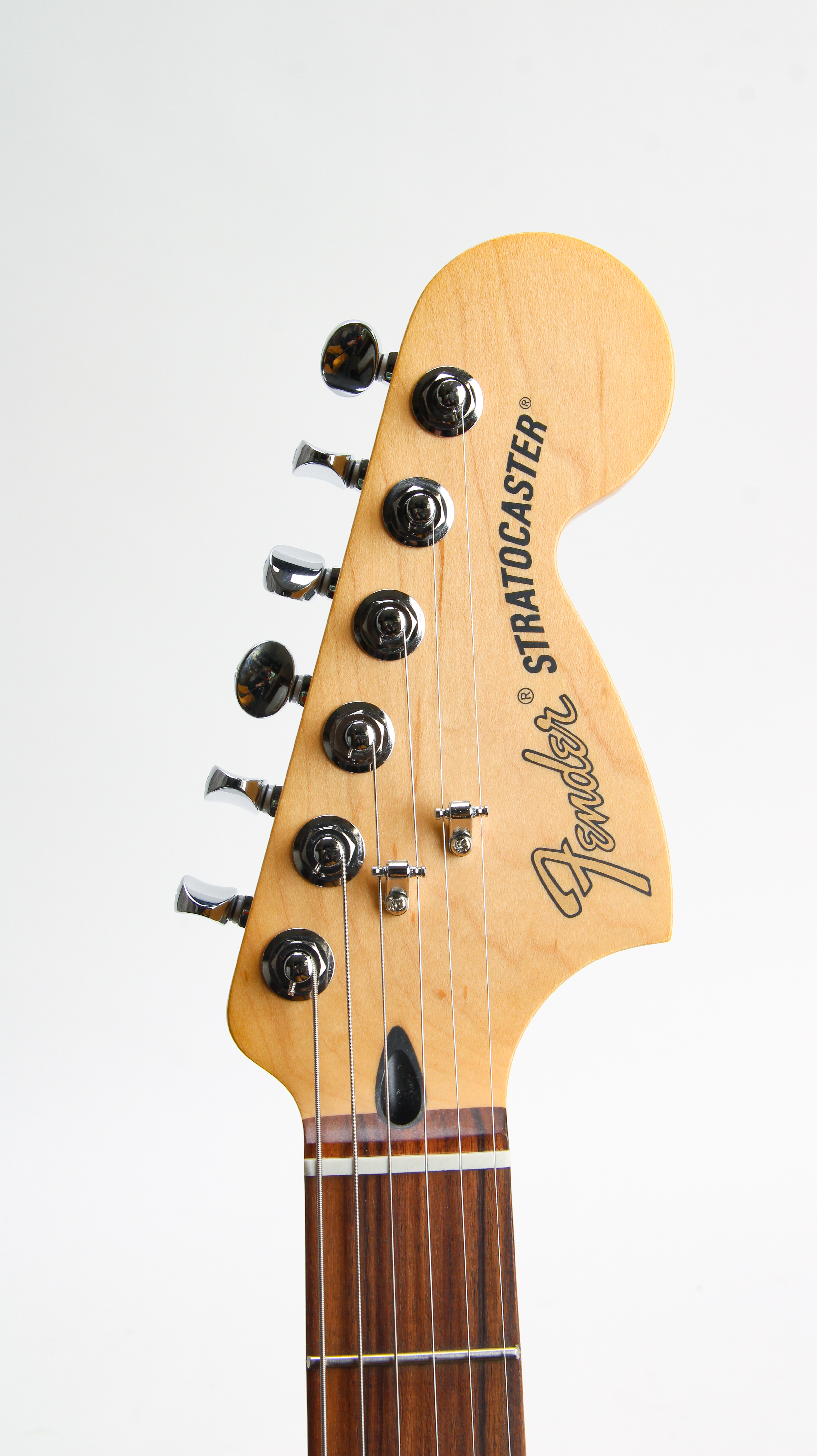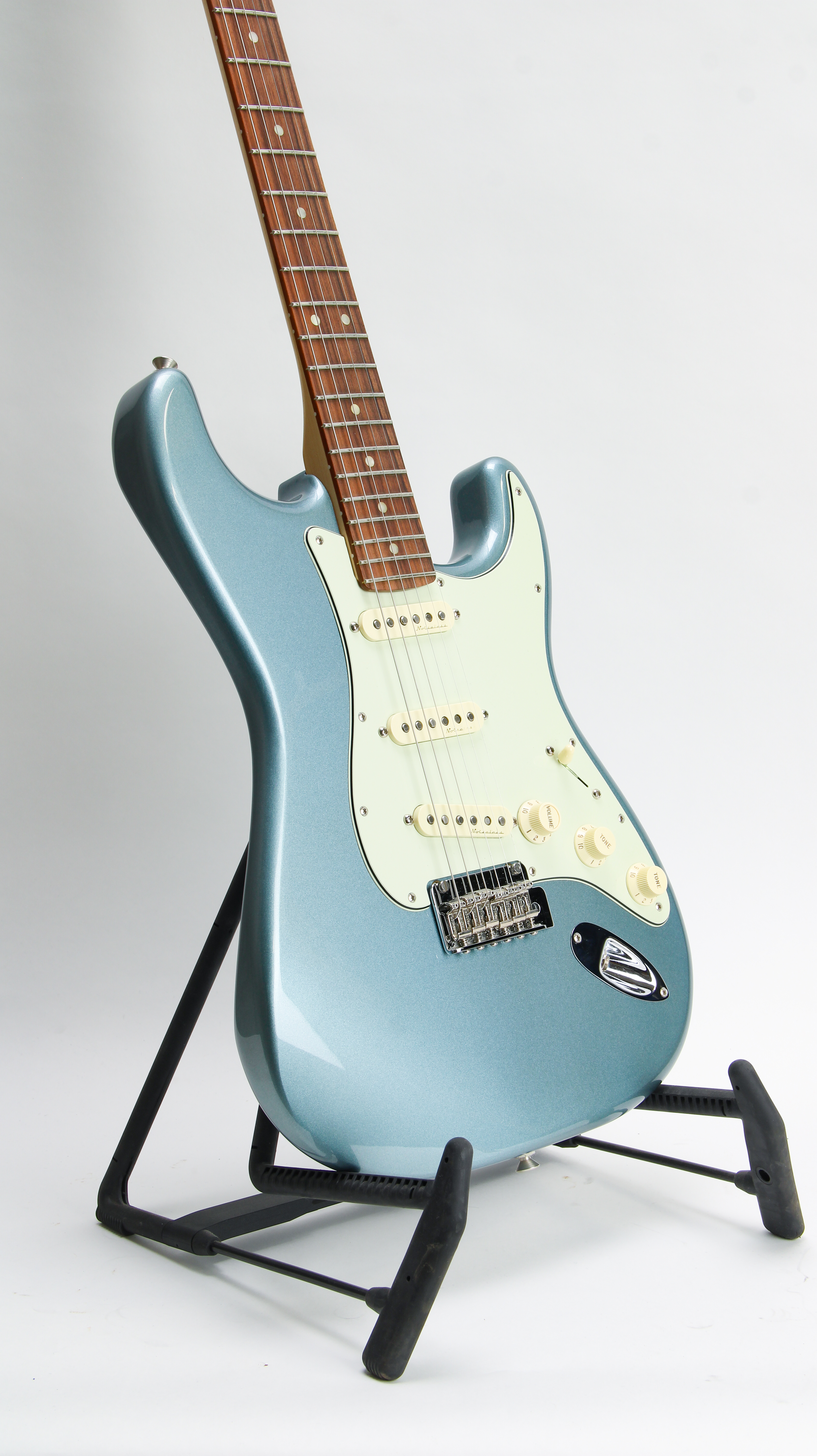 Here we have a lightly used modern Strat with a vintage vibe. The Deluxe Roadhouse series features Vintage Noiseless pickups with a 6-position V6 rotary tone switch, 5 way blade pickup switch, and an S-1 switch for a wide array of tones to be tweaked and explored. It has a maple neck with a Pau Ferro fretboard, and a mint green pickguard on a Mystic Ice Blue alder body. Hardware includes a 2-point bridge with tremolo arm and Fender locking tuners. This comes to us in fantastic condition with only one dent in the side by the input jack, otherwise it looks near perfect. It comes with a tweed case with all the Fender tags and tremolo arm.