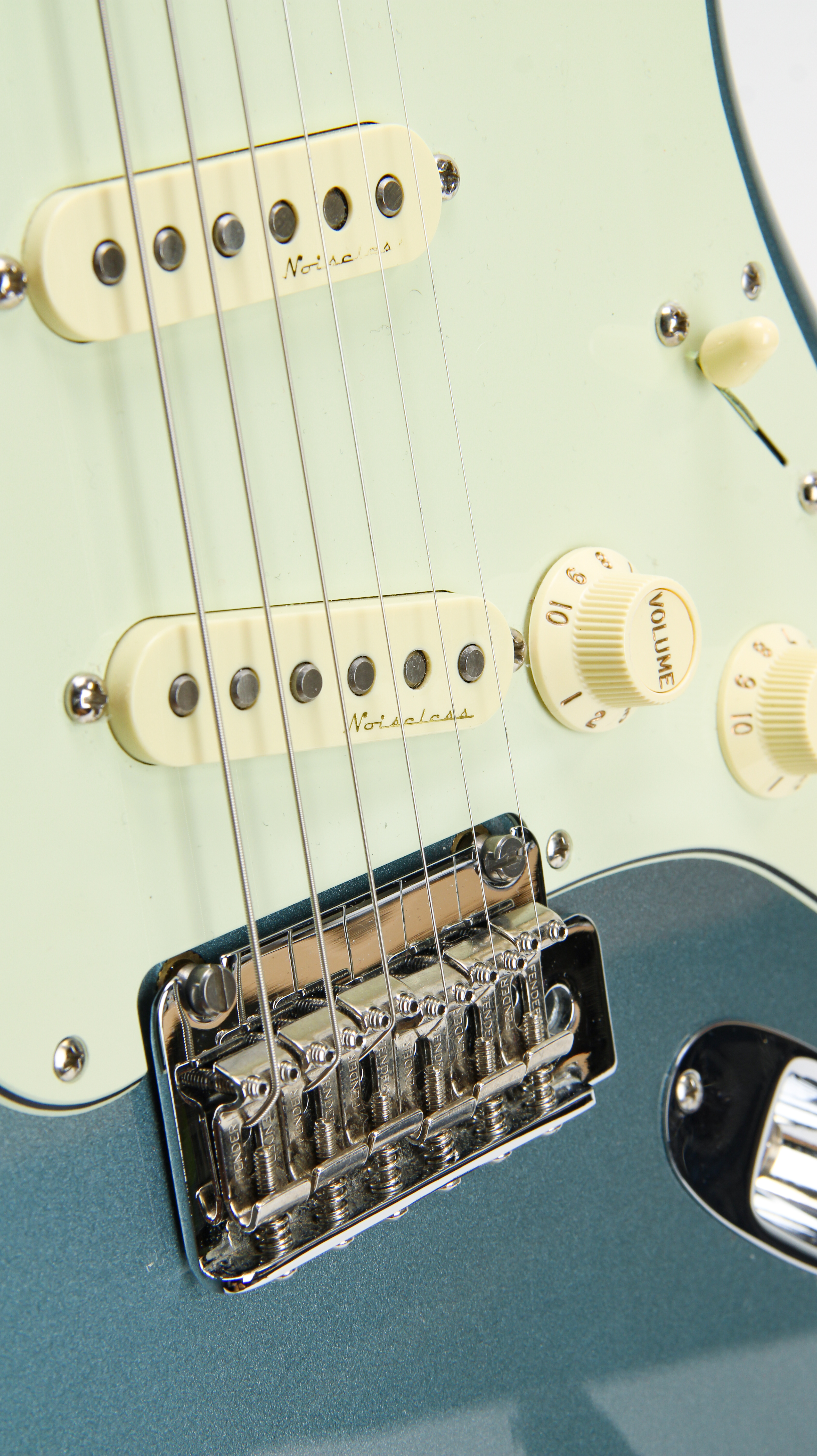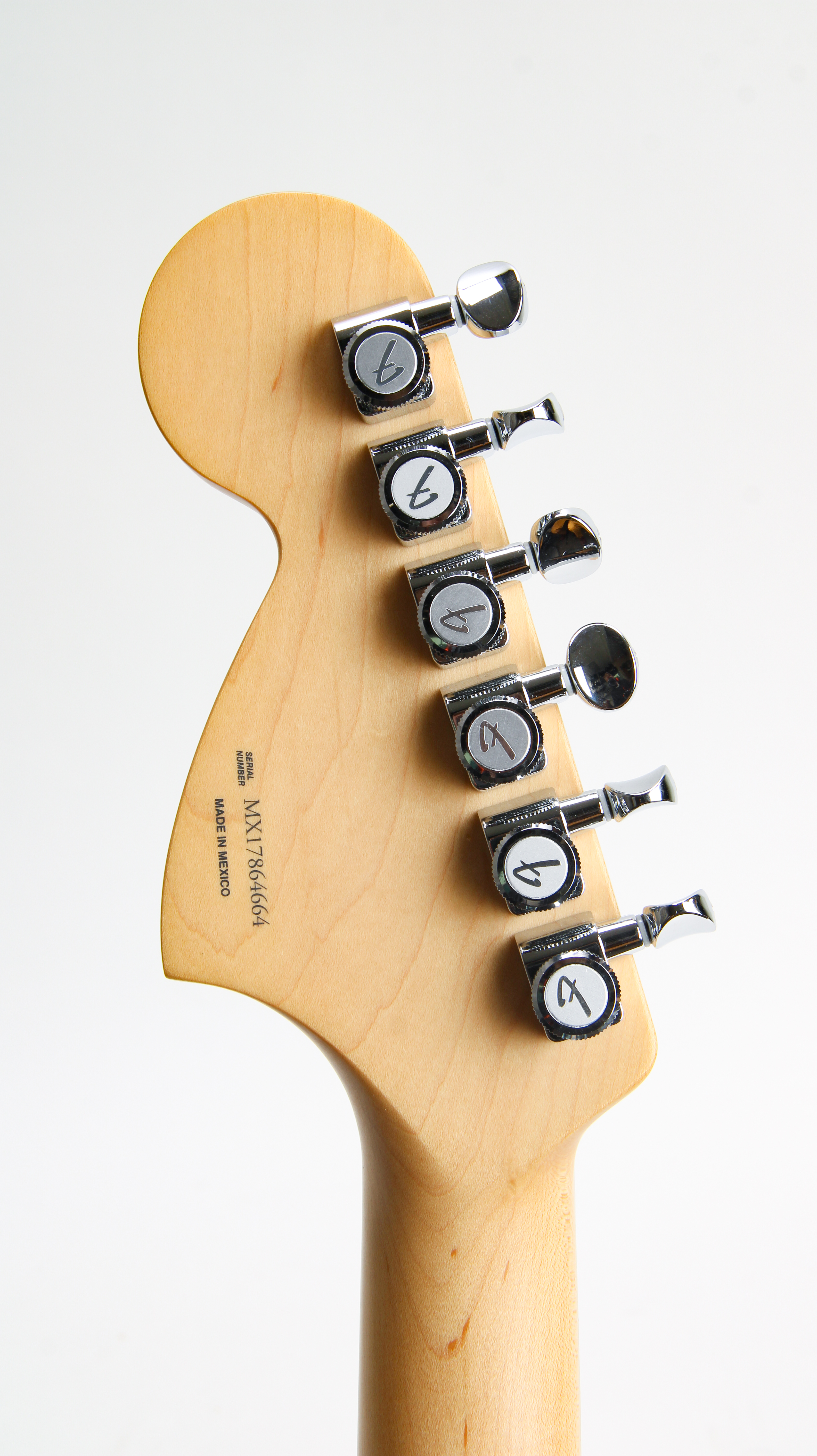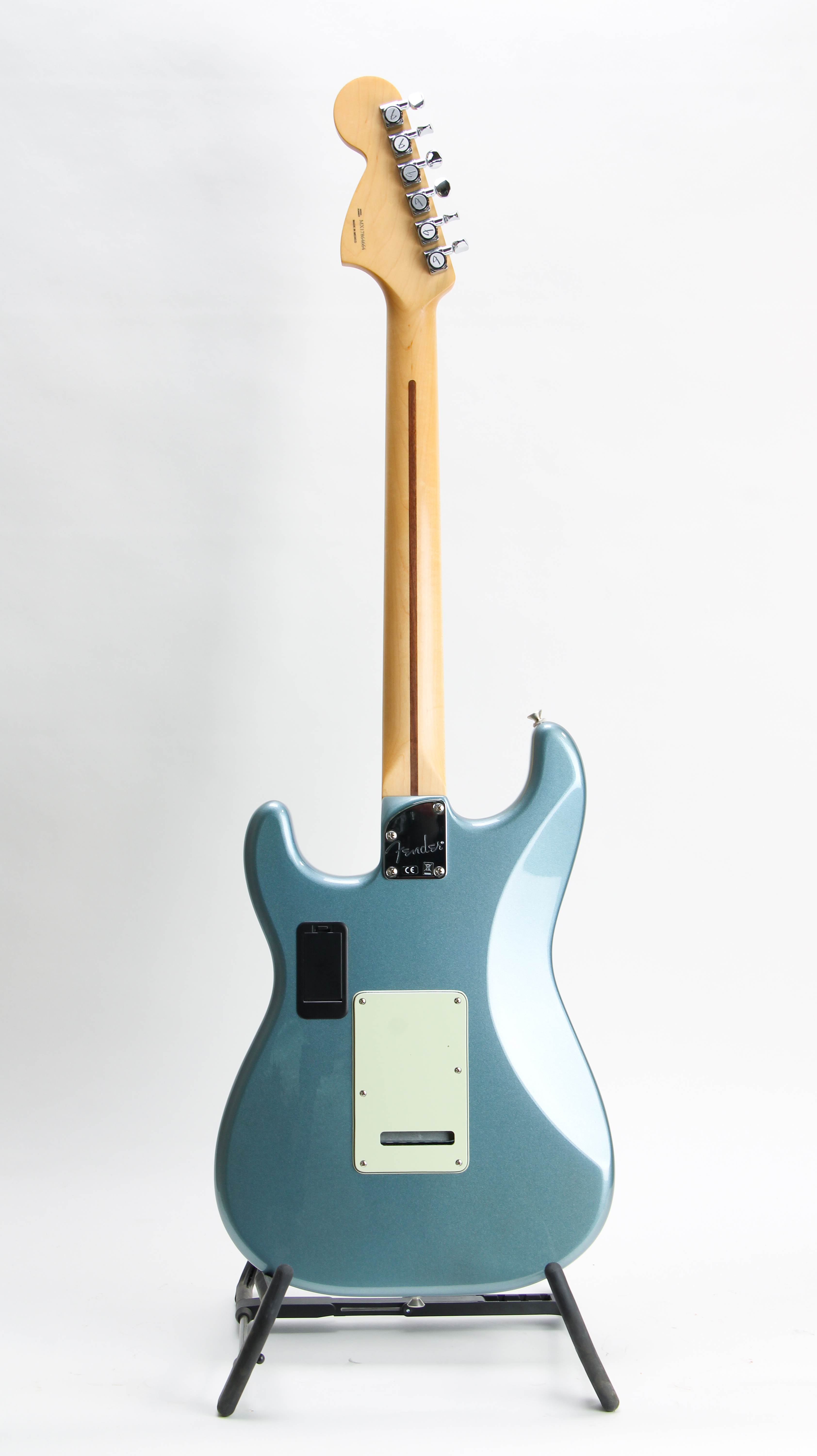 Here we have a lightly used modern Strat with a vintage vibe. The Deluxe Roadhouse series features Vintage Noiseless pickups with a 6-position V6 rotary tone switch, 5 way blade pickup switch, and an S-1 switch for a wide array of tones to be tweaked and explored. It has a maple neck with a Pau Ferro fretboard, and a mint green pickguard on a Mystic Ice Blue alder body. Hardware includes a 2-point bridge with tremolo arm and Fender locking tuners. This comes to us in fantastic condition with only one dent in the side by the input jack, otherwise it looks near perfect. It comes with a tweed case with all the Fender tags and tremolo arm.