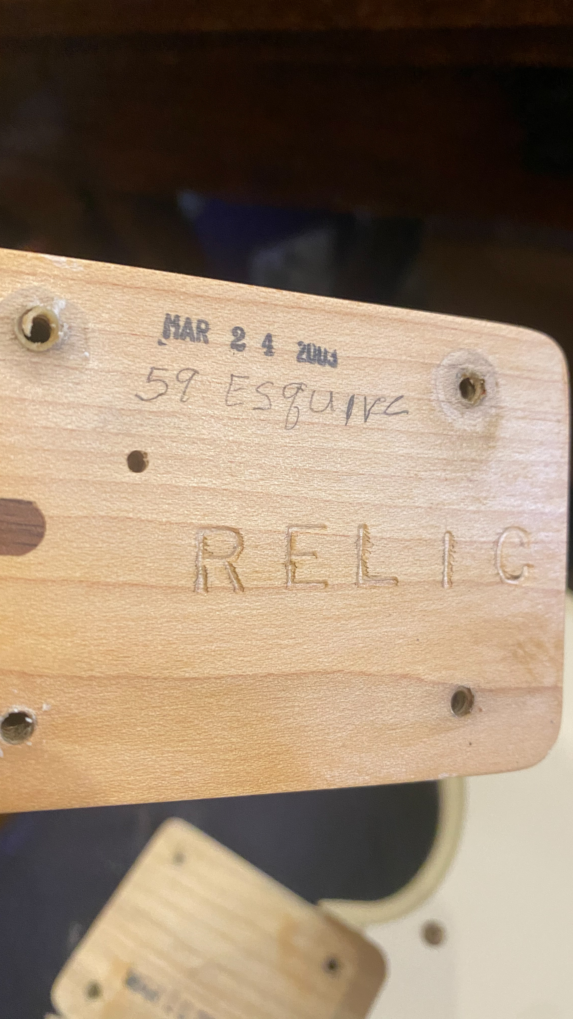 From Fender's Corona CA Custom Shop, this is a 2003 Fender '59 Esquire Relic in unplayed, one-owner condition. The ash body was finished in white Blonde with factory relic-job; stock hardware and electronics. The maple neck has a 1-9/16" width at nut, late 50s C profile, with 7.25" radius. The neck profile measures .8" at the first fret and .99" at the 12th. Guitar weighs 7.45 lbs. The neck is marked March 24, 2003, the body is marked March 16th, 2003 and the COA is dated April 3rd 2003 and signed by Alex Nichols the Custom Shop general manager at the time. Included in sale is original case with case candy, with COA inside.