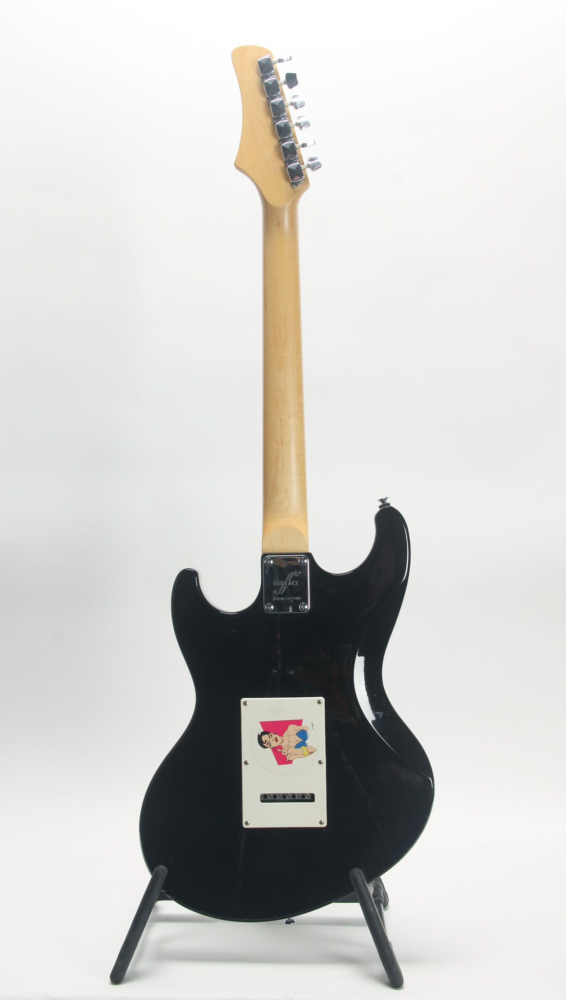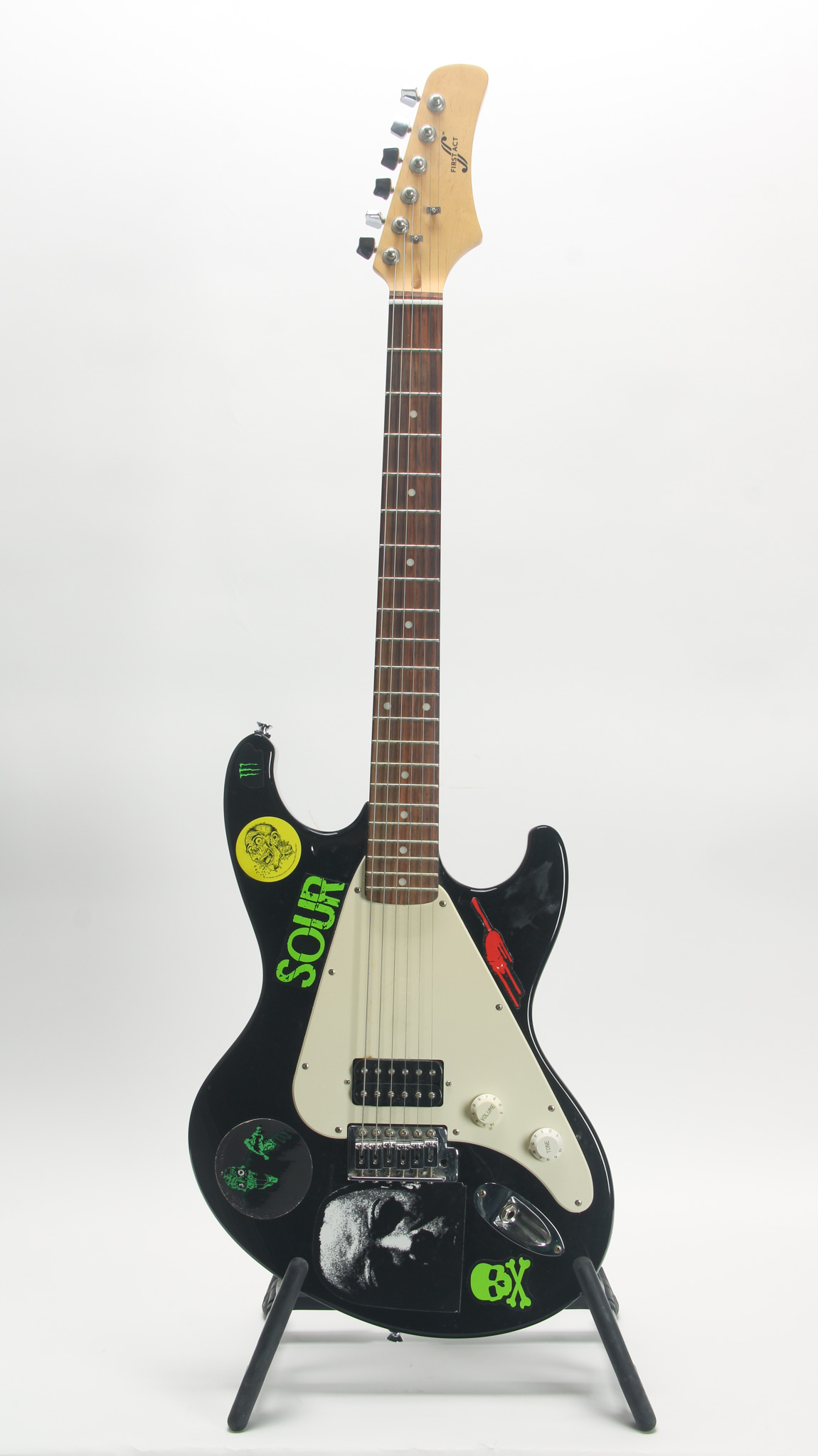 An electric guitar for those on a budget! First Act has made some surprisingly nice instruments in the last 10-20 years. Here is a beginner electric, sporting an eclectic mix of punk inspired stickers. Black finish, its in pretty good shape with some mild cosmetic wear, but nothing structurally of concern. A maple neck, this has a thick slab rosewood fingerboard (they don't build em like they used to!). The neck is nice and straight with clean frets, and easy low action. A single humbucker, it would be ideal for the music that it looks like it would be ideal for.