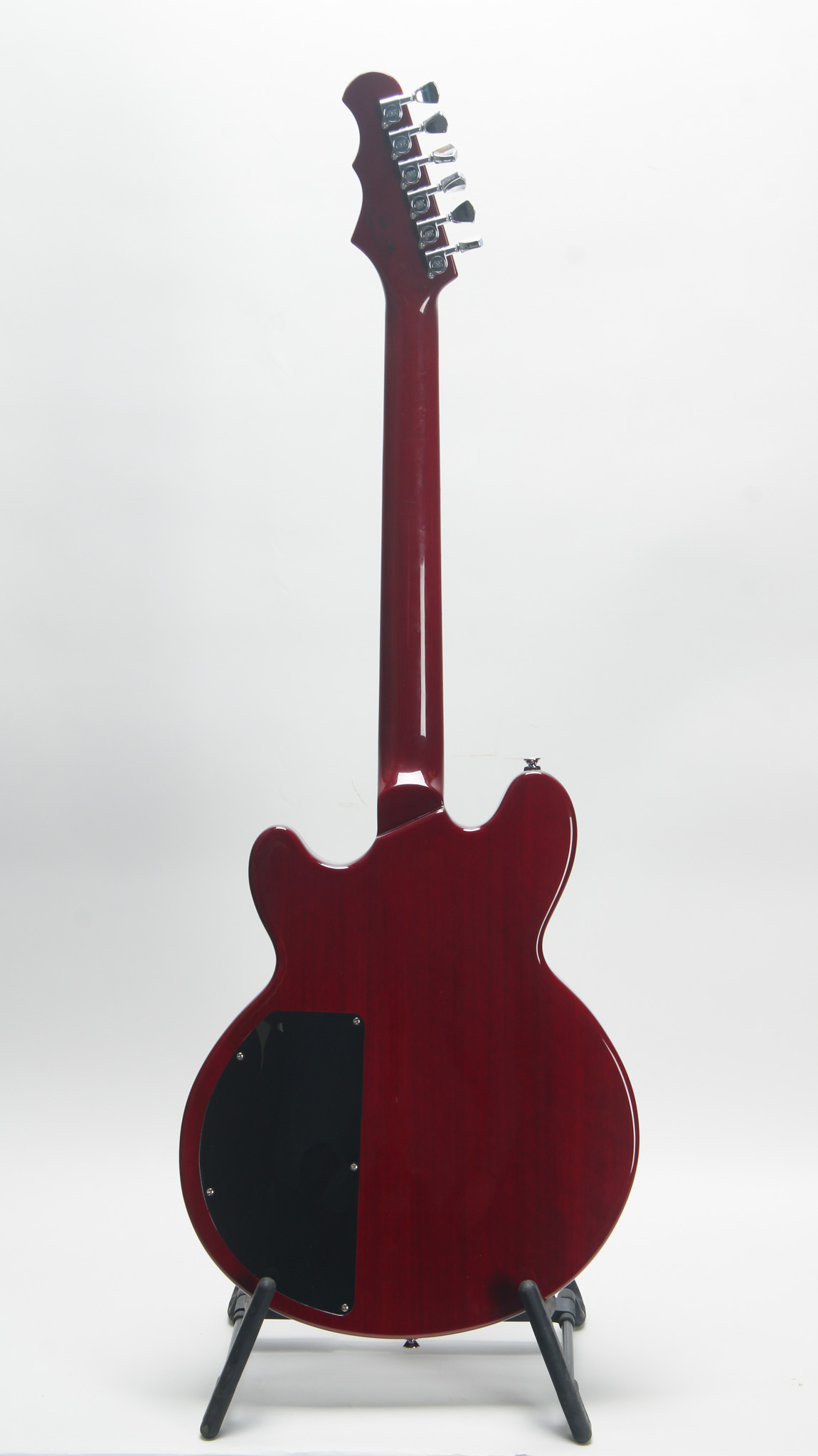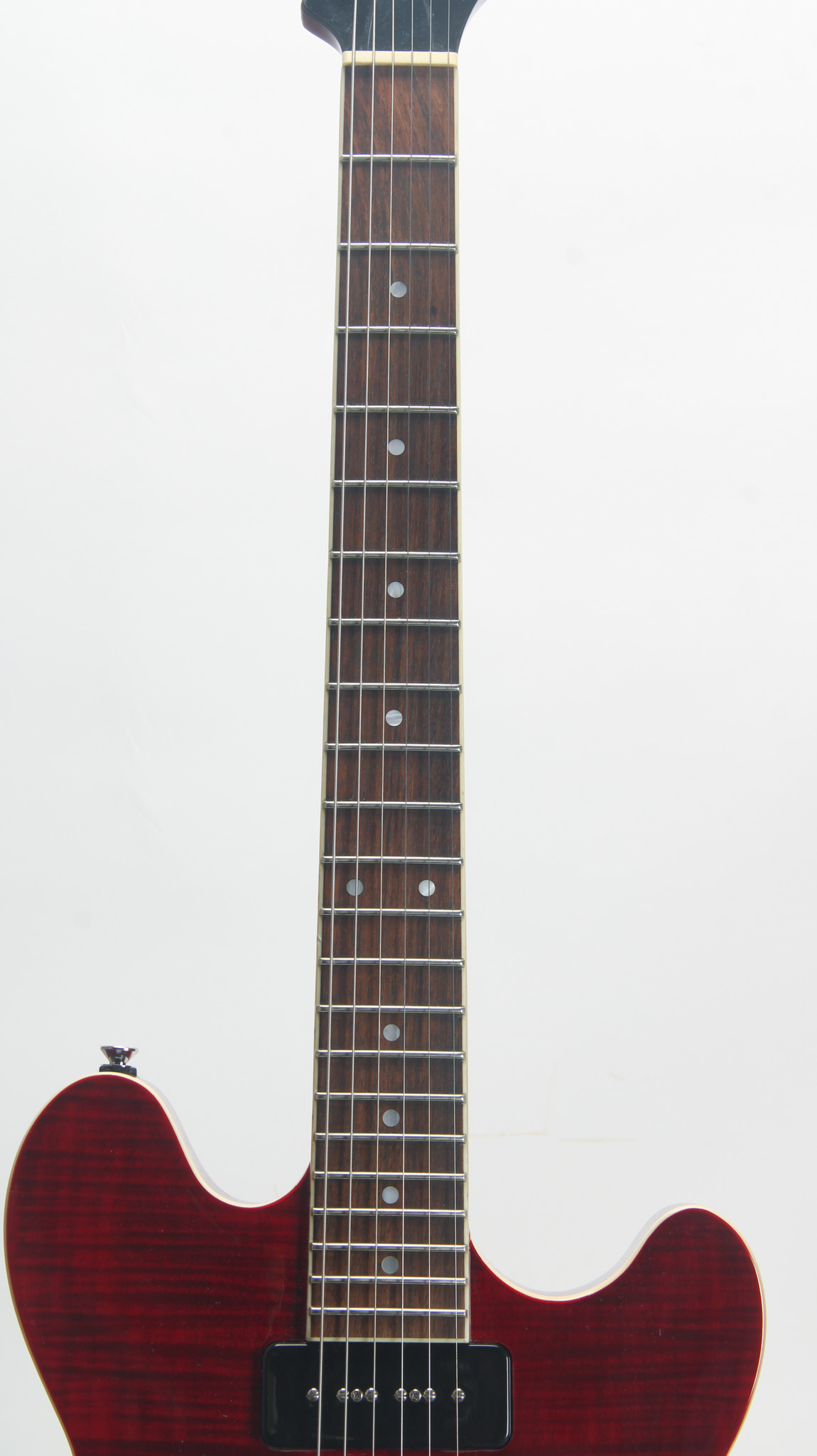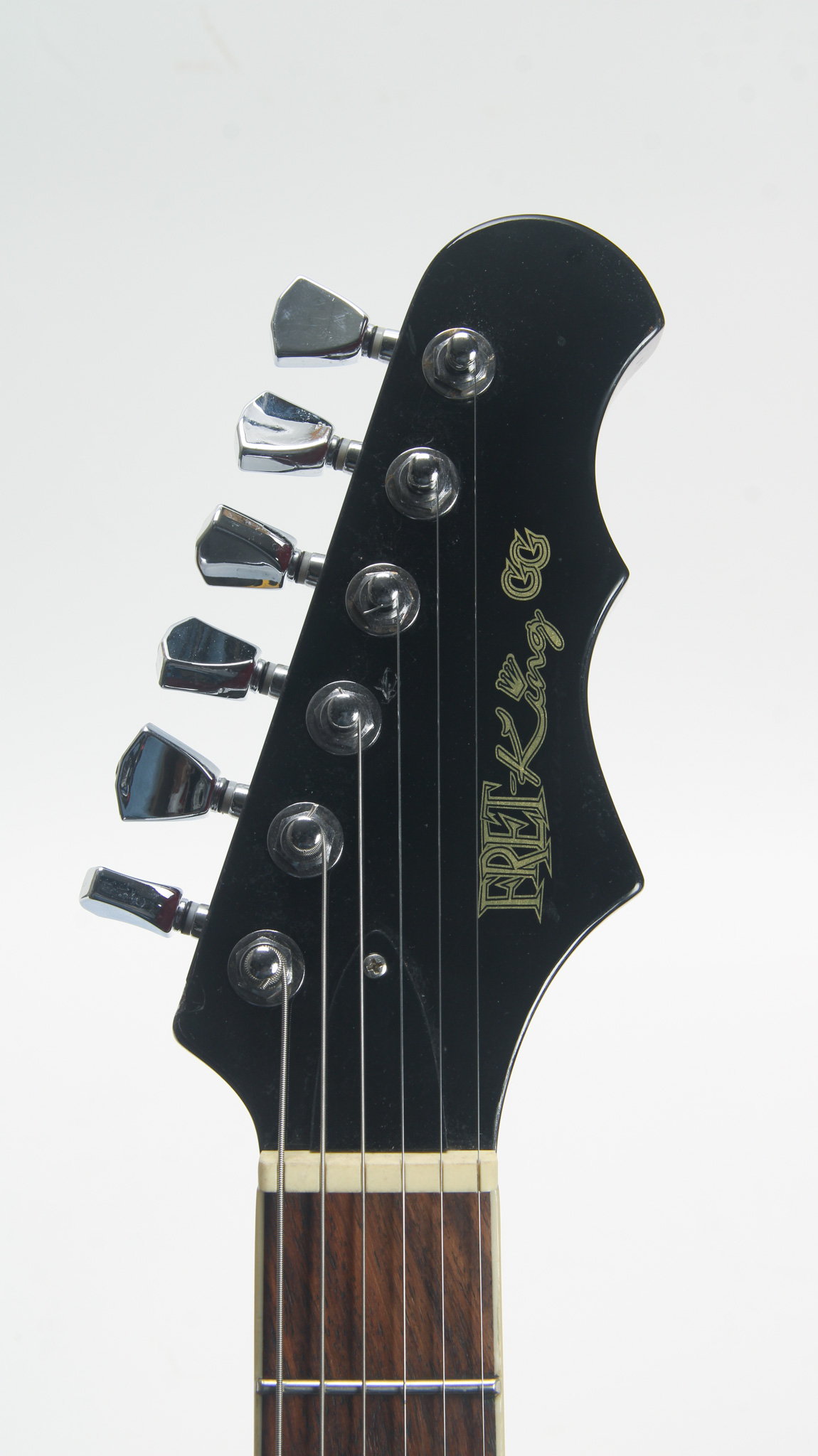 This Fret King Elise GG signature sports a slightly offset, semi hollow body design. Constructed with a flamed maple cap, and mahogany back. With all Wilkinson hardware, this guitar features a unique and advanced pickup system. The Wilkinson bridge is fitted with a piezo pickup, providing clarity, definition and near acoustic guitar like qualities. Coupling this with its neck P-90 and bridge humbucker - there is a wide variety of tones to be had, sensible for a player like Giltrap. The three lower controls are notched (+/-) EQ controls for the piezo circuit, with a mini toggle to engage the circuit. Master Volume and Tone reside above, with a volume control specifically for the piezo near the toggle switch.