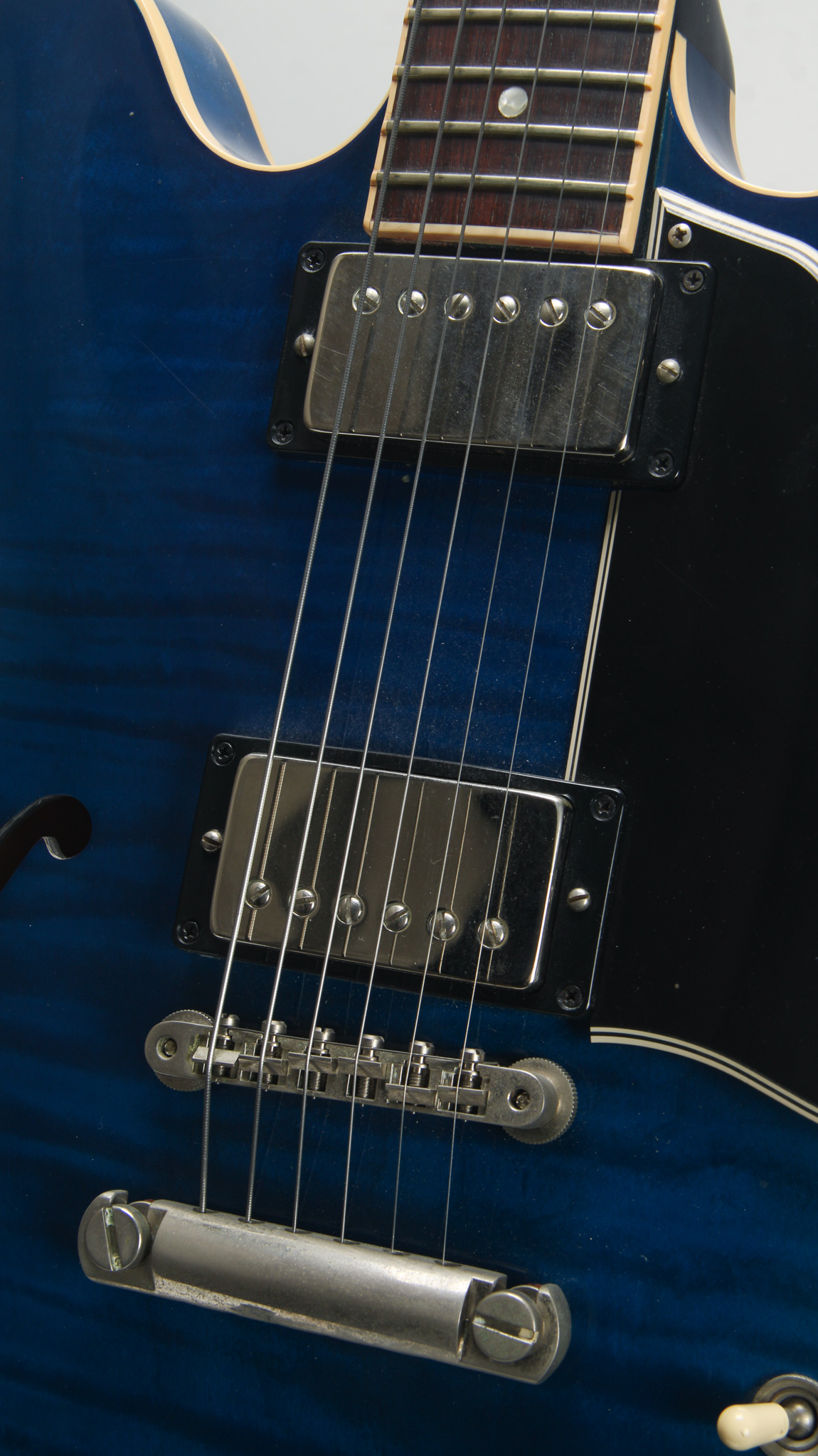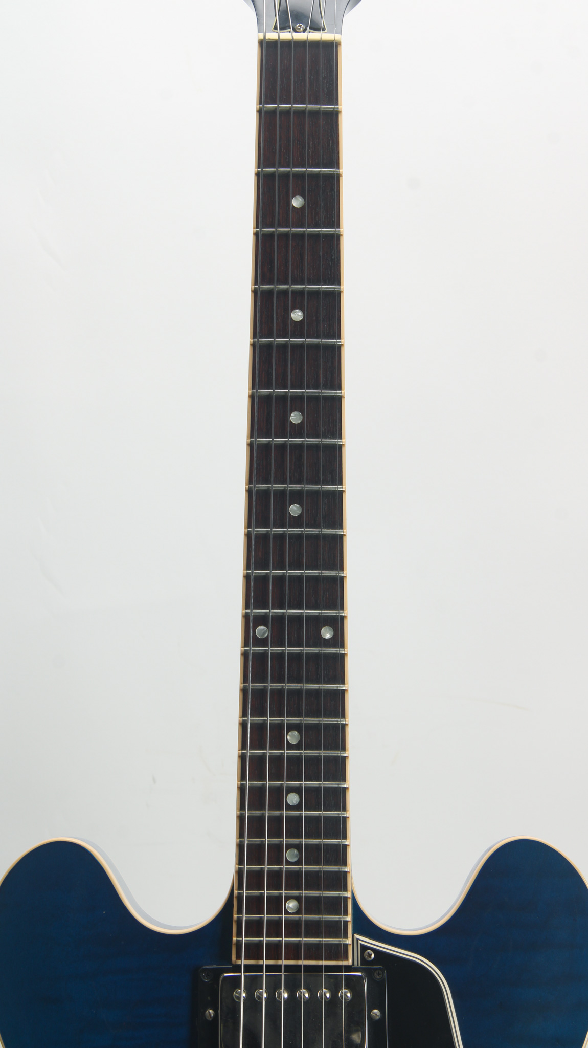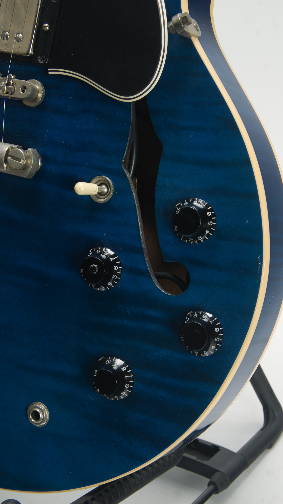 It's not often we get a guitar of this caliber in this color. This ES 335 in beautiful Beale Street Blue, plays as good as it looks. It has a nice flamed maple top and back that is accented by the blue finish. it's equipped with Bare Knuckles humbuckers configured with a 3 way selector and separate volume and tone for each. The hardware is aged nickel with grover tuners. The neck is a comfortable D shape with a profile measuring .80" at the first fret to .90" at the 12th. 24.5" scale length with a 1 11/16" nut width. The frets are in great condition with very little wear and the action is low measuring 4/64" at the 6th string at the 12th fret and 4/64" on the first string in the same position. There is a small notch on the neck on the bass side by the 4th fret and a few more smaller scratches as well. Otherwise the guitar is in very good condition. Currently set up with flat wound strings.