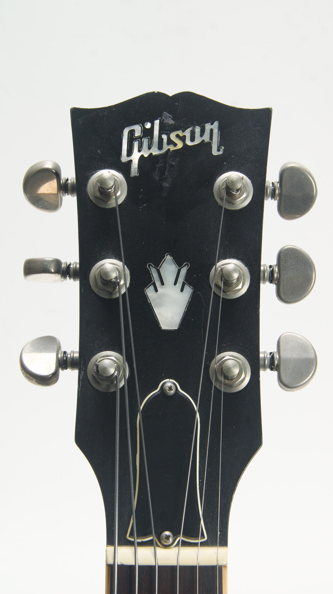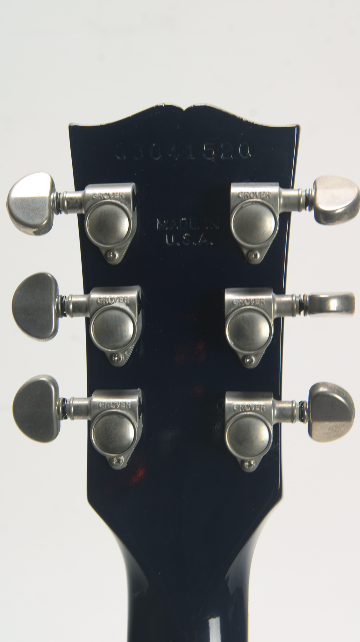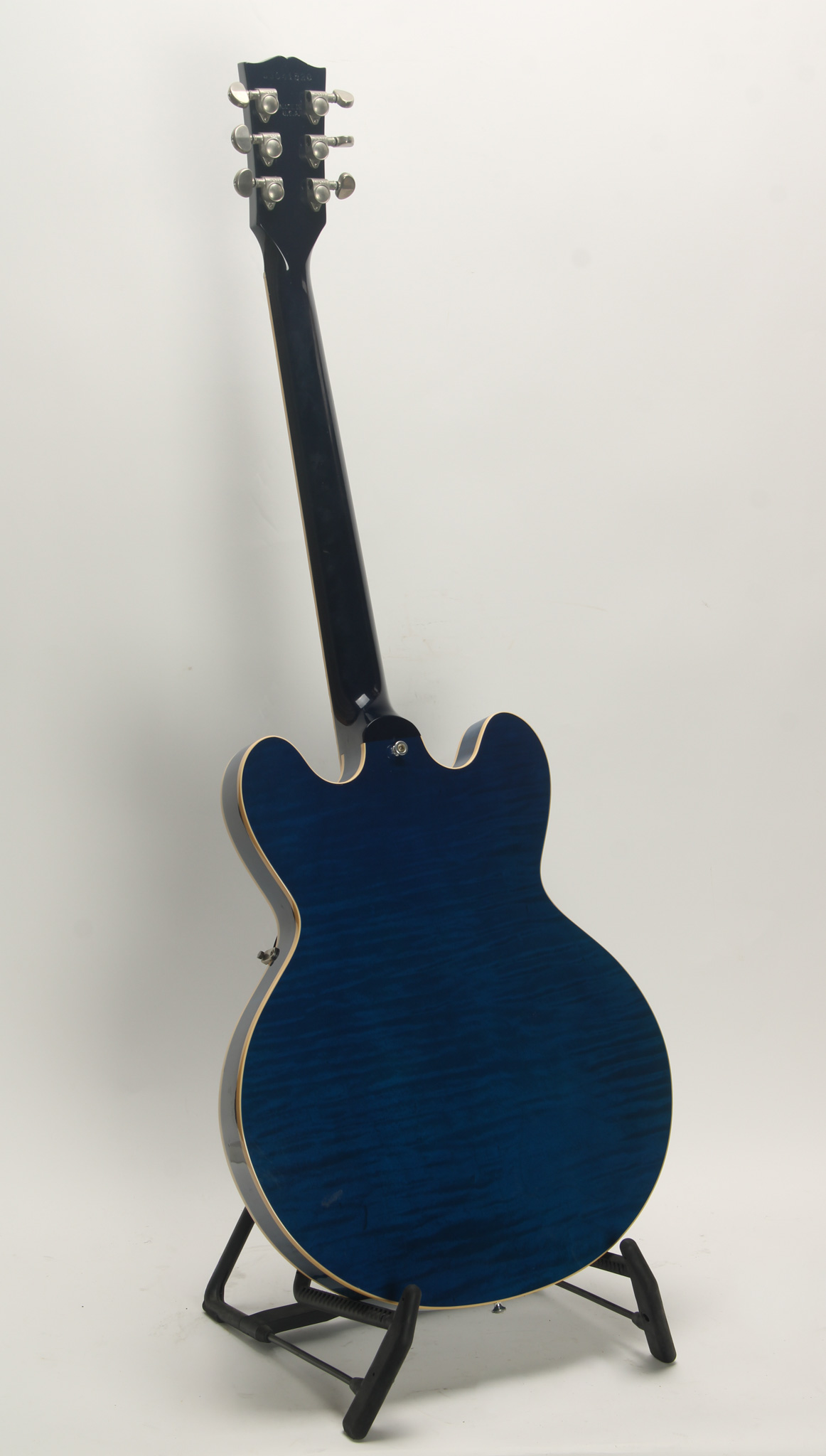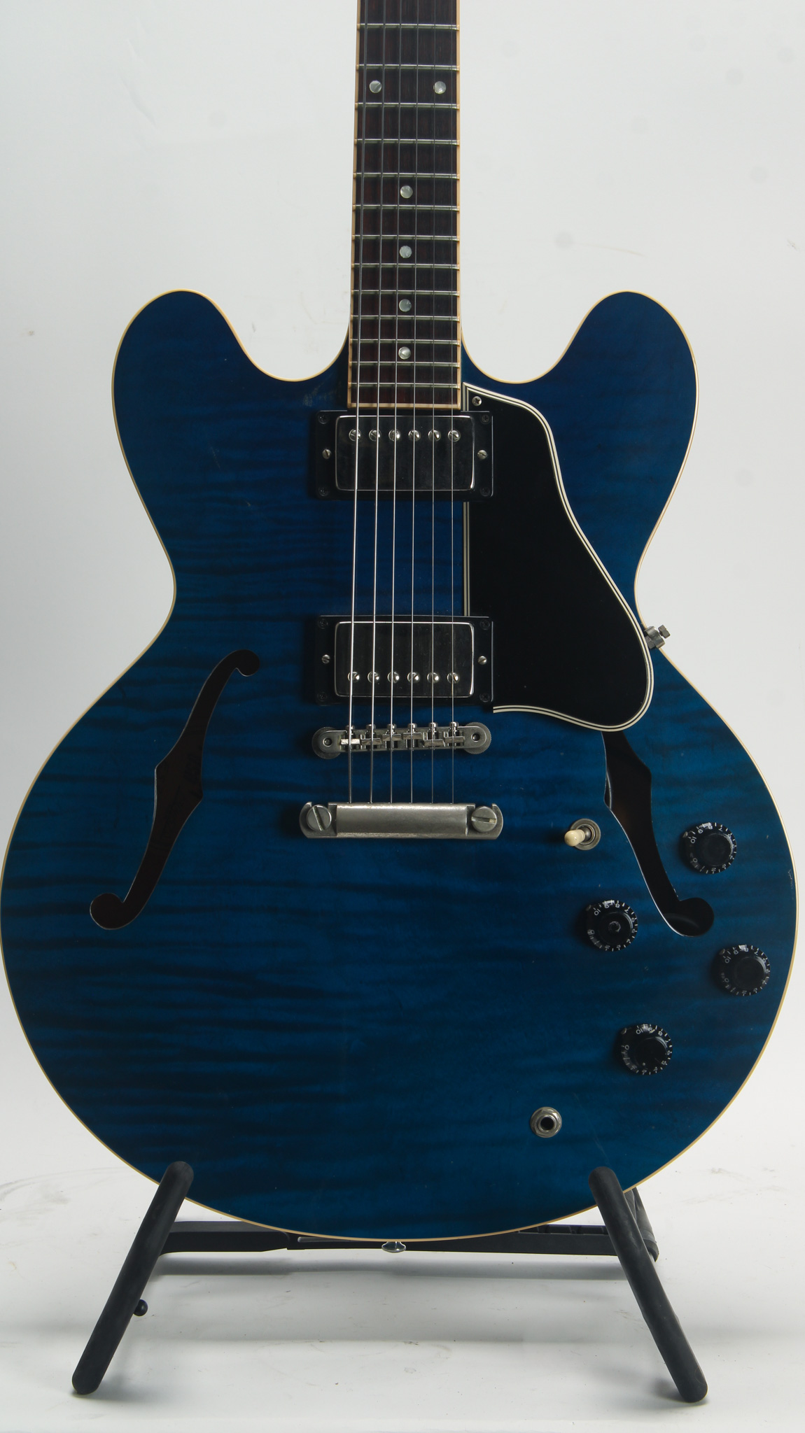 It's not often we get a guitar of this caliber in this color. This ES 335 in beautiful Beale Street Blue, plays as good as it looks. It has a nice flamed maple top and back that is accented by the blue finish. it's equipped with Bare Knuckles humbuckers configured with a 3 way selector and separate volume and tone for each. The hardware is aged nickel with grover tuners. The neck is a comfortable D shape with a profile measuring .80" at the first fret to .90" at the 12th. 24.5" scale length with a 1 11/16" nut width. The frets are in great condition with very little wear and the action is low measuring 4/64" at the 6th string at the 12th fret and 4/64" on the first string in the same position. There is a small notch on the neck on the bass side by the 4th fret and a few more smaller scratches as well. Otherwise the guitar is in very good condition. Currently set up with flat wound strings.